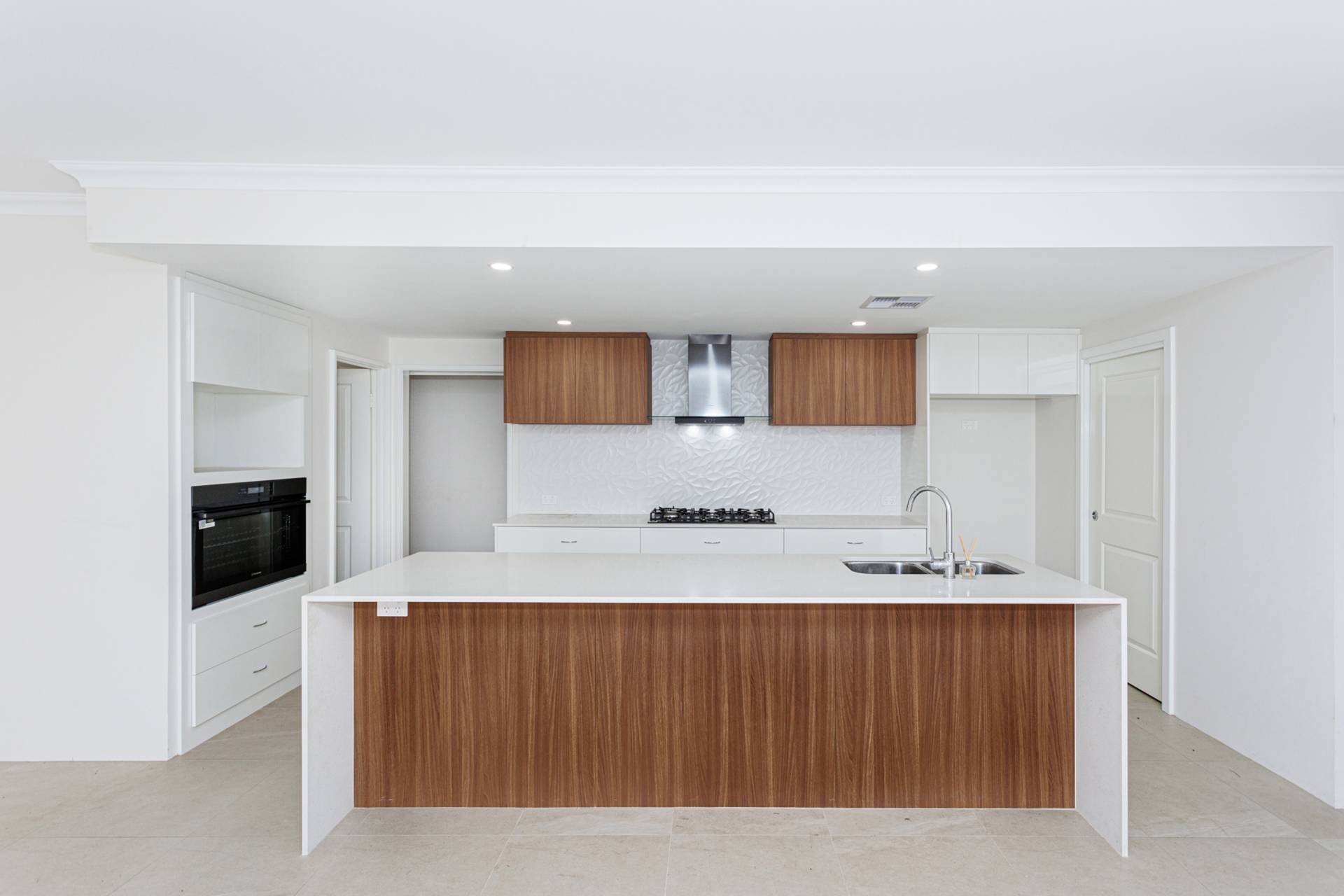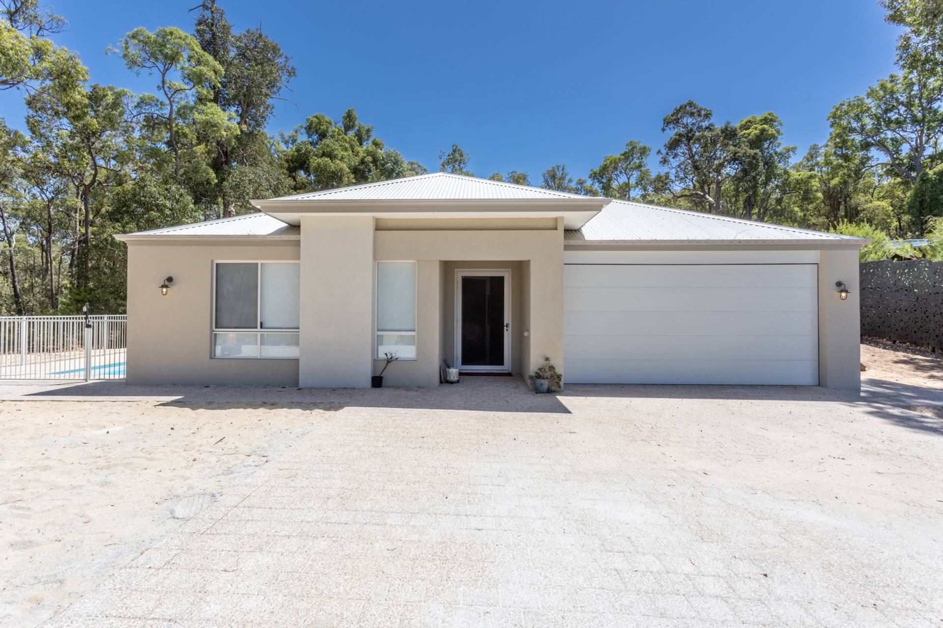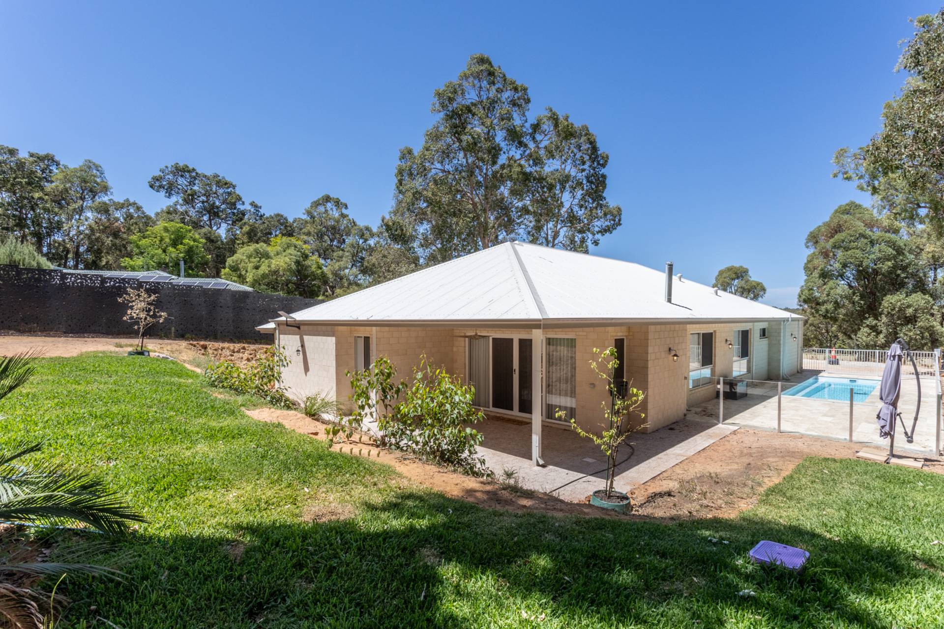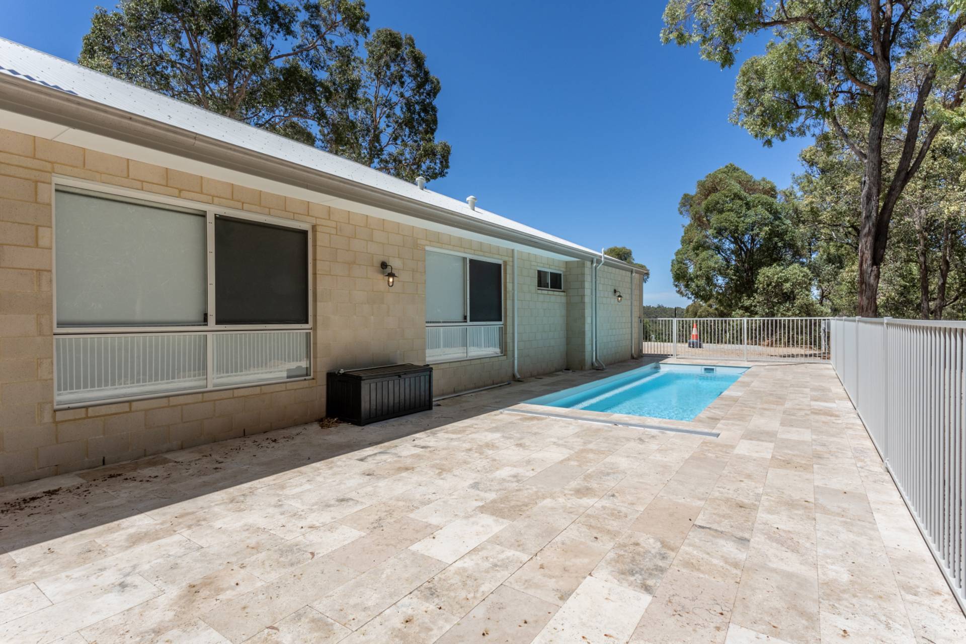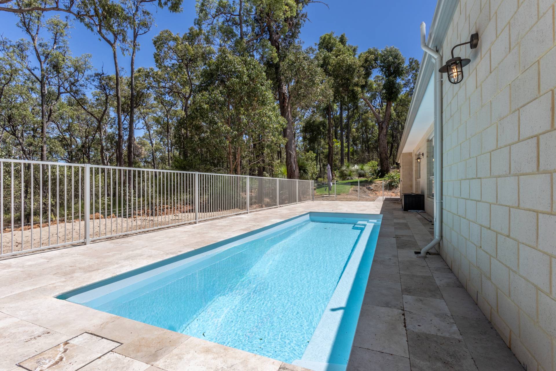 Outside, a fenced below-ground mineral pool awaits, set against a leafy bush backdrop and surrounded by Travertine stone paving. The expansive outdoor realm includes an alfresco under the main roof, an ideal venue for entertaining or simply for moments of quiet contemplation surrounded by nature.