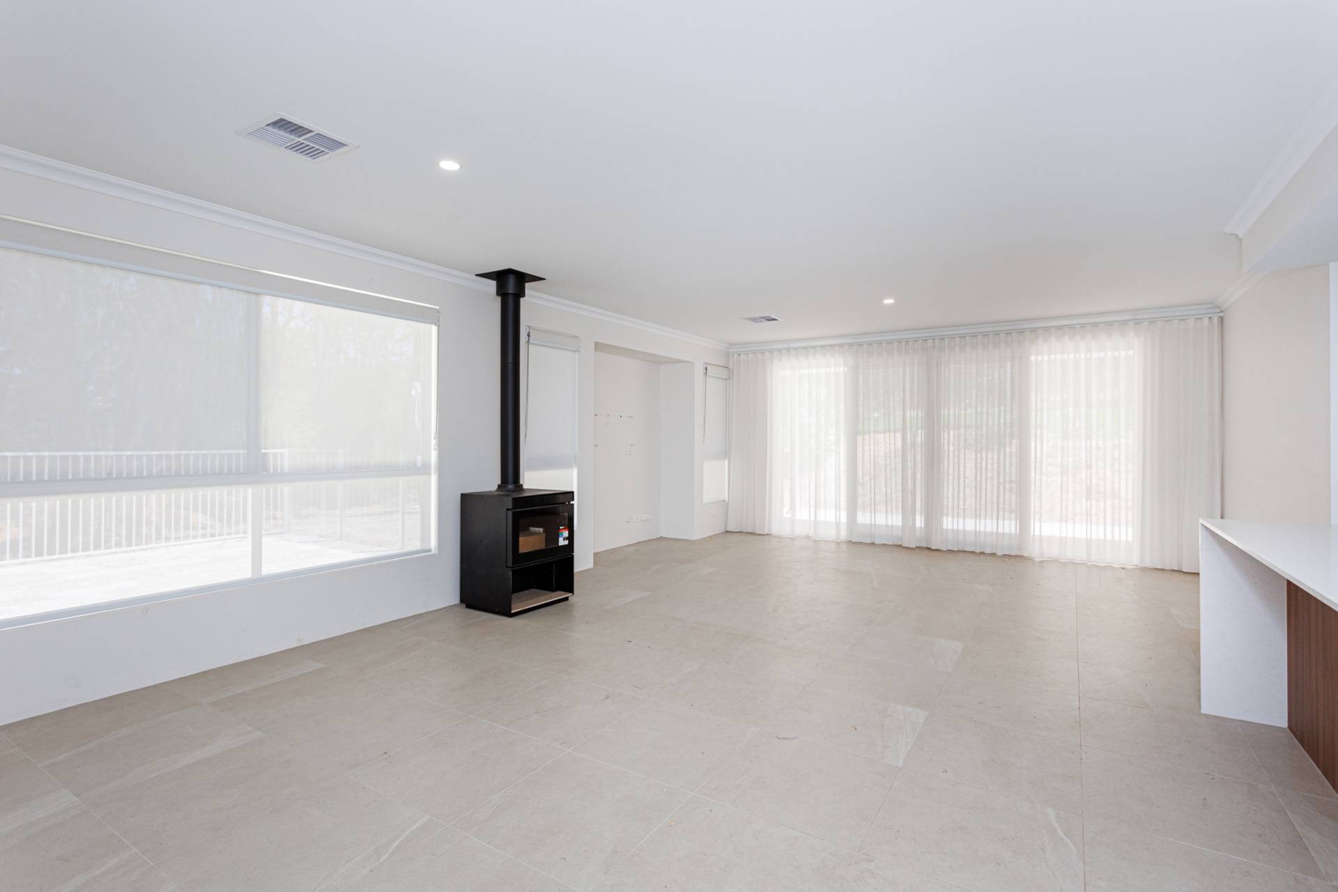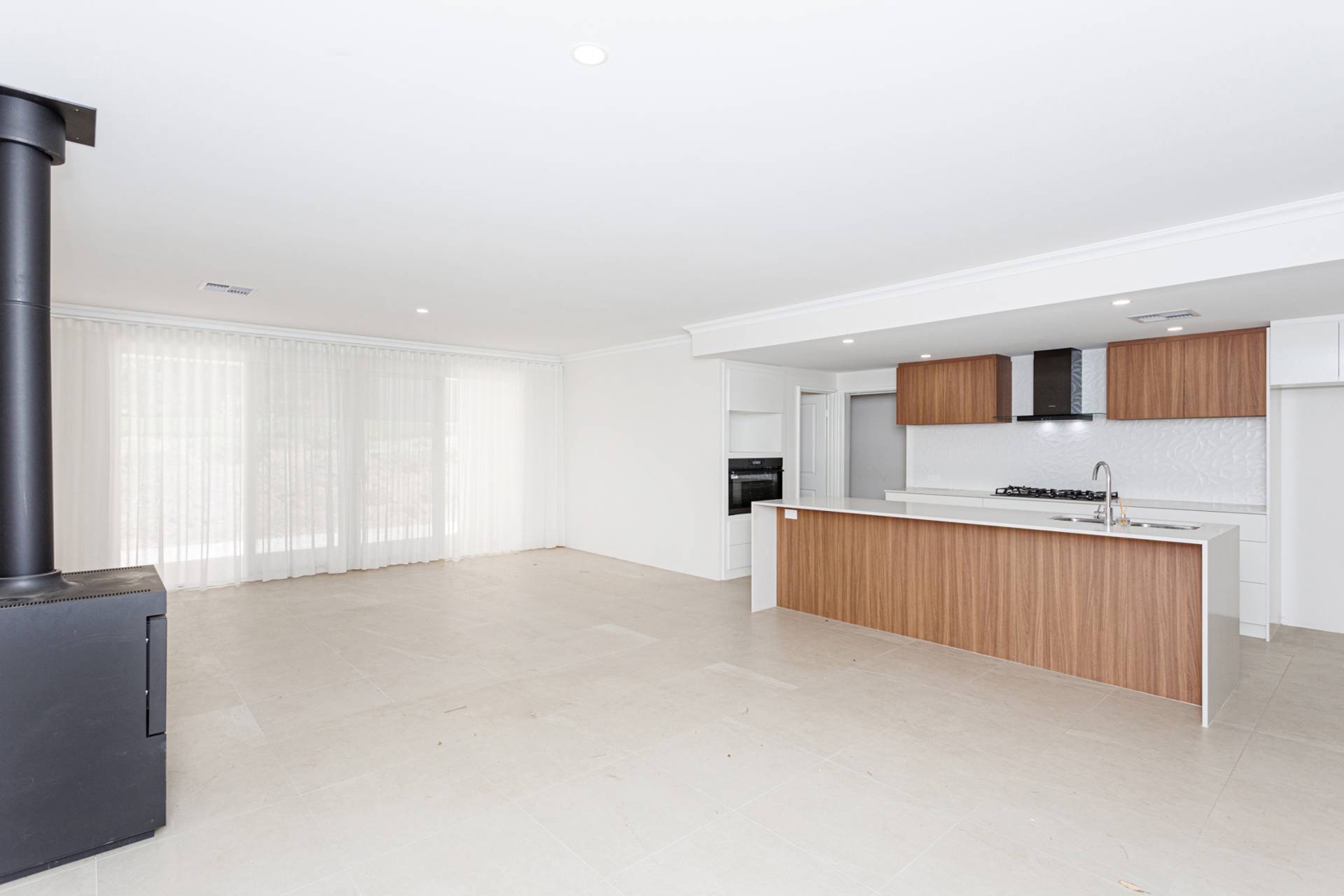 The heart of the home is the open-plan kitchen, living, and dining area, featuring a cosy wood burner for cooler evenings. The contemporary galley-style kitchen will be your culinary domain, showcasing a vast waterfall island bench, exquisite stone surfaces, 900mm black glass appliances, and a convenient butler's pantry and larder.