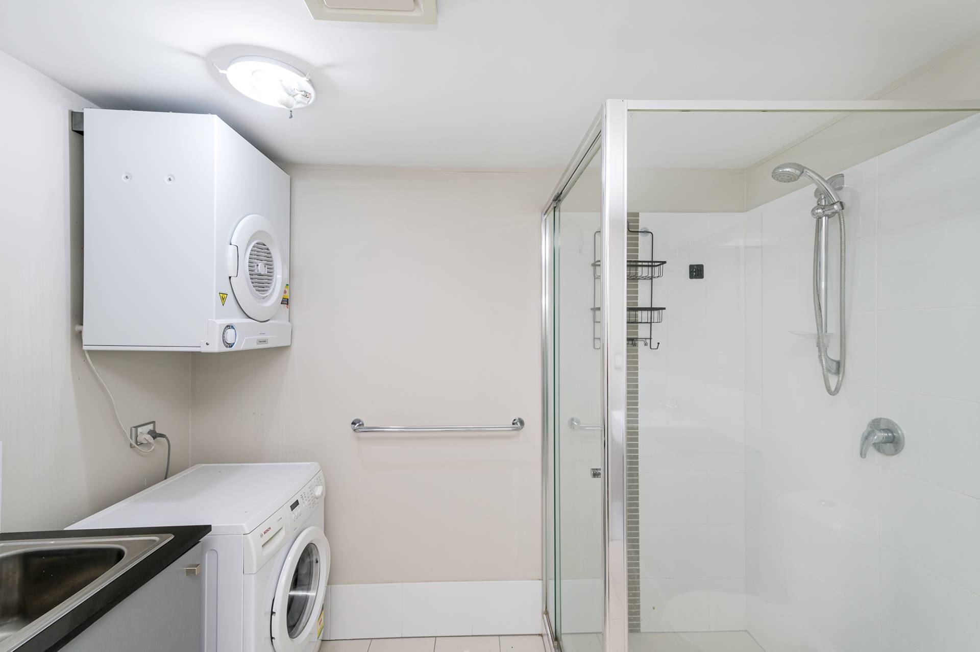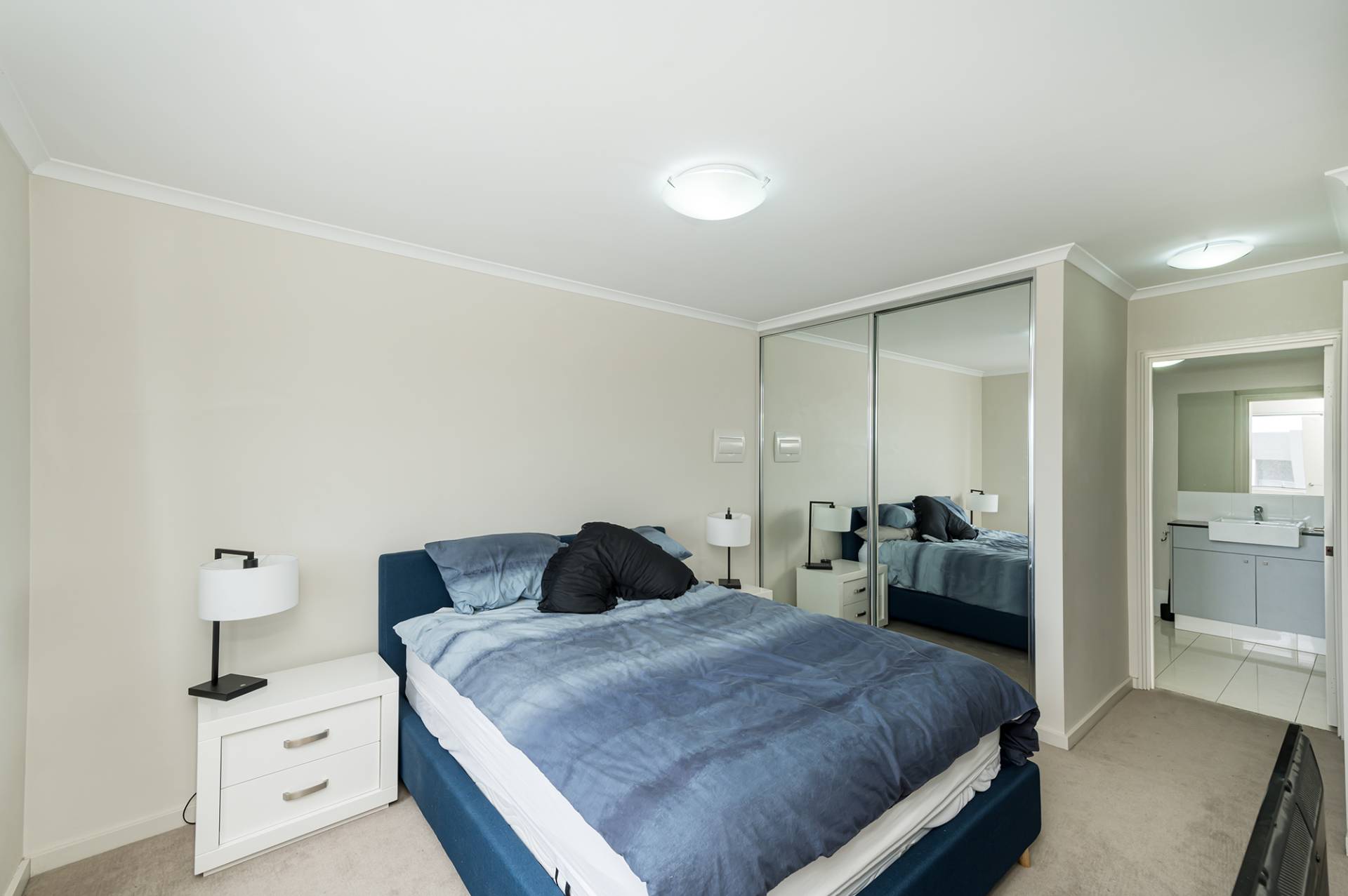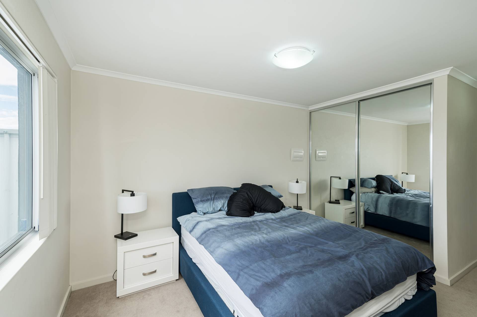 Large windows invite natural light to pour into the master bedroom, complete with blinds and a double mirrored robe. The bathroom is finished in neutral tones and features a framed shower, single vanity and basin, with room for a washer and dryer.