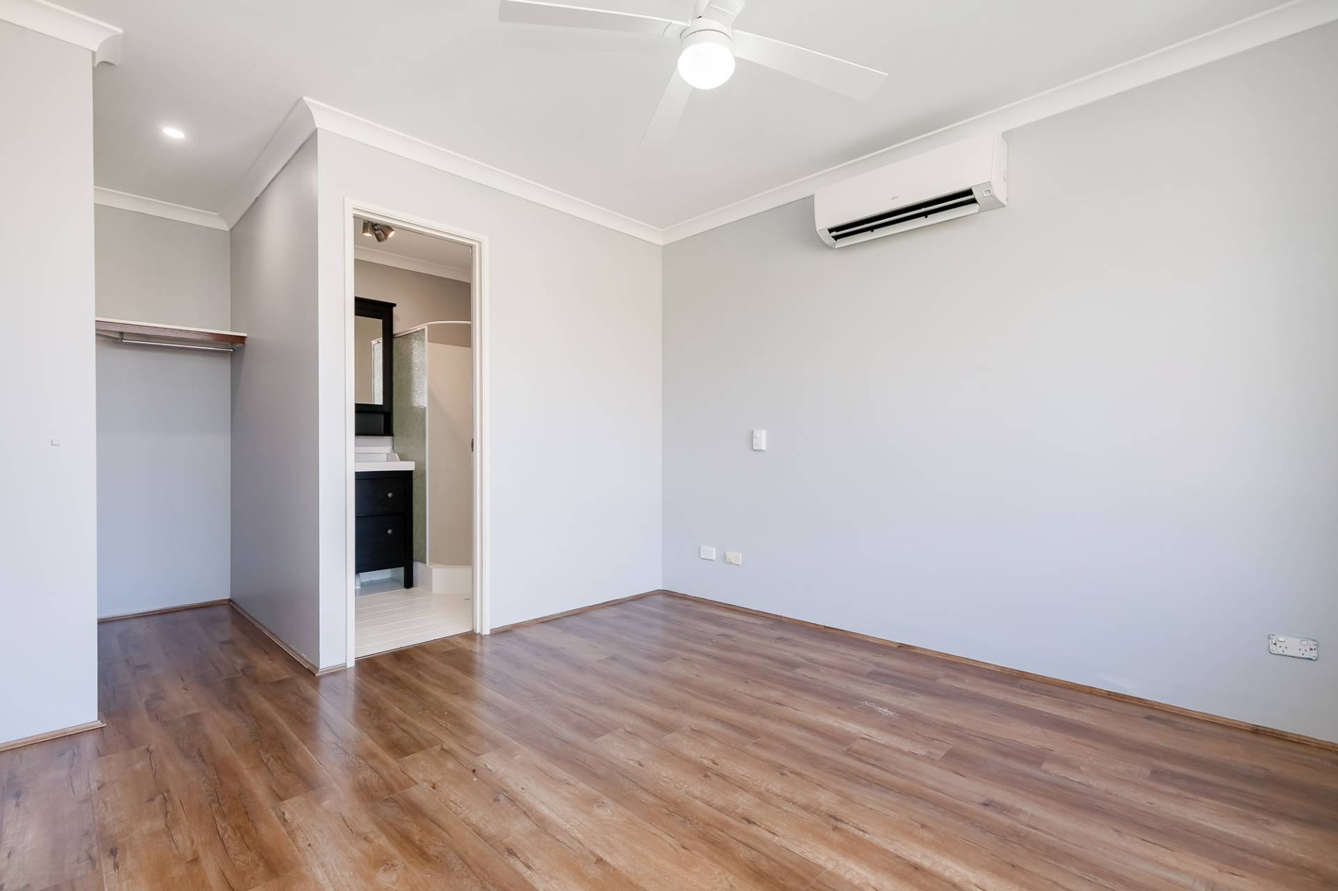 The master bedroom includes a walk-in robe, ceiling fan, reverse cycle air-conditioning unit, and ensuite bathroom.  The second bedroom has a built-in robe recess, and the second bathroom includes a shower, bath, and vanity.  The third and fourth bedrooms have built-in robe recesses.