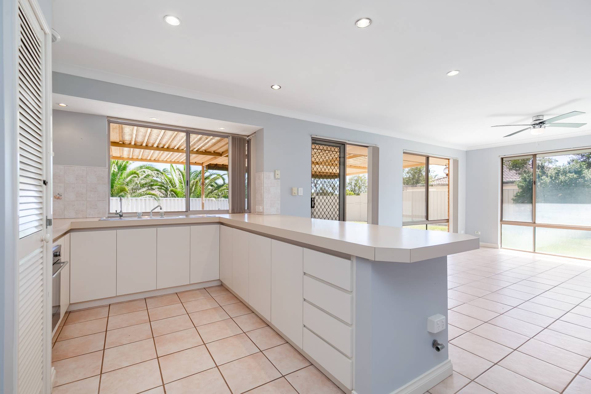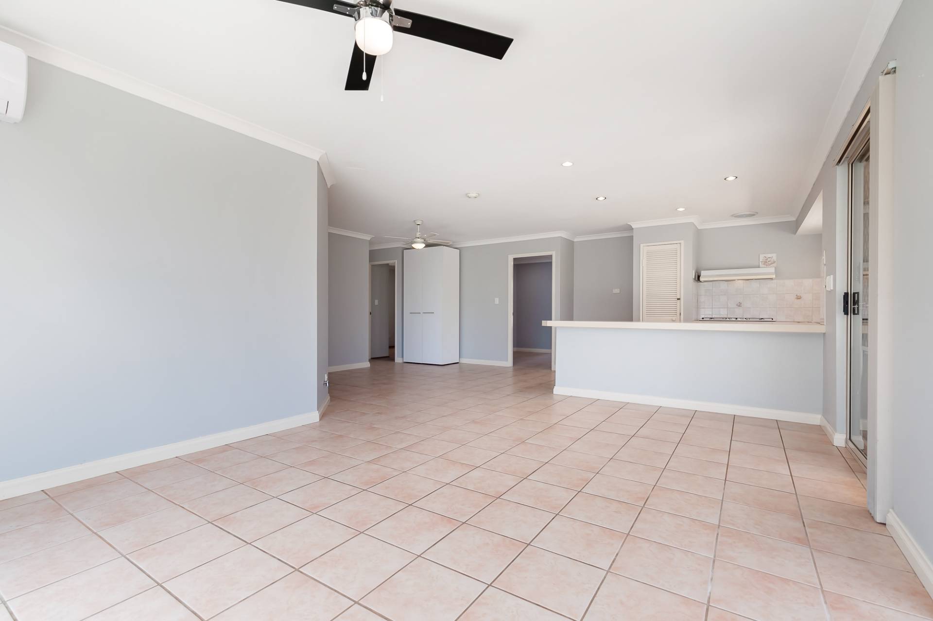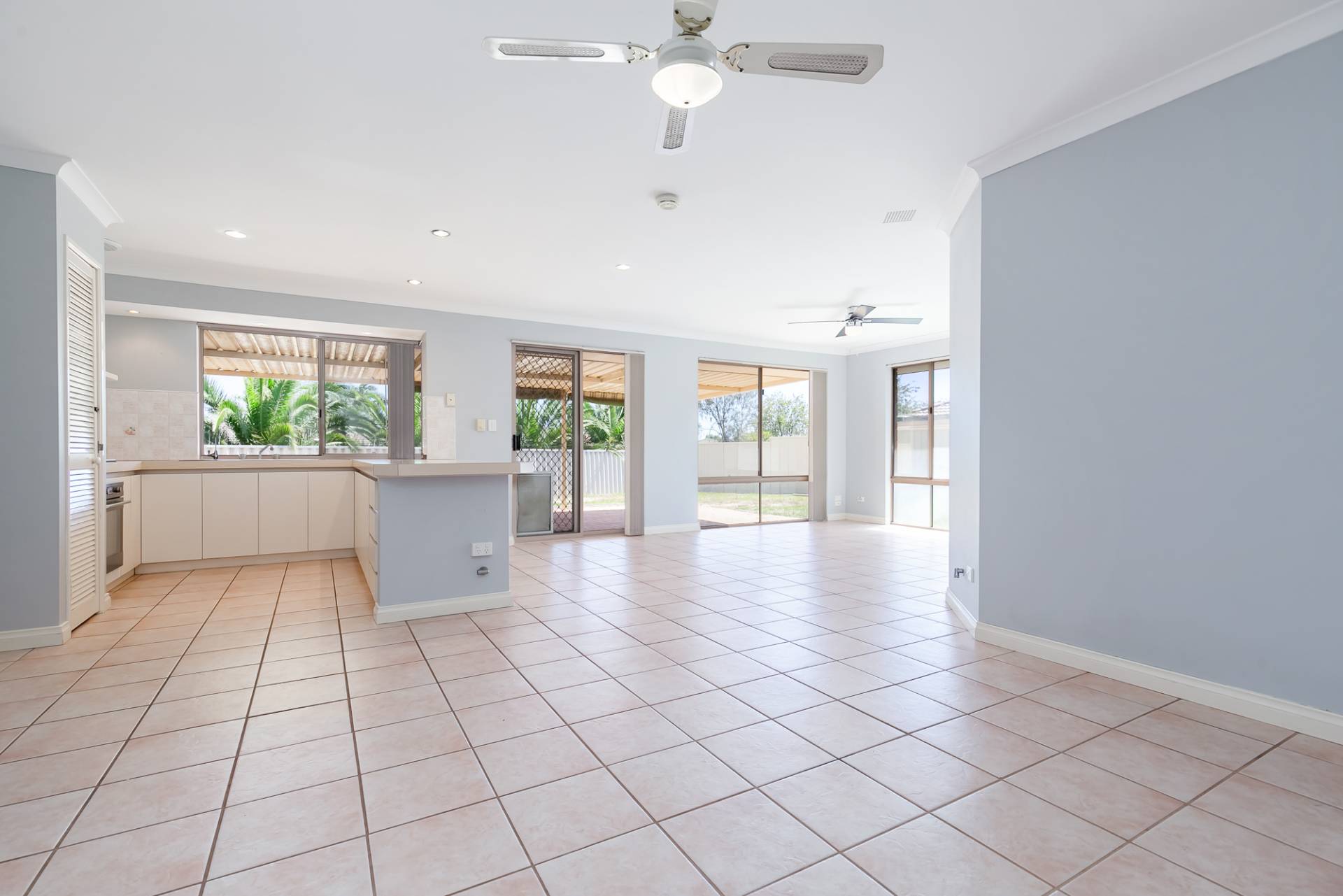 The open plan kitchen, family, and meals area boasts 2 ceiling fans, reverse cycle air-conditioning unit, TV, Foxtel, and 2 gas points.