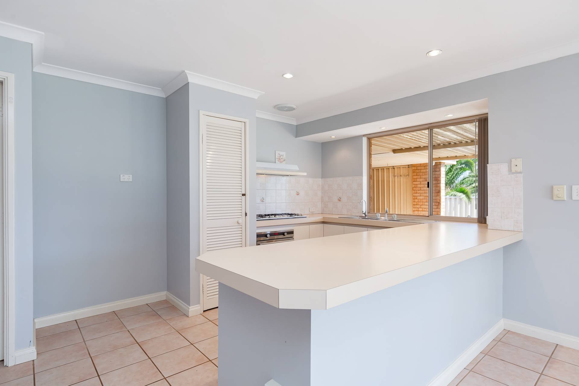 The kitchen is equipped with a double fridge recess, built-in pantry, rangehood over the gas cooktop, built-in oven, double stainless steel sink, breakfast bar, and ample storage and bench space.