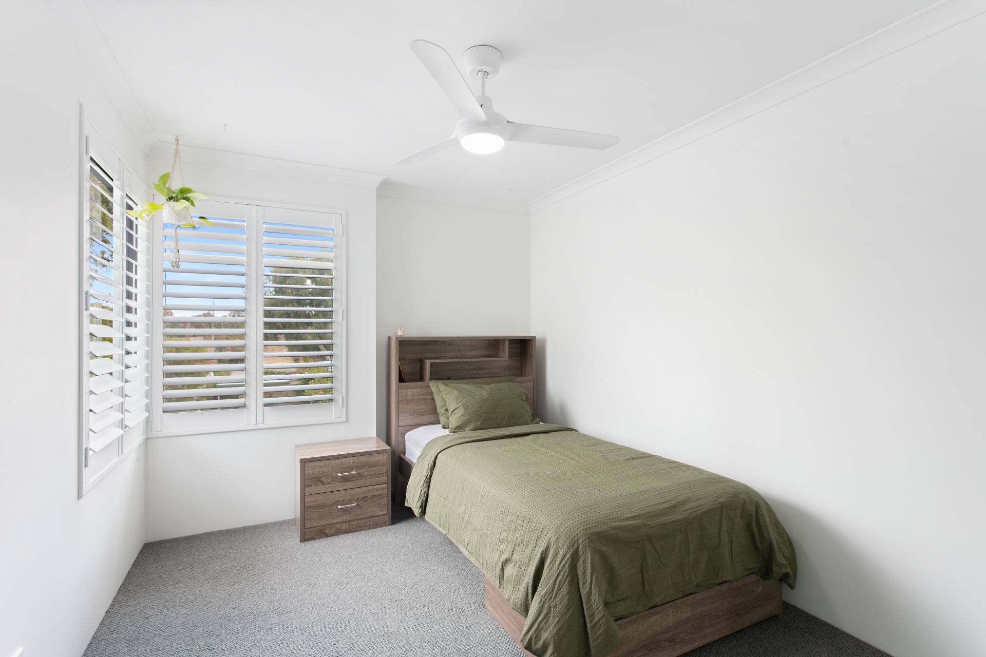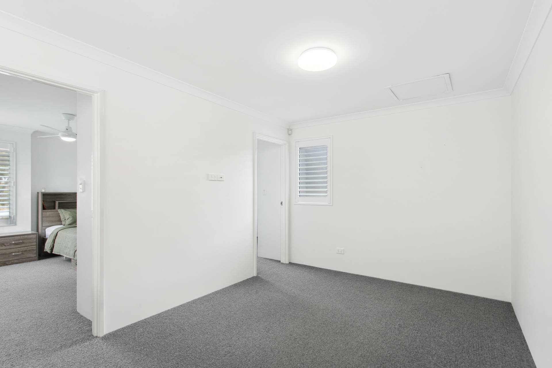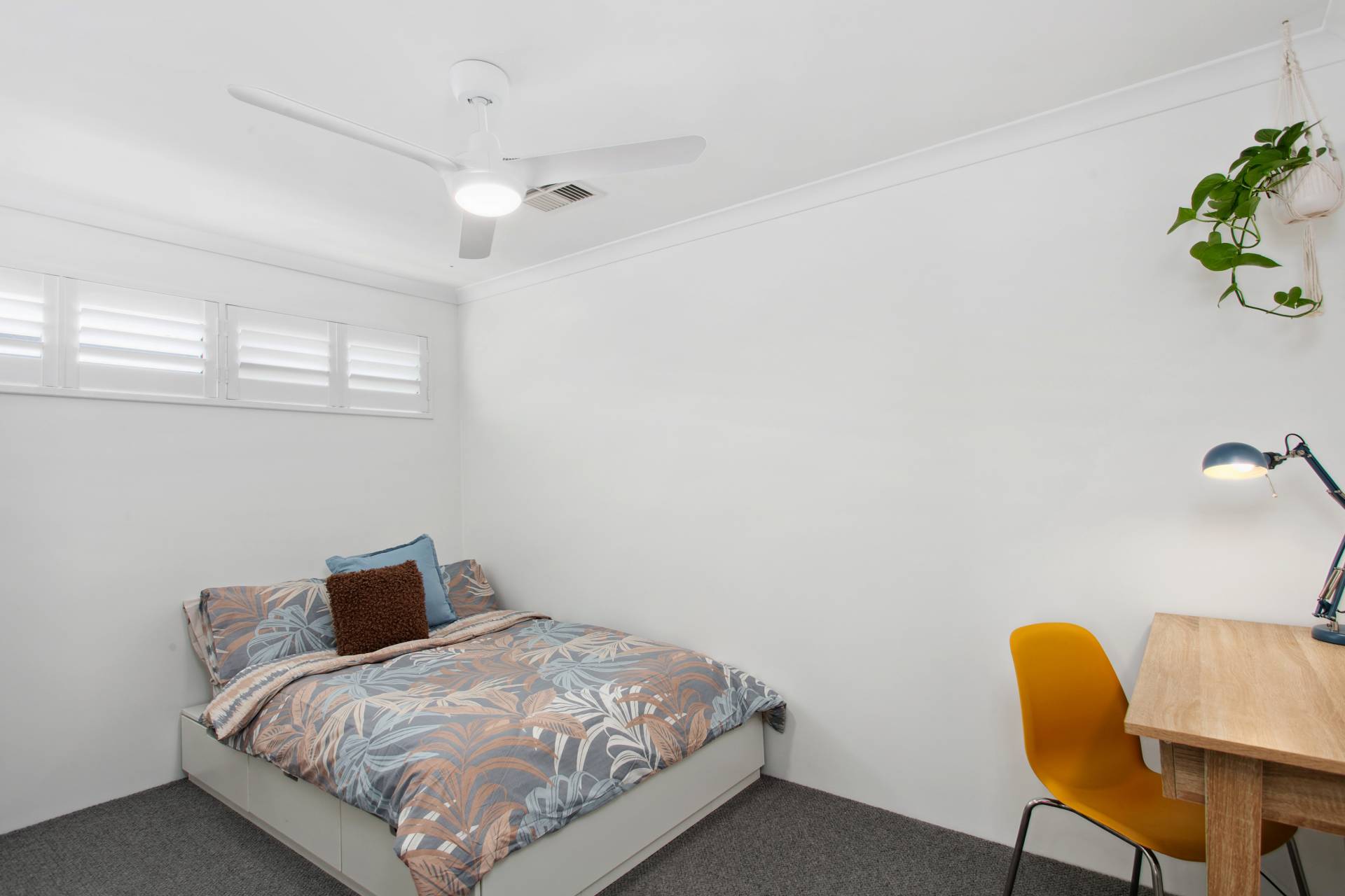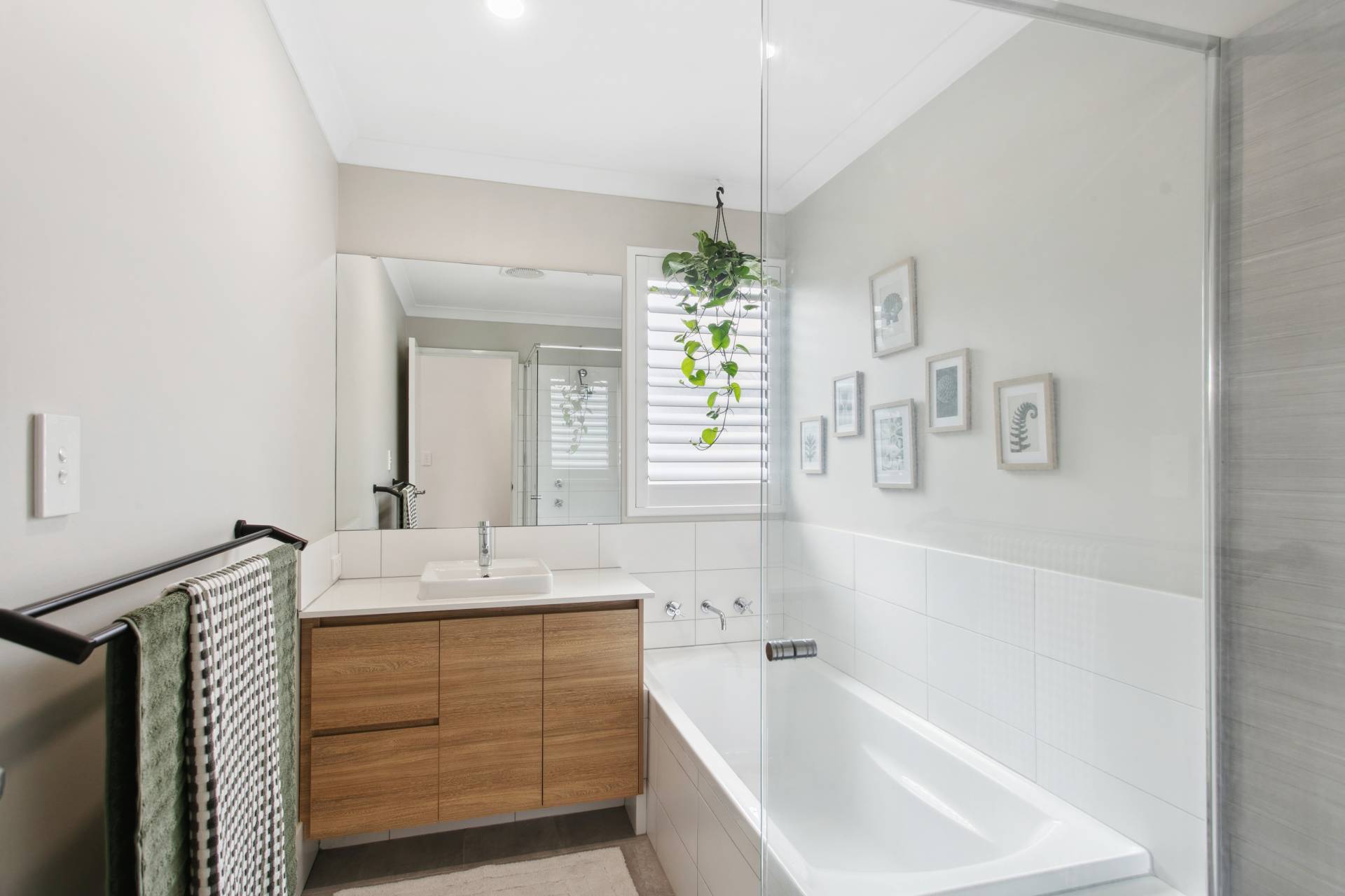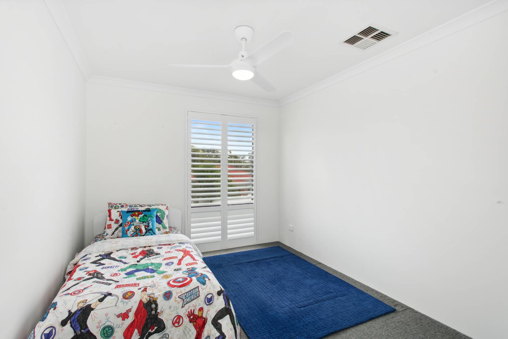 On the ground level, the main suite beckons with a generously sized walk-in robe and a private ensuite featuring a double floating vanity. Sliding doors seamlessly connect the interior to the rear gardens, creating a tranquil retreat. Ascend to the upper level, where three spacious bedrooms await, each fitted with built-in robes, plantation shutters, and ceiling fans. The thoughtfully appointed secondary bathroom includes a bath, catering to families of all ages and stages.