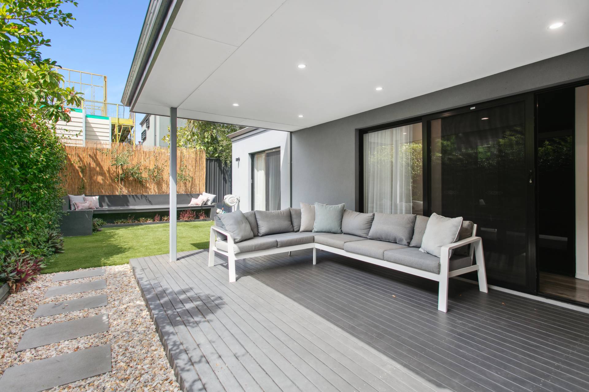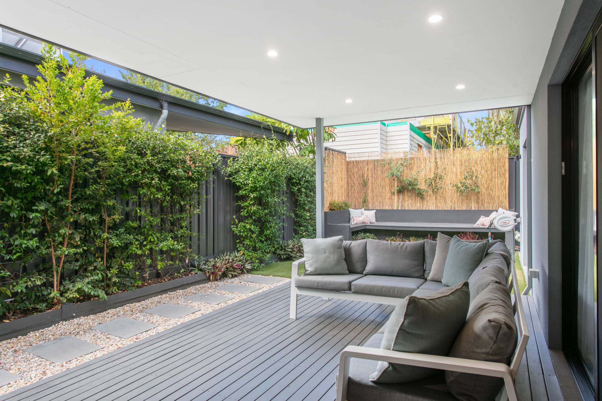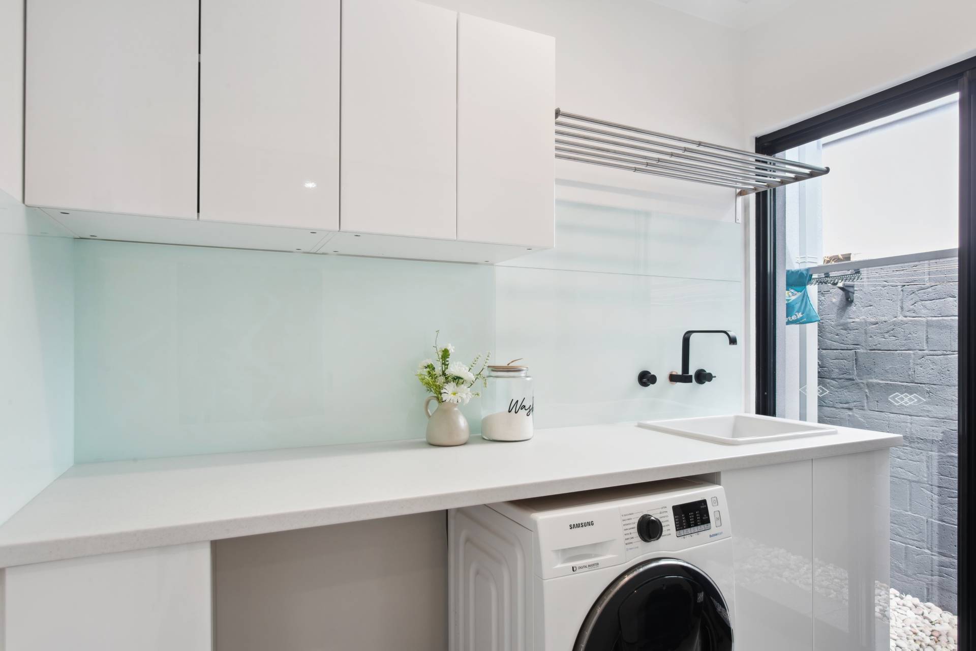 The heart of the home, the stunning kitchen, features stainless Bosch appliances, Smeg cooktop, a chic black Franke sink, a Carrara marble benchtop, and ample storage. The adjacent laundry, with its glass splashback and convenient wall-mounted washing line outside, adds to the home's overall functionality. Seamless integration between indoor and outdoor living spaces is achieved effortlessly as the exterior entertainment area unfolds with covered alfresco space and low-maintenance reticulated gardens, providing an ideal setting for relaxation and socialising.