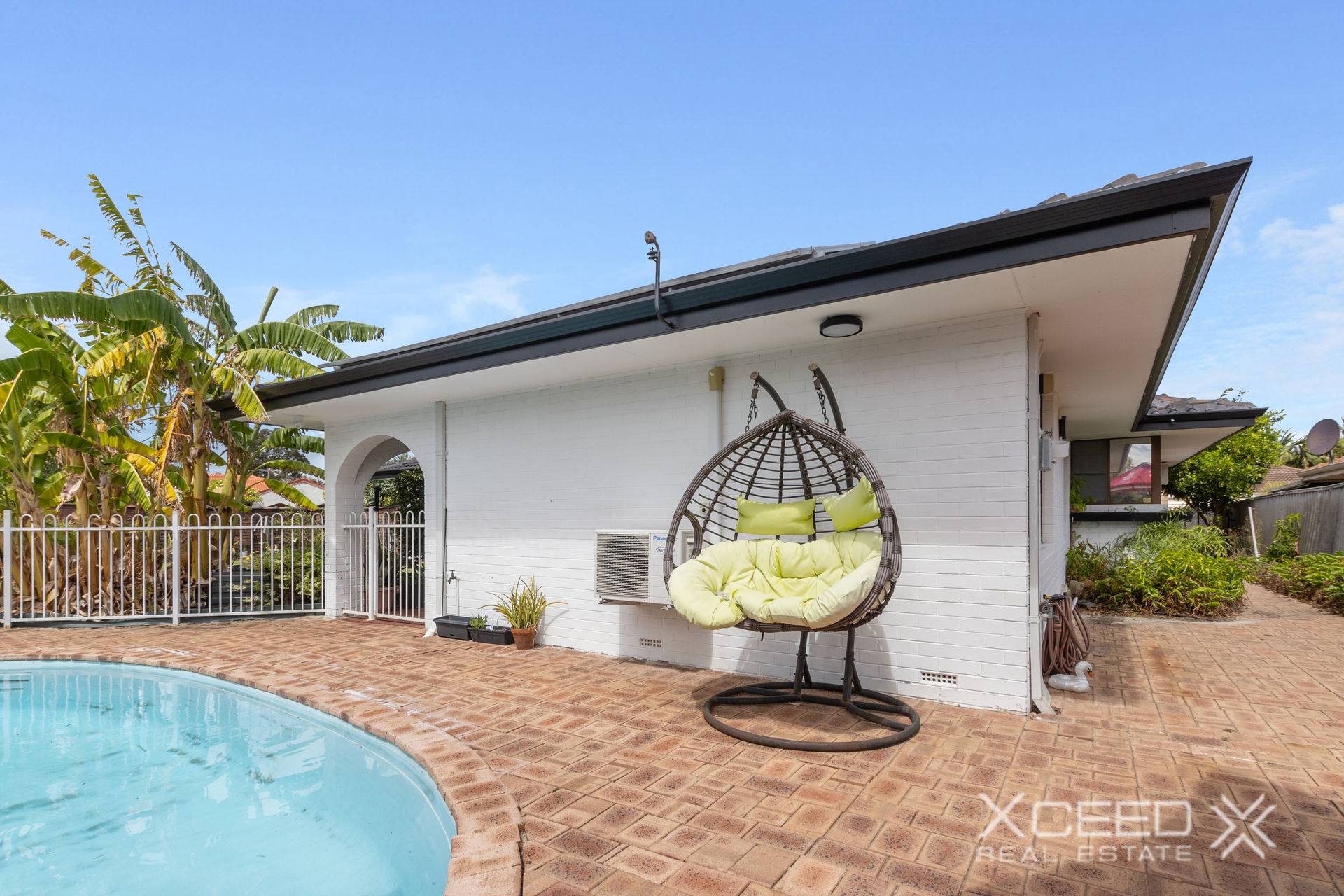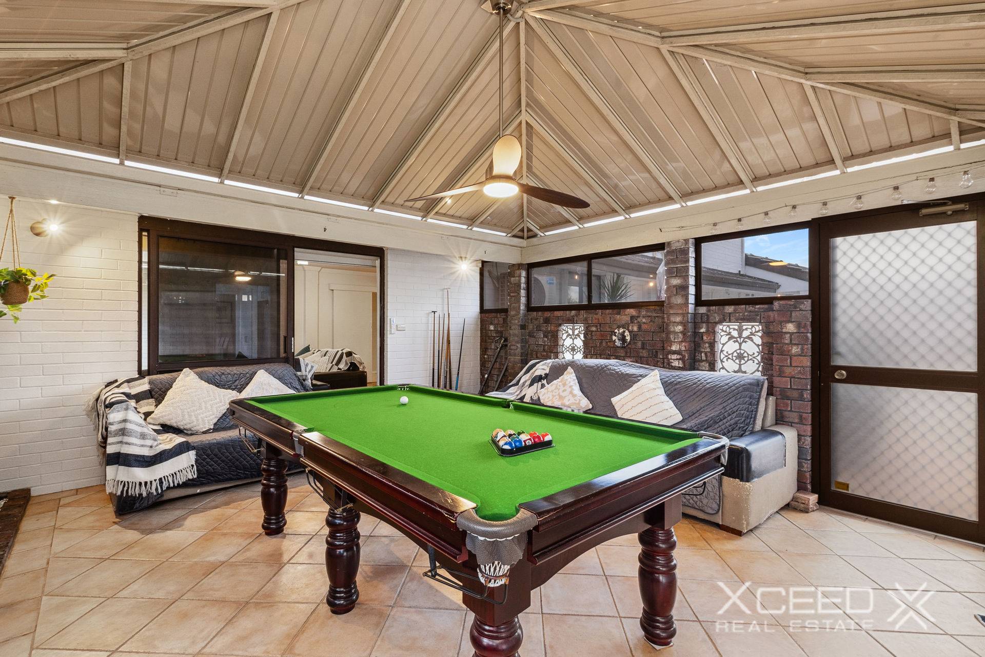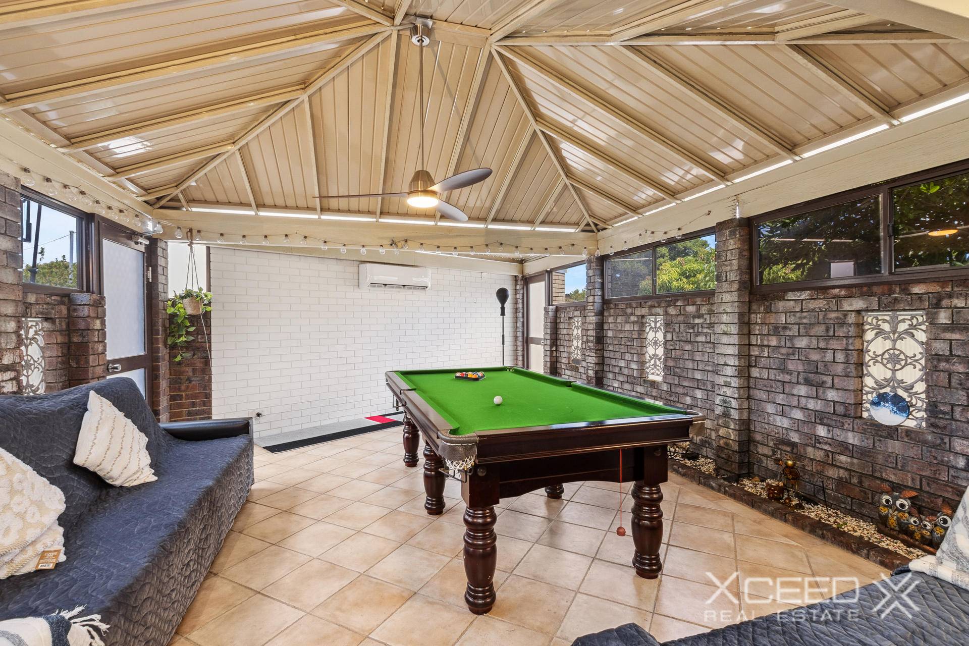 Large undercover alfresco area with pitched roof, split system air conditioning, and fan