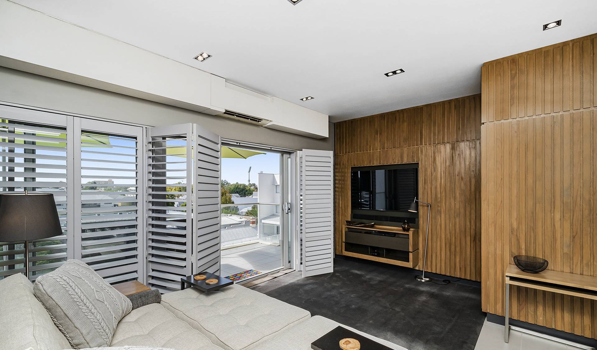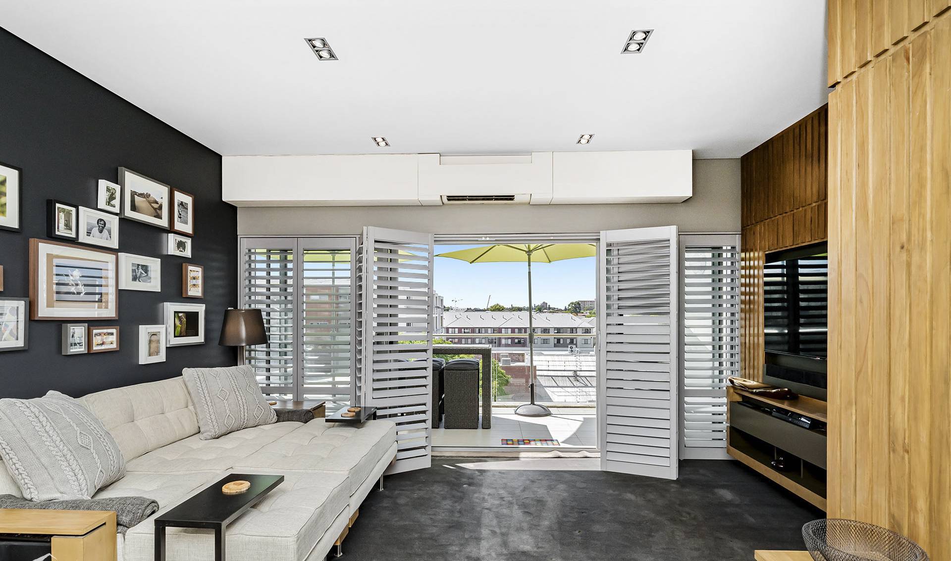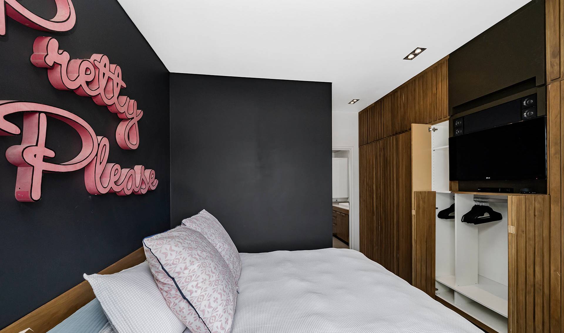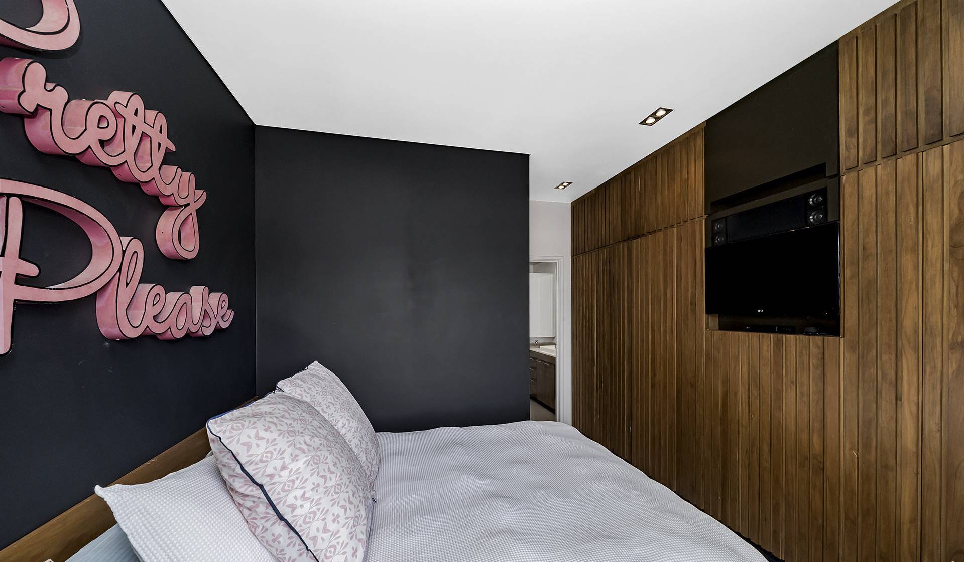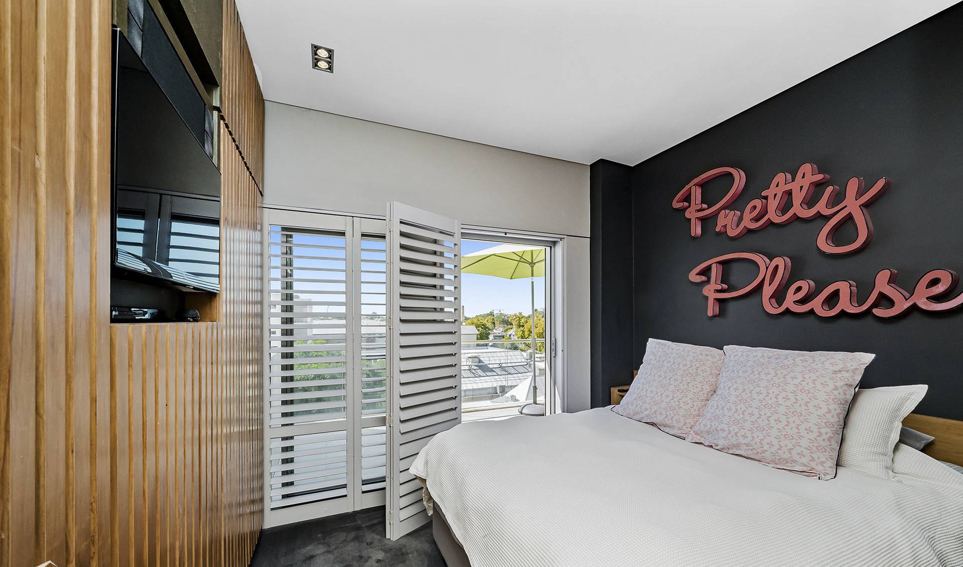 The bedroom is a cozy haven with feature floor-to-ceiling timber fretwork revealing wall-to-wall hanging sartorial hanging and shelving space. The industrial-styled, floor-to-ceiling plantation shutters continue in the bedroom, permitting dappled morning and afternoon light. The bedroom is also afforded a quality sliding glass and flyscreen door to access the expansive eight-metre long balcony.