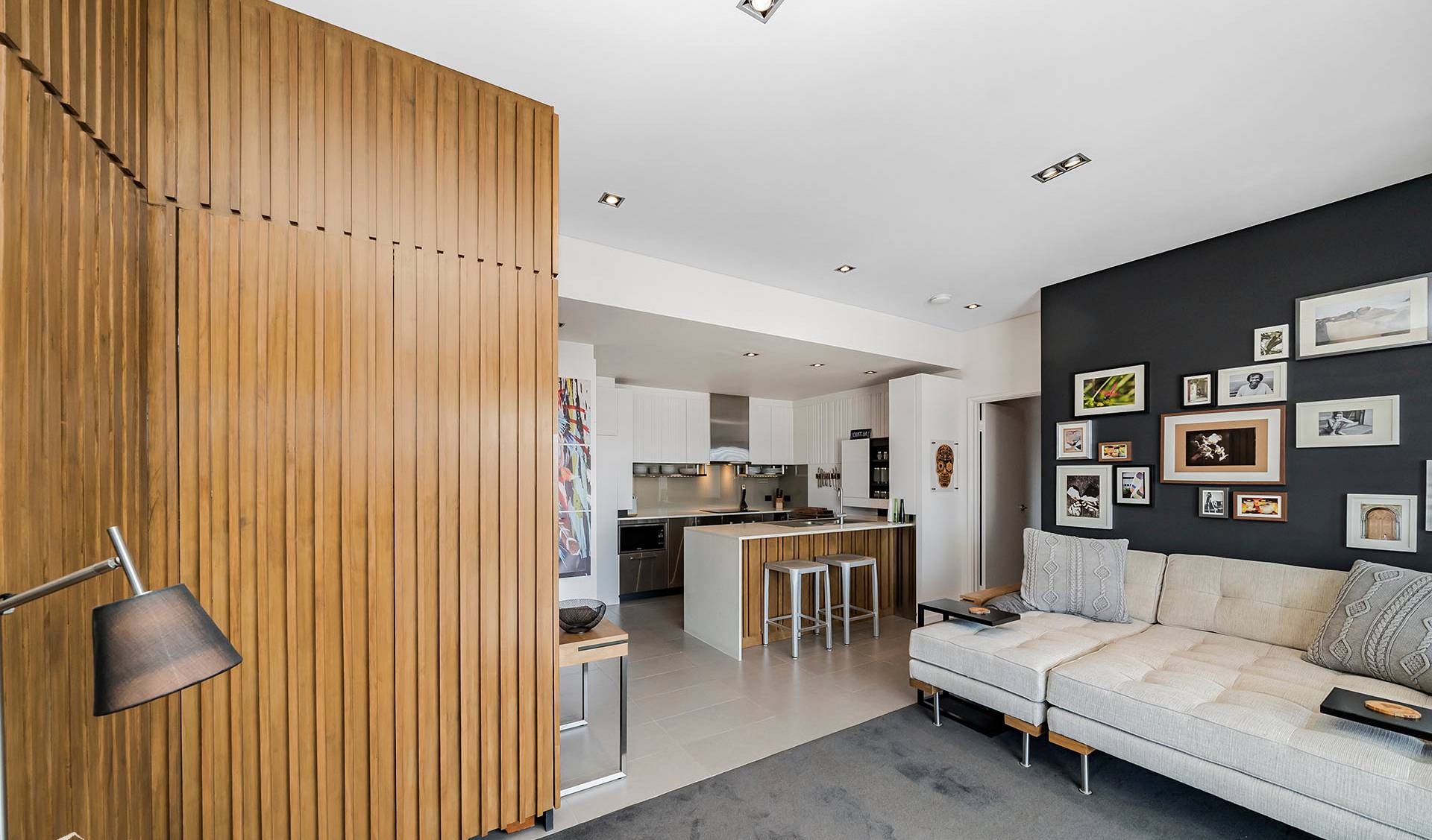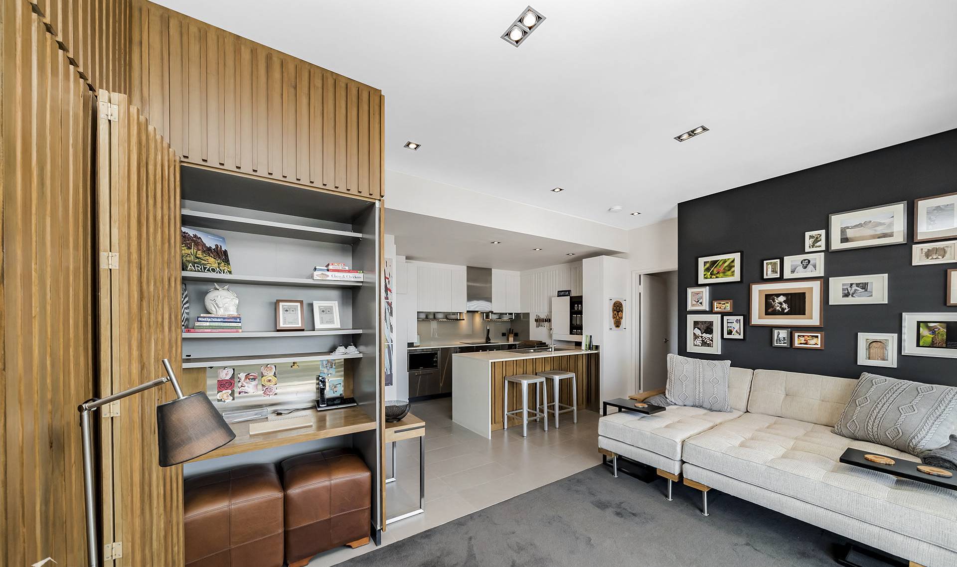 Located on the top floor with a north-facing aspect and sprawling, eight-metre long balcony, this unique apartment maximises every square inch of space. The original owner was an architect skilled at enhancing small spaces through space saving design. Q: When are timber-lined walls more than walls? When they're clever, much-needed storage solutions. This apartment boasts feature timber walls which not only add appealing warmth, they house and conceal a covetable WFH/study nook, ironing station, wall-to-wall robes, and audio visual equipment within the bedroom and living room.