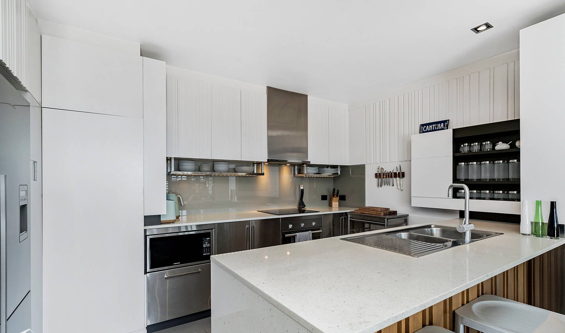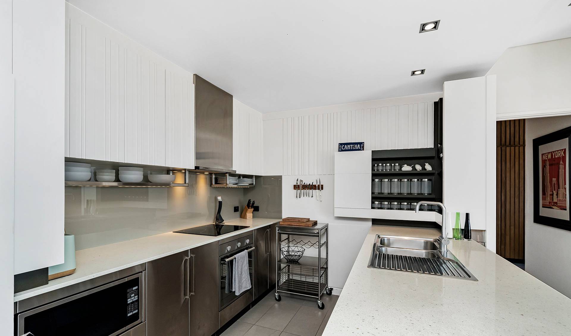 Ride one of two elevators to the top floor and mosey down an expansive hallway to enter the apartment, afforded peace and privacy due to its corner location, away from thoroughfares and lift wells. Step inside using the keyless remote and you'll be drawn to the feature timber fretwork adorning the walls. Turn left into the generously sized, thoughtful kitchen with gleaming glass backsplash, stunning stone countertops, waterfall island and breakfast nook. Notice the custom cabinetry, juxtaposed against stainless steel appliances – installed within a millimetre of their existence for a seamless, space maximising fit.