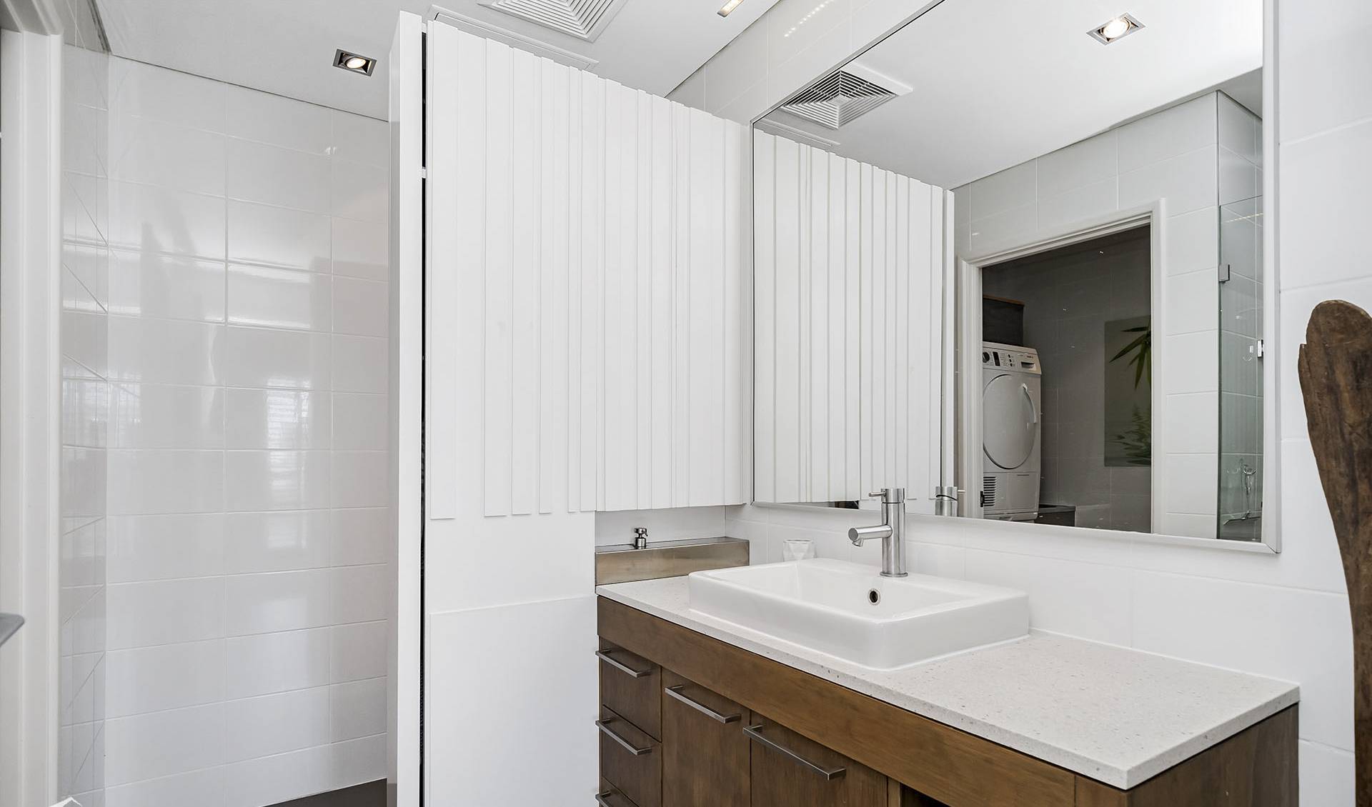 The combined bathroom/laundry is a marvel in space saving interiors, with thoughtful design providing plenty of much-needed storage and valued privacy.