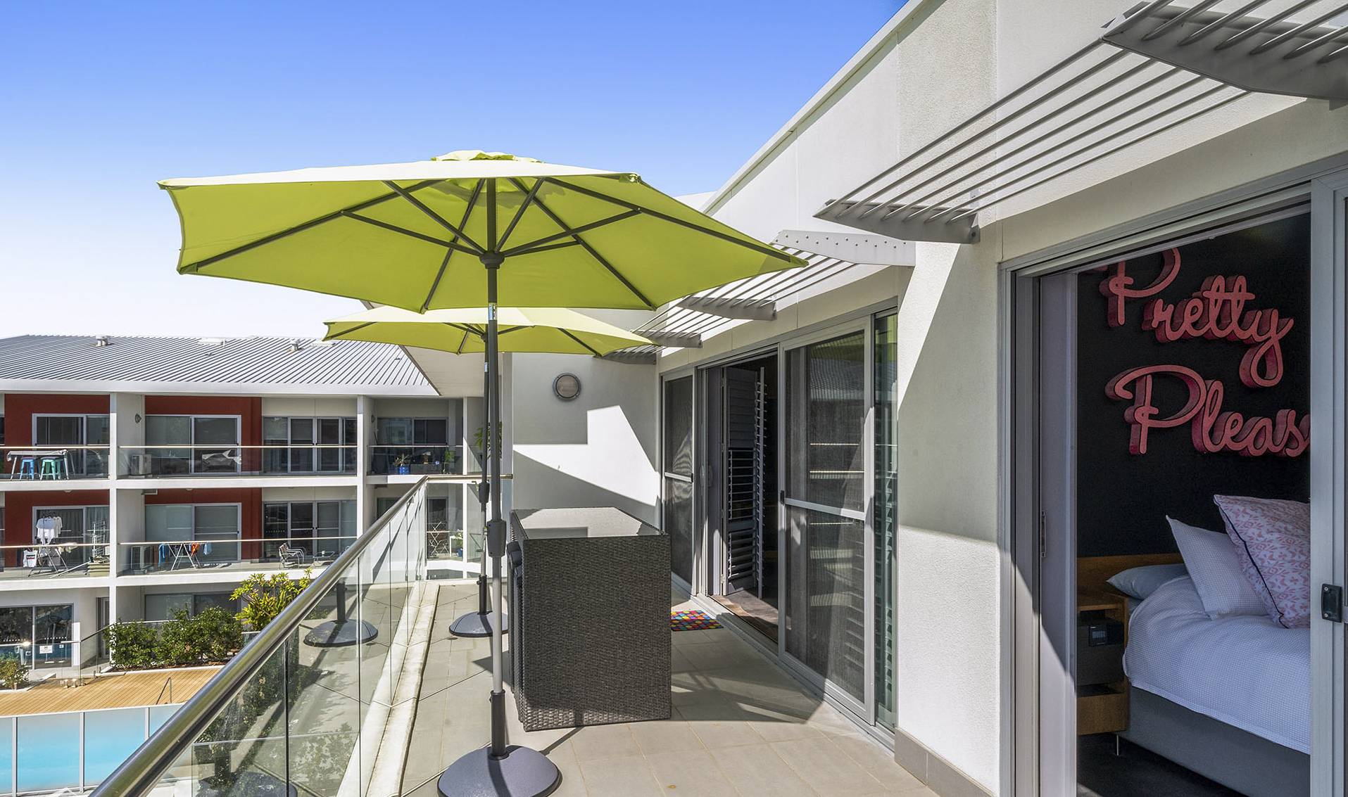 The adjoining living room exudes warmth and style. Plush furniture and carpeting, subtle lighting, feature floor-to-ceiling timber fretwork and grey, industrial-inspired plantation shutter doors reveal an expansive balcony via premium sliding glass and flyscreen doors. Enjoy the fresh air as you perch at the six-person weatherproof rattan bar beneath two market umbrellas.