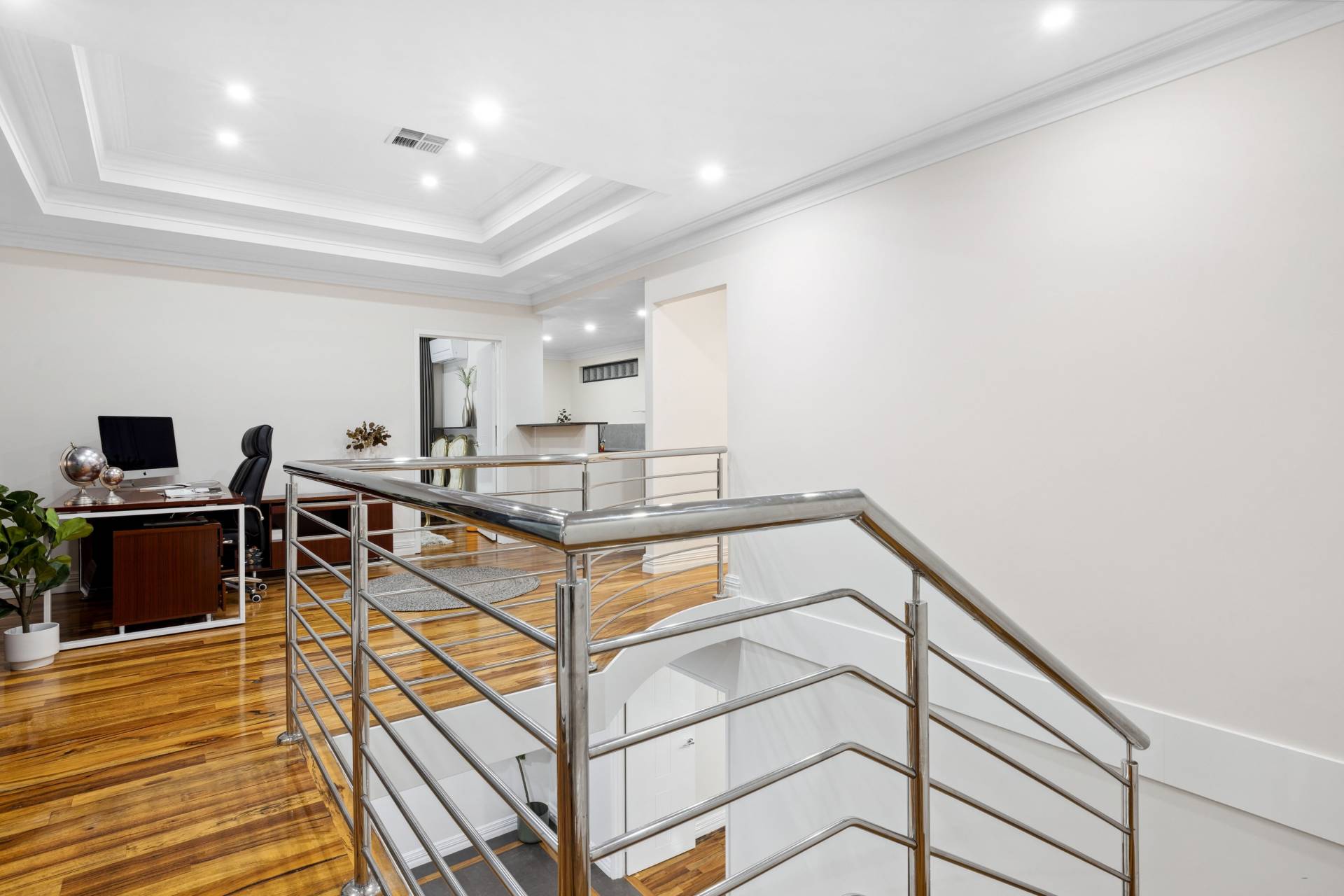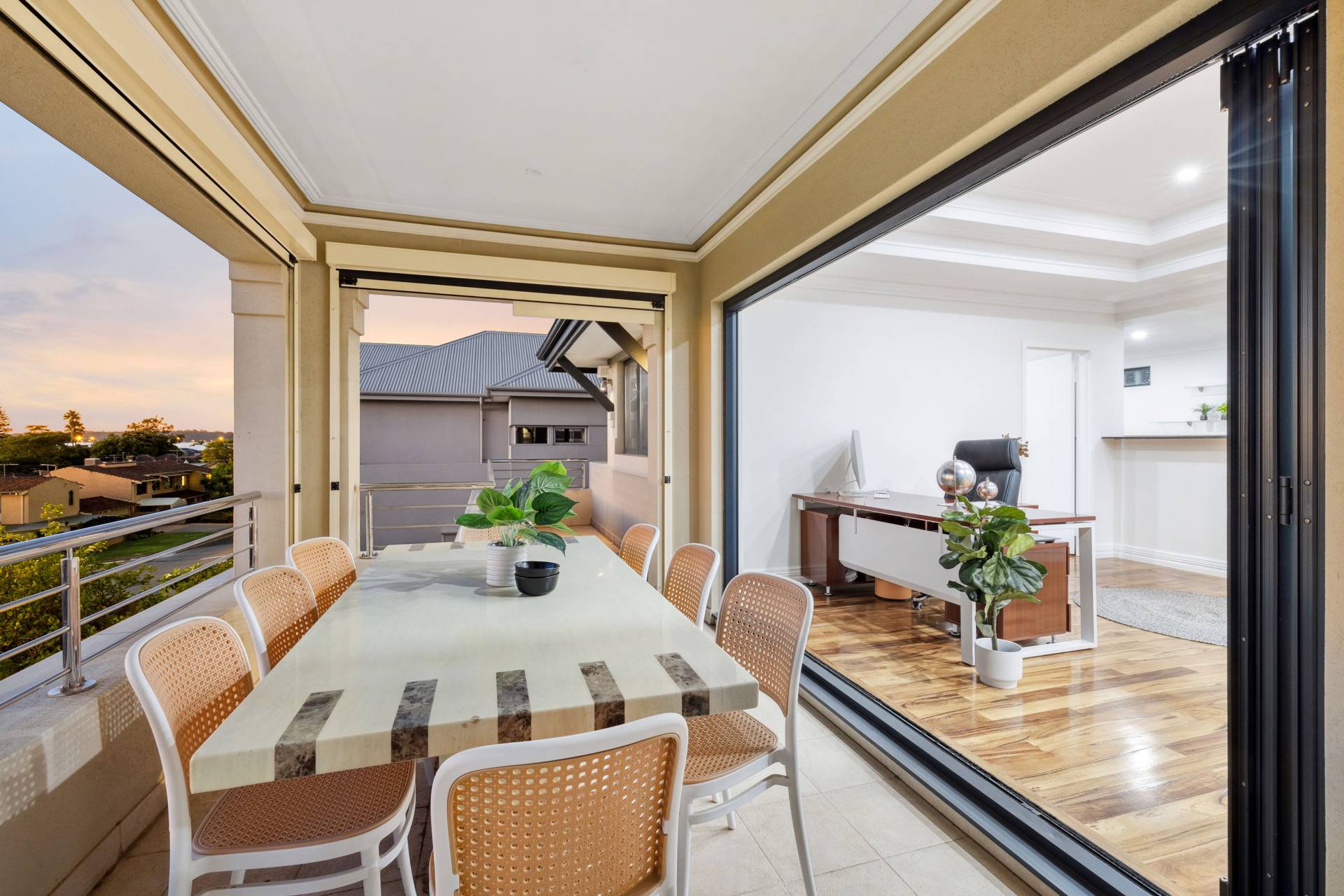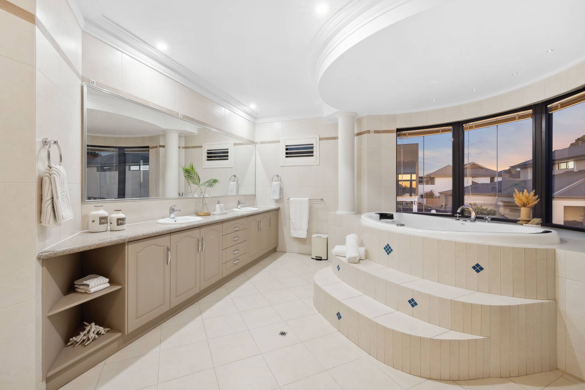 The upstairs retreat is a haven for relaxation, boasting stunning views of the Swan River and The Raffles. Here, you'll find a spacious multipurpose area, perfect for a games room or formal lounge, as well as a luxurious master suite complete with walk-through built-in robes and a lavish ensuite featuring a corner elevated spa bath, double shower, and vanity.