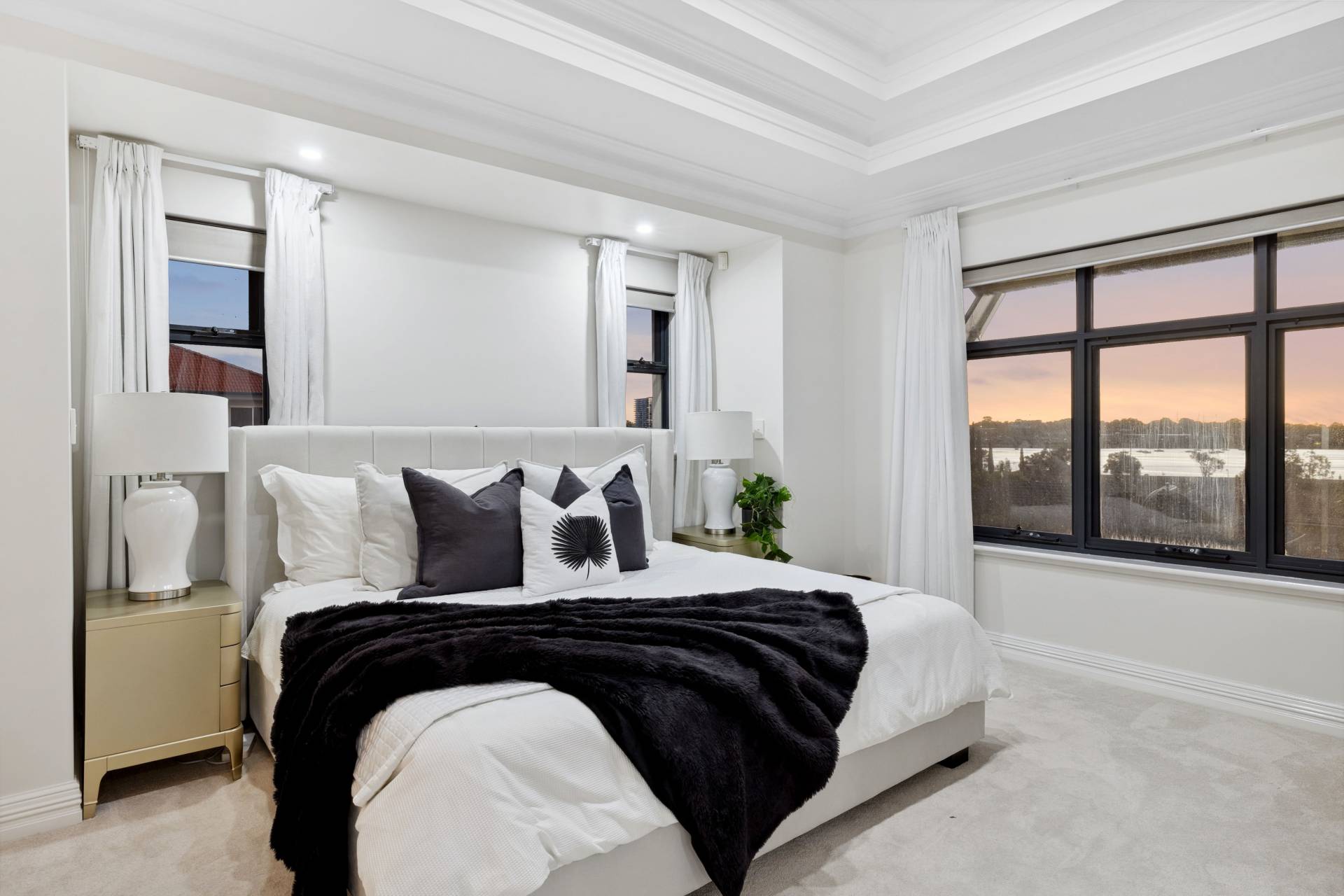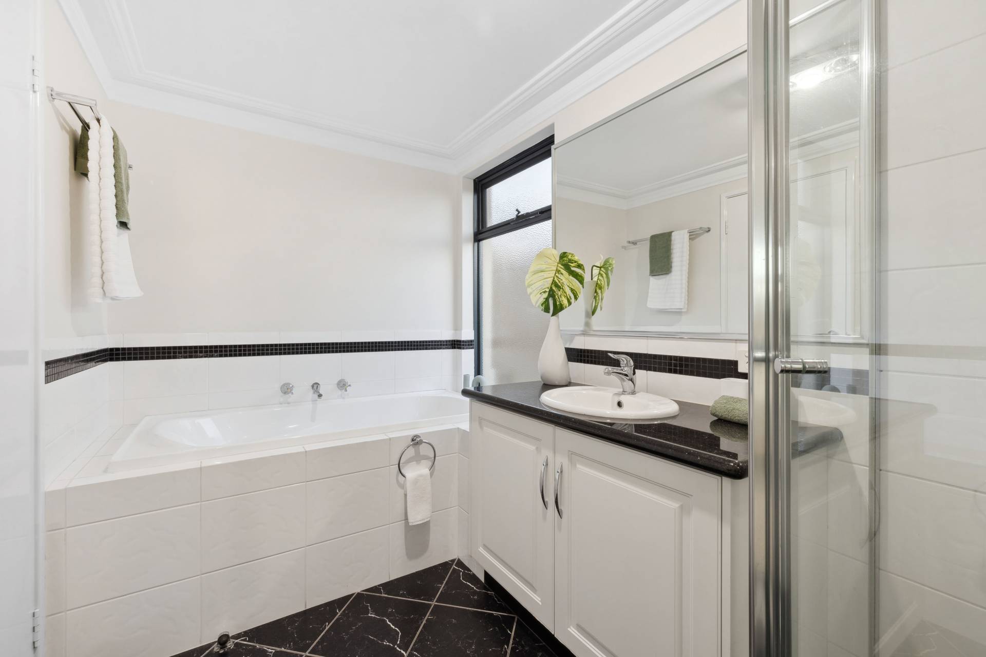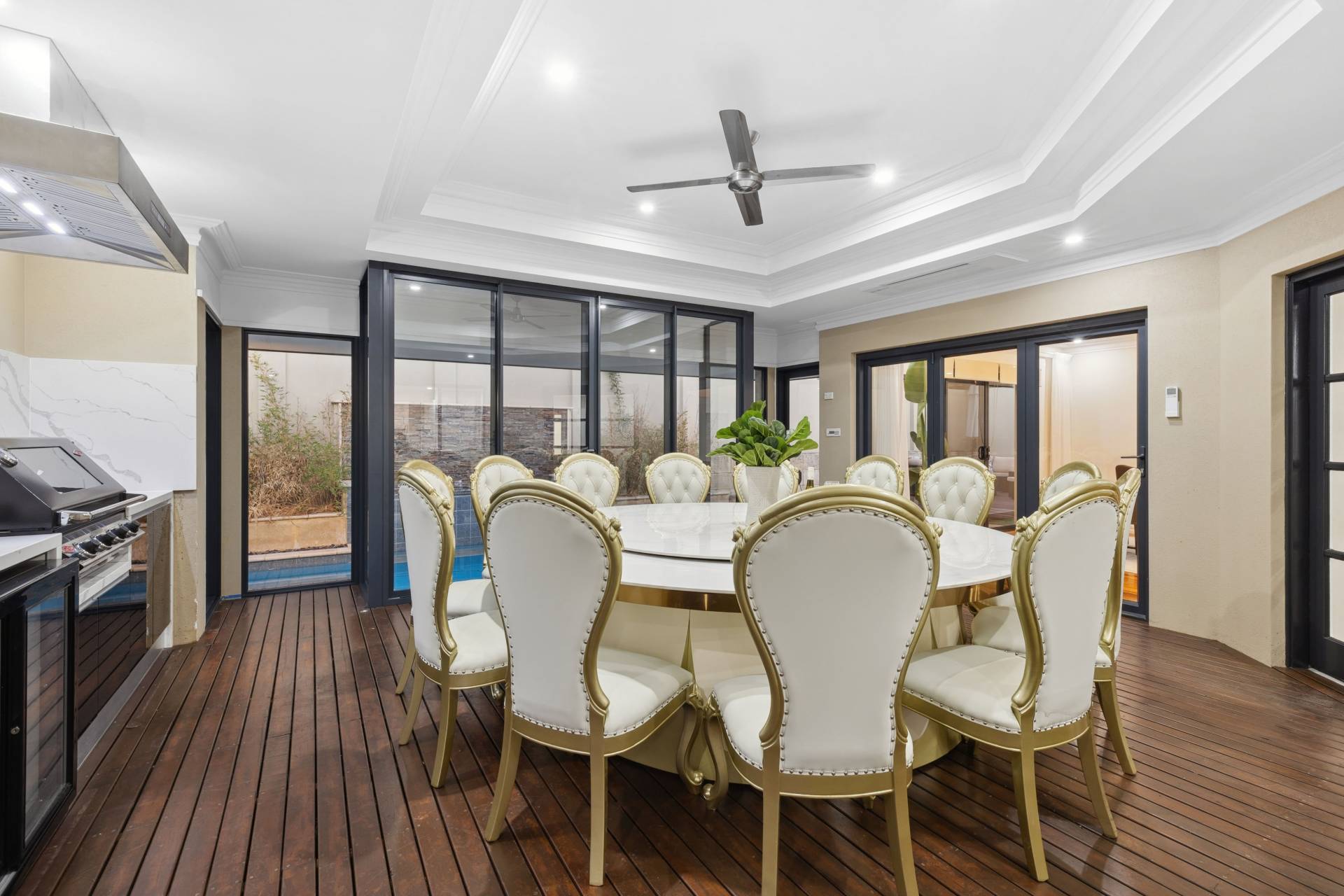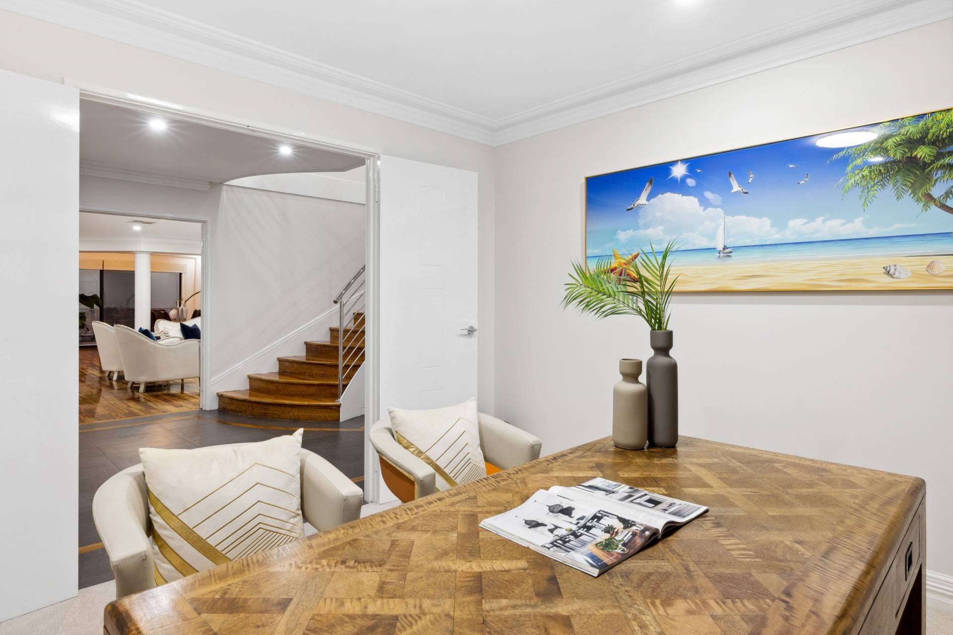 The upstairs retreat is a haven for relaxation, boasting stunning views of the Swan River and The Raffles. Here, you'll find a spacious multipurpose area, perfect for a games room or formal lounge, as well as a luxurious master suite complete with walk-through built-in robes and a lavish ensuite featuring a corner elevated spa bath, double shower, and vanity.