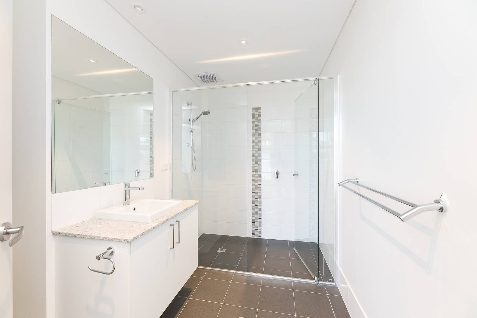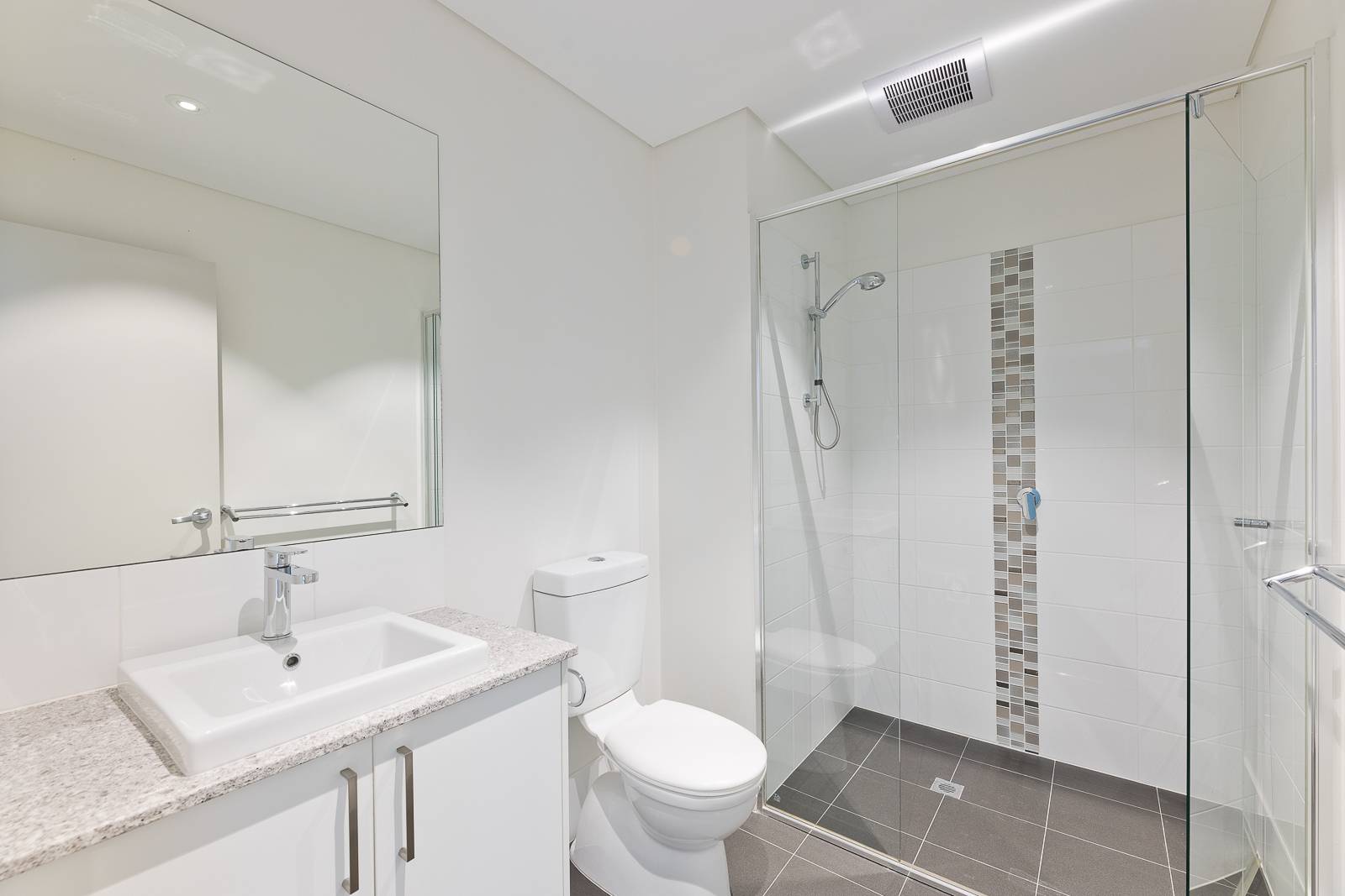 • Modern bathrooms with stone benchtops, one being an ensuite.
