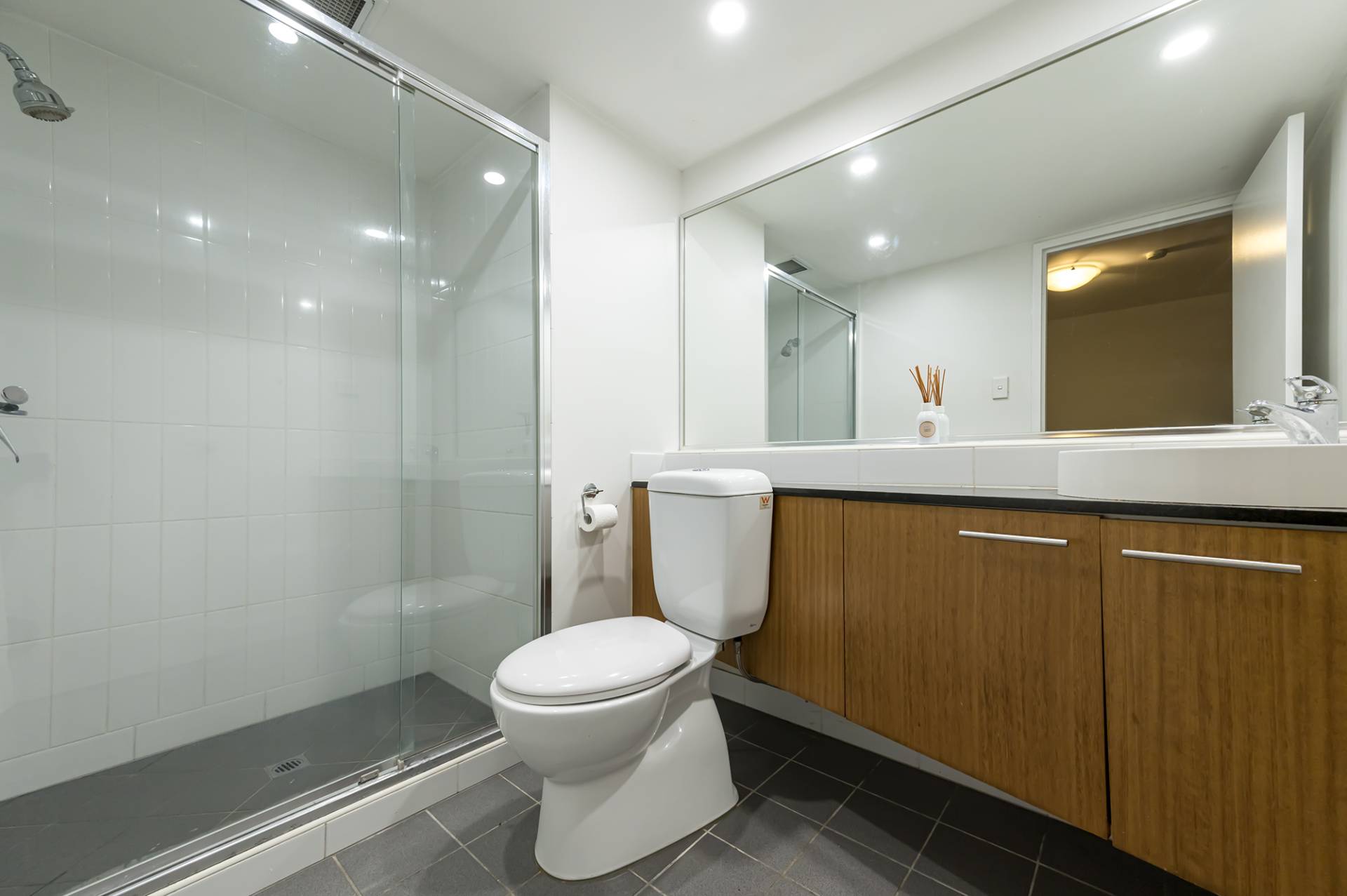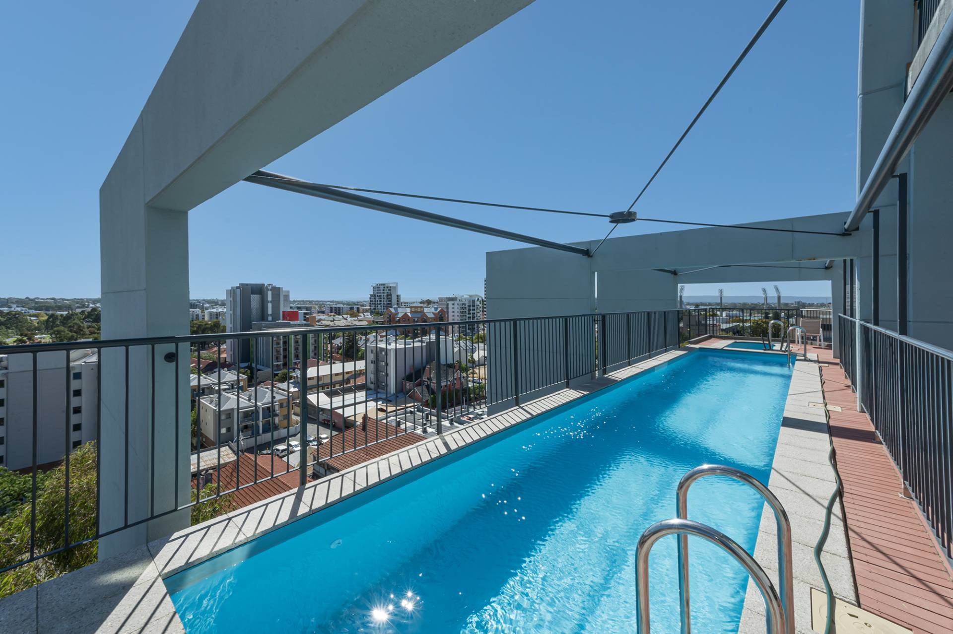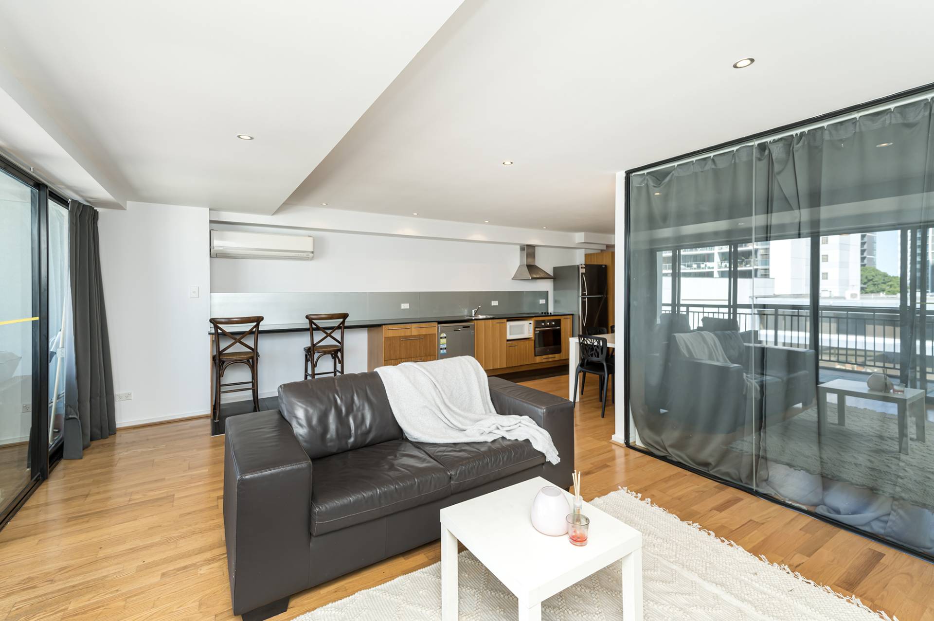 A central living area large enough for a modular lounge and table and chairs also opens out to the balcony, with sweeping views out across east Perth. Down the hall, both bedrooms feature sliding mirrored robes with the main enjoying its own sleek bathroom and huge walk-in glass shower with a separate bathroom and laundry providing further convenience.