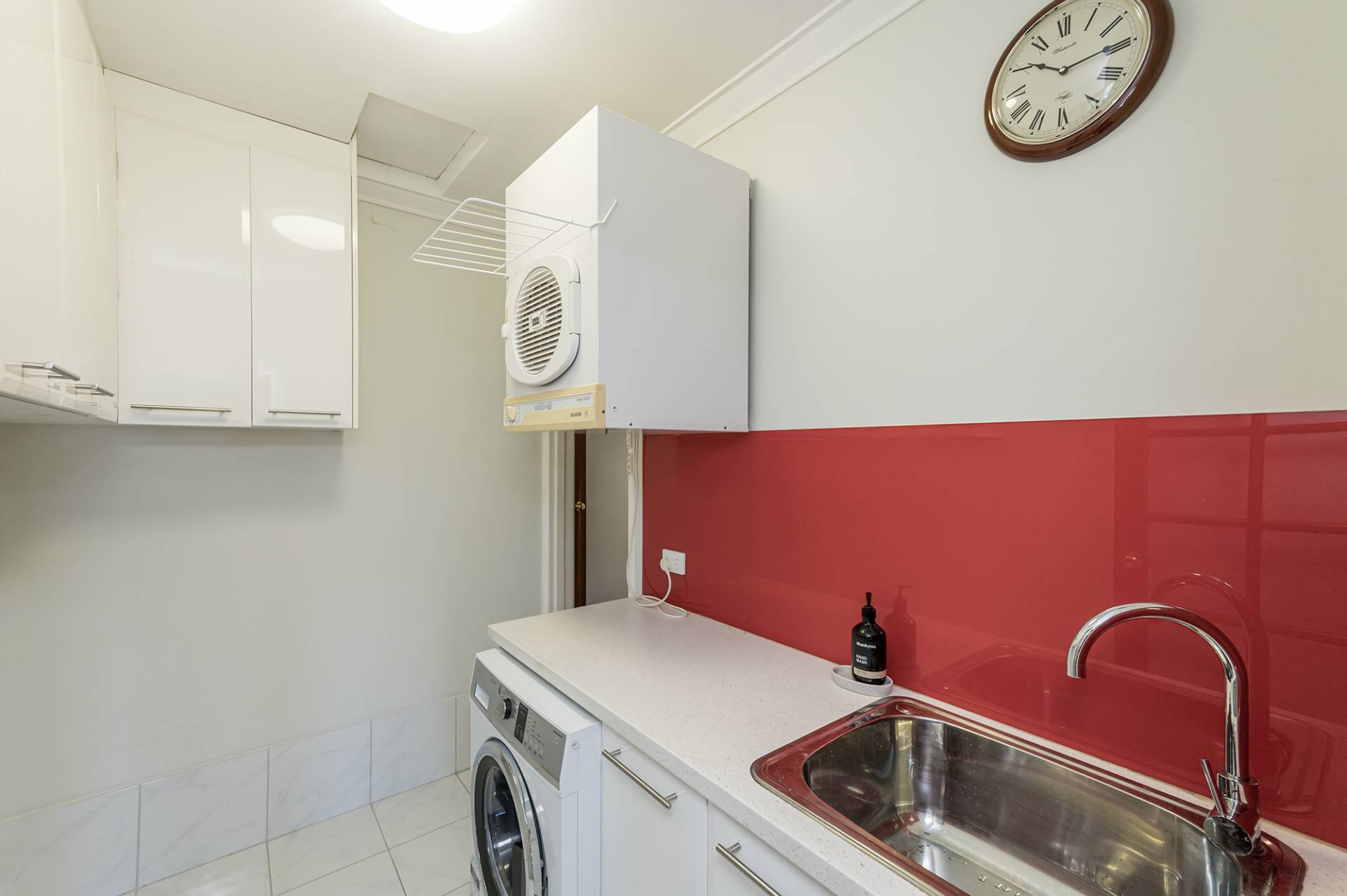 Notable features include a spacious open-plan family living and dining room that opens to a private backyard, surrounded by a low-maintenance garden, perfect for hosting evening soirees. The adjacent kitchen offers convenience while maintaining separation from the family and dining area. This well-appointed culinary space showcases an engineered stone benchtop, electric oven, ceramic cooktop, stainless steel range hood, dishwasher, a double sink with a separate filter tap, ample under-counter storage, a pantry, and a shopper's entry from the garage.