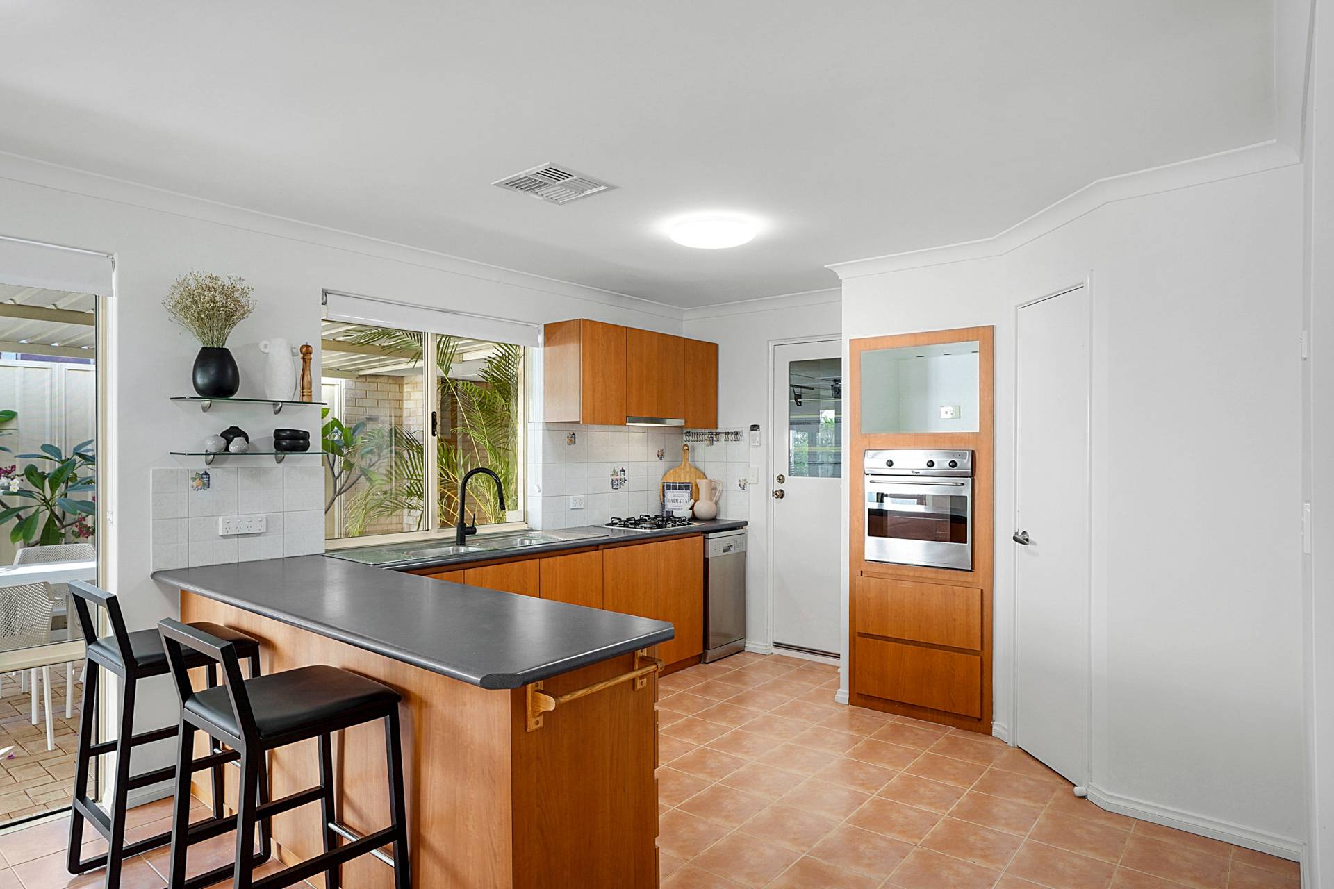 - Spacious kitchen includes 4 burner gas cooktop, stainless steel pop-out range hood, dishwasher, double sink, dual fridge recess and breakfast bar
