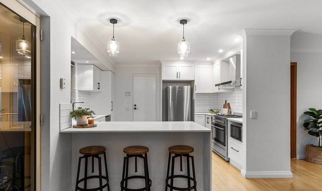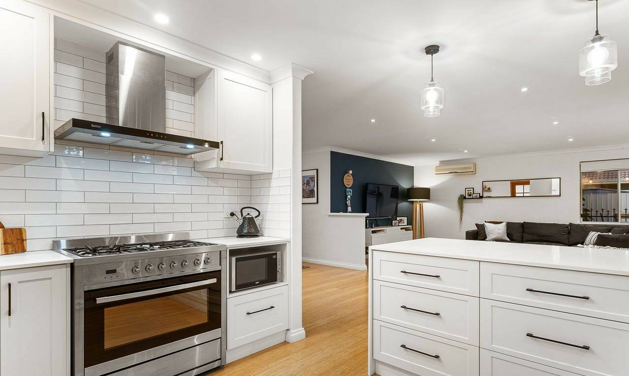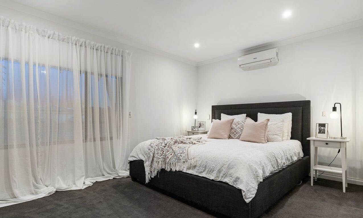 The kitchen features sleek white cabinetry, 900 mm freestanding oven, dishwasher, waterfall stone benchtops, and pendant lighting, making it a chef’s delight. Bamboo flooring in the main living areas adds both style and durability, complemented by three split-system air conditioners for year-round comfort.