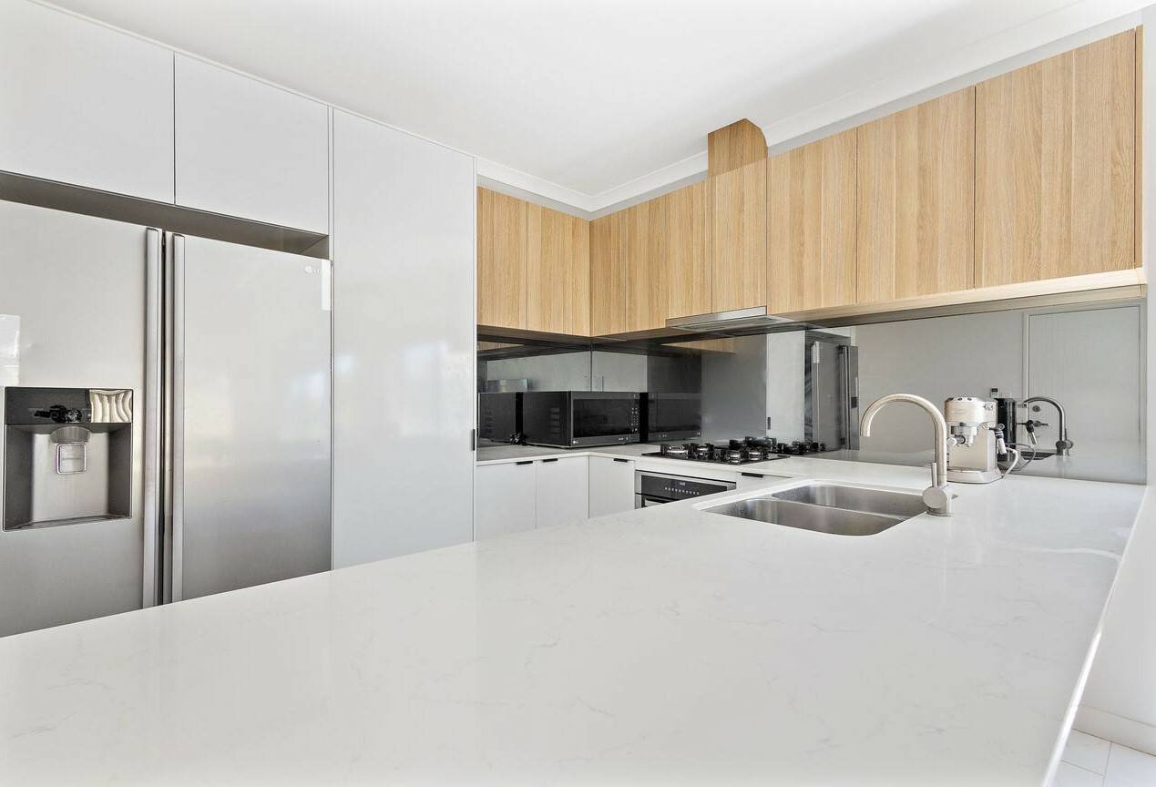 The contemporary kitchen, complete with stone benchtops, modern appliances, and ample cupboard space, seamlessly overlooks the open-plan dining and family living areas.