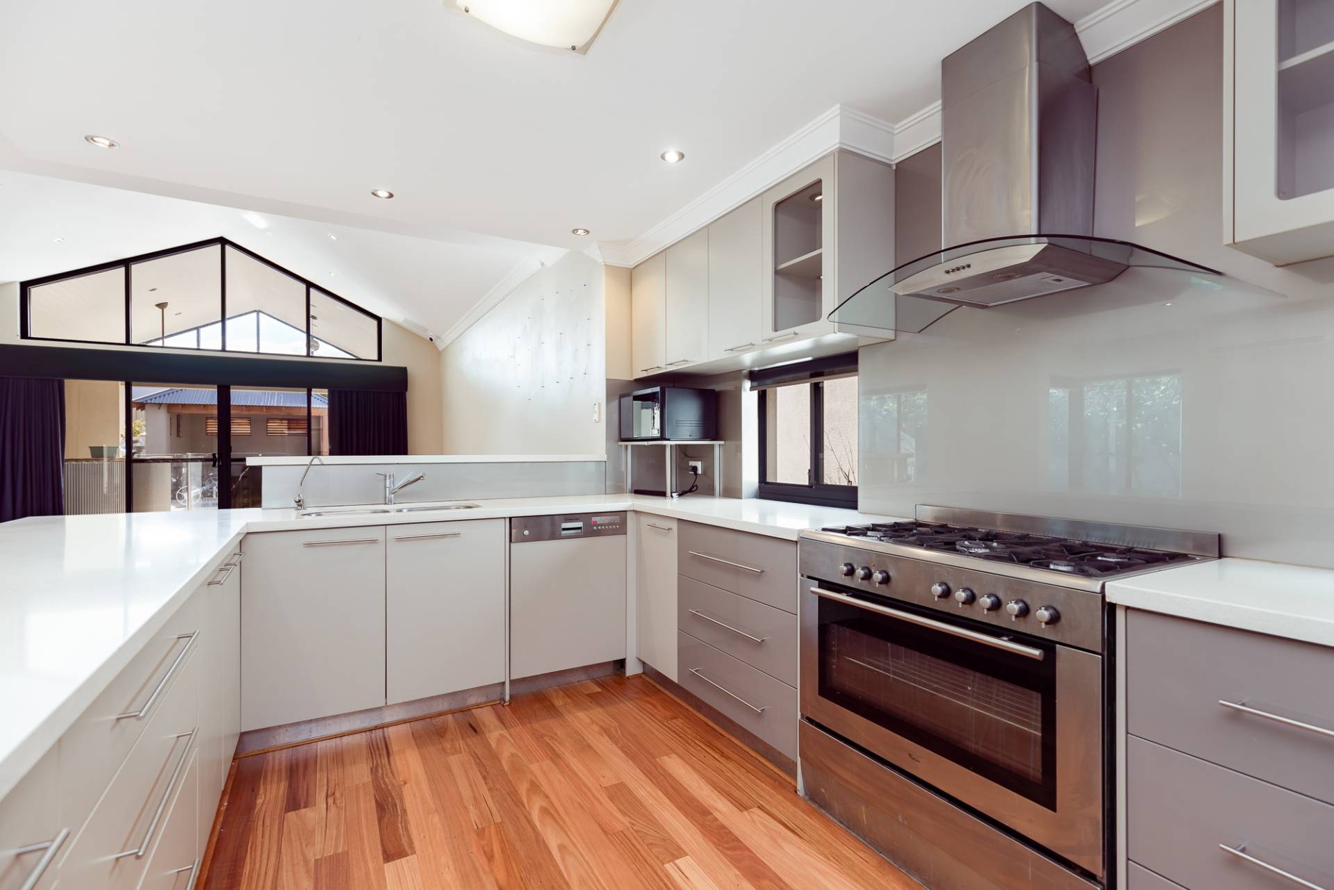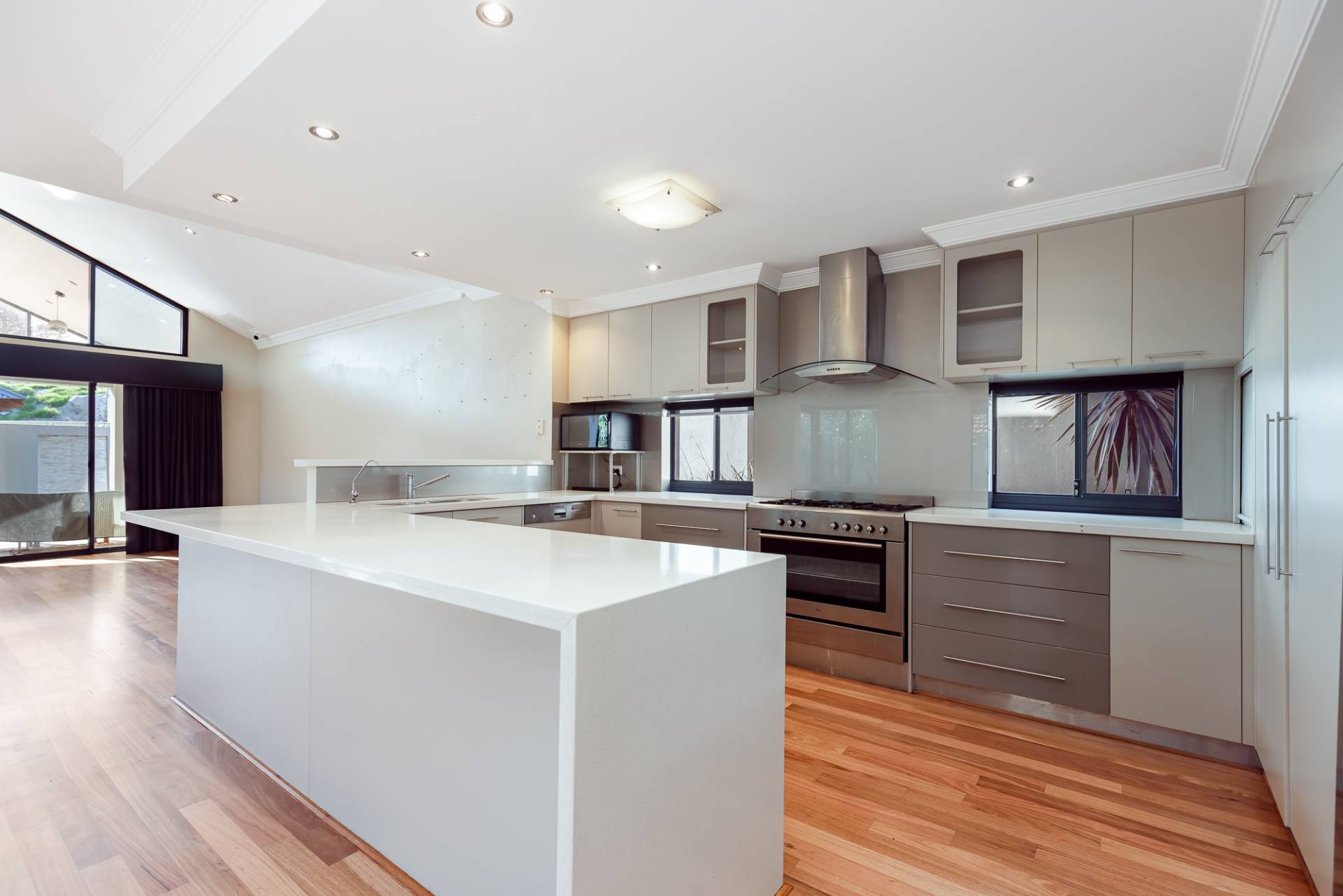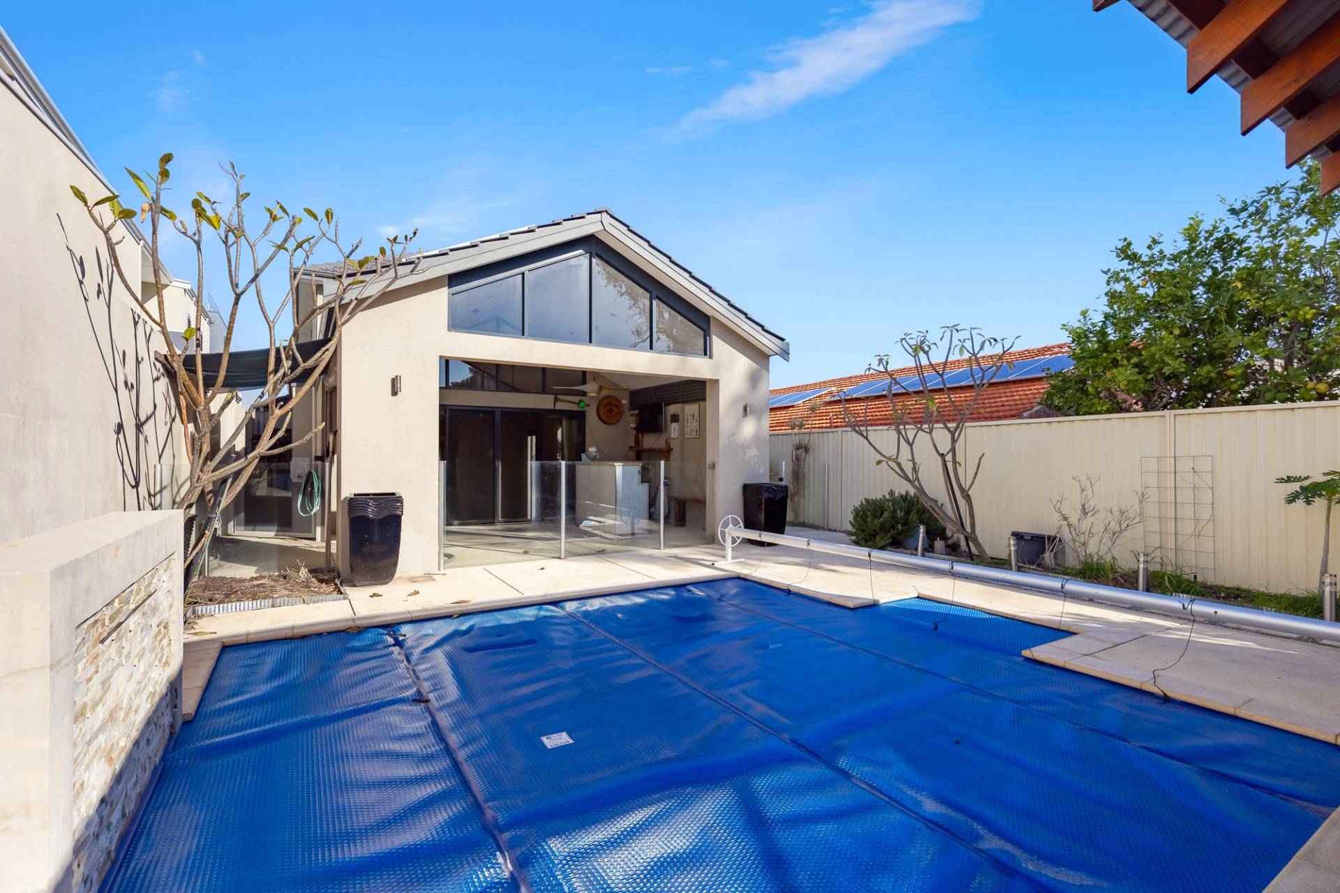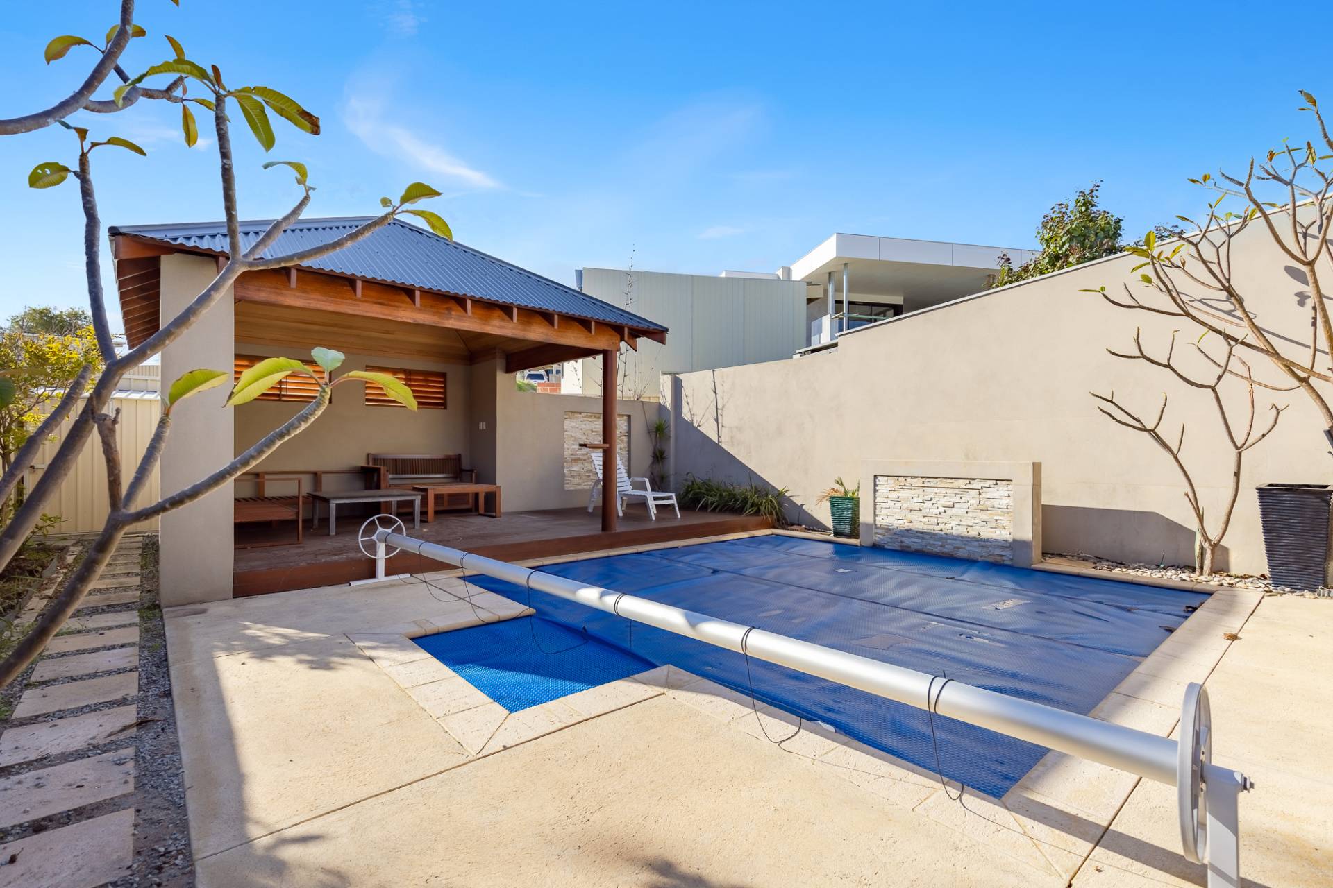 Also on this level is a laundry room equipped with a wall of storage cupboards, an inset trough, space for a freezer under the bench, and a third WC and powder room. The kitchen, dining, and sitting areas offer tranquil pool views through double sliding doors, leading to an alfresco area under the main roof and across the pool to the cabana. This alfresco area is perfect for entertaining, sheltered from the hot afternoon sun and sea winds. Glass pool fencing opens onto the pool and leads to a spacious tropical-style cabana with floor lighting, a timber-lined ceiling, and a sun deck, offering luxurious resort-style living.