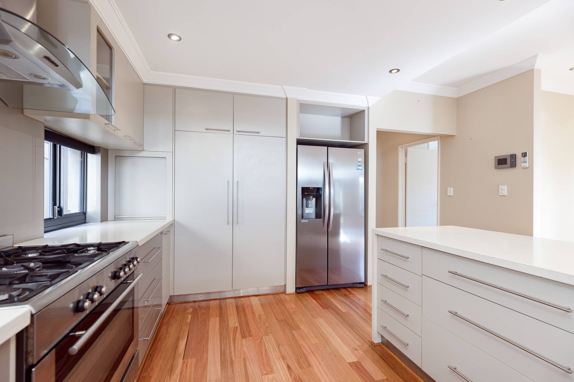 Positioned just 100 meters from the water's edge, this stunning home epitomizes quality living and an enviable lifestyle. The first of its two levels offers multiple living zones, including a theater room, a well-equipped study with built-in desk, safe and cupboards, and an open-plan kitchen, dining, and casual living area. The kitchen features wide Caesar stone benchtops, glass splashbacks, and integrated cabinetry, providing ample space for all cooking requirements with the inclusion of an appliance cupboard and a floor-to-ceiling pantry.