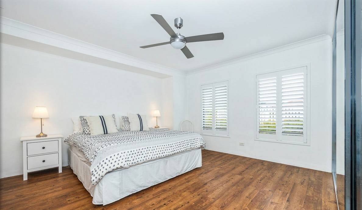 Inside, widened hallways and recessed ceilings enhance the spacious feel. The large master bedroom at the front offers plantation shutters, triple sliding robes, and an open ensuite with 'his & hers' vanities. The three additional double bedrooms have built-in robes, with bedroom 2 offering semi-ensuite access.