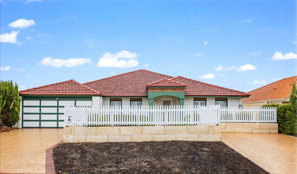 Beyond the white picket fence, the charming Tuscan-style front and grand portico set the scene. It features a double garage and extra parking for a boat, trailer, or caravan.