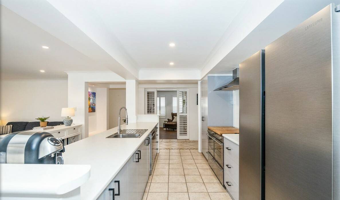 The central galley-style kitchen includes stainless steel dual ovens, an extended breakfast bar, double fridge recess, built-in pantry, LED lighting, and a shopper's entry. The adjoining dining area overlooks the pool.