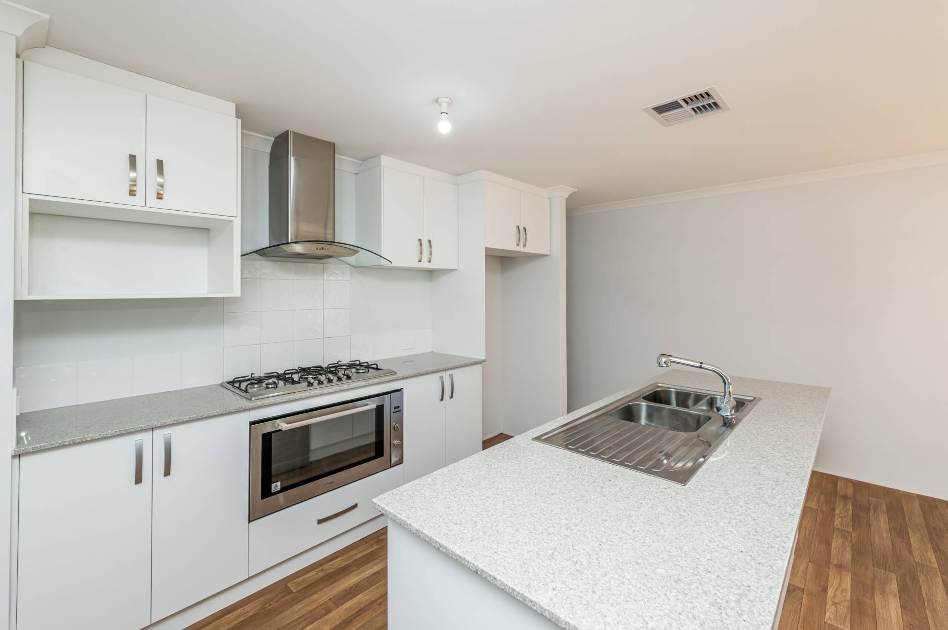 Contemporary kitchen with stone benchtops, double sink, built-in oven, separate island bench, stone benchtops, ample cupboards, walk-in pantry