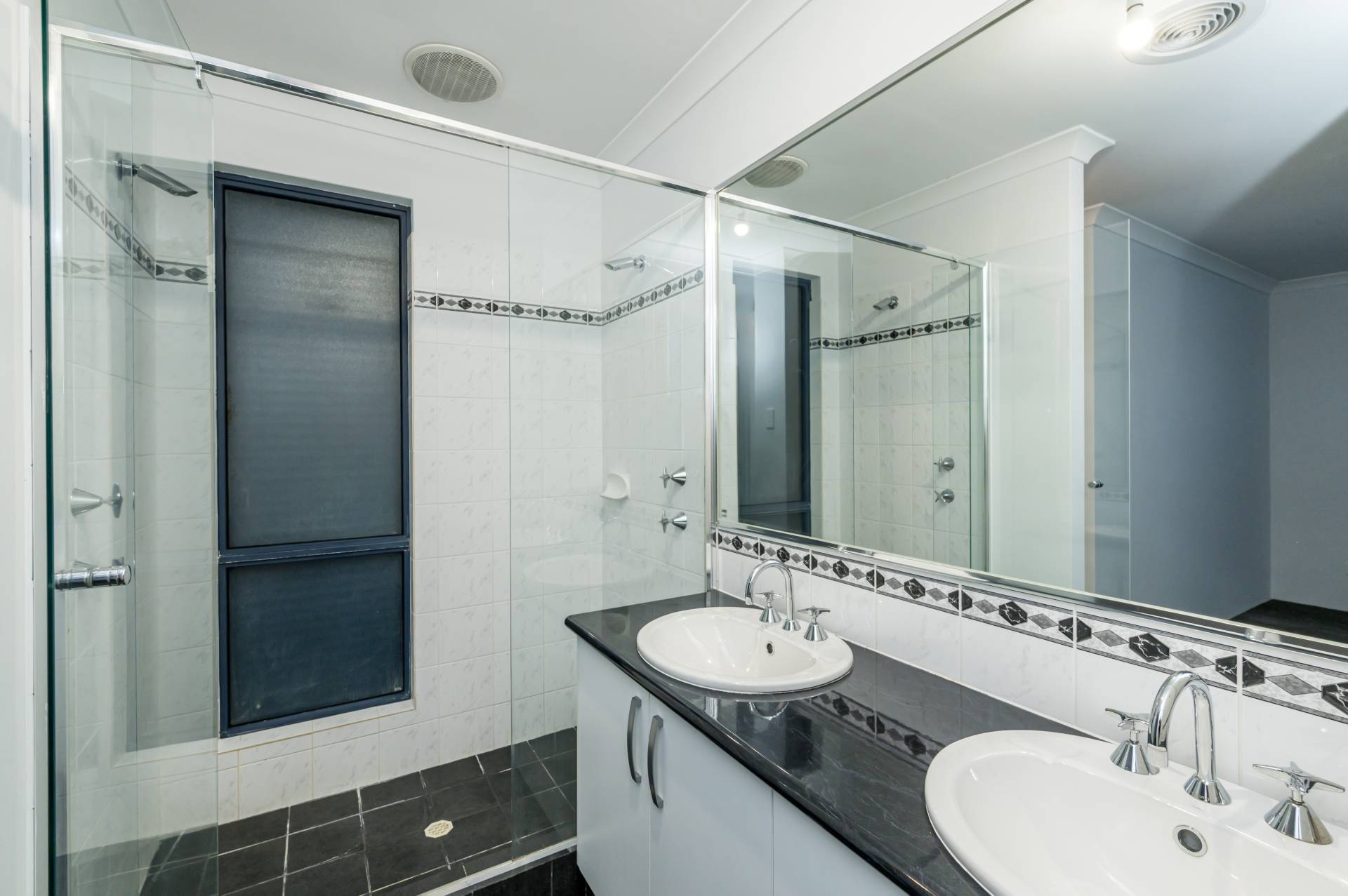 Master suite with modern ensuite, double sinks, large double shower, shelved walk-in robes