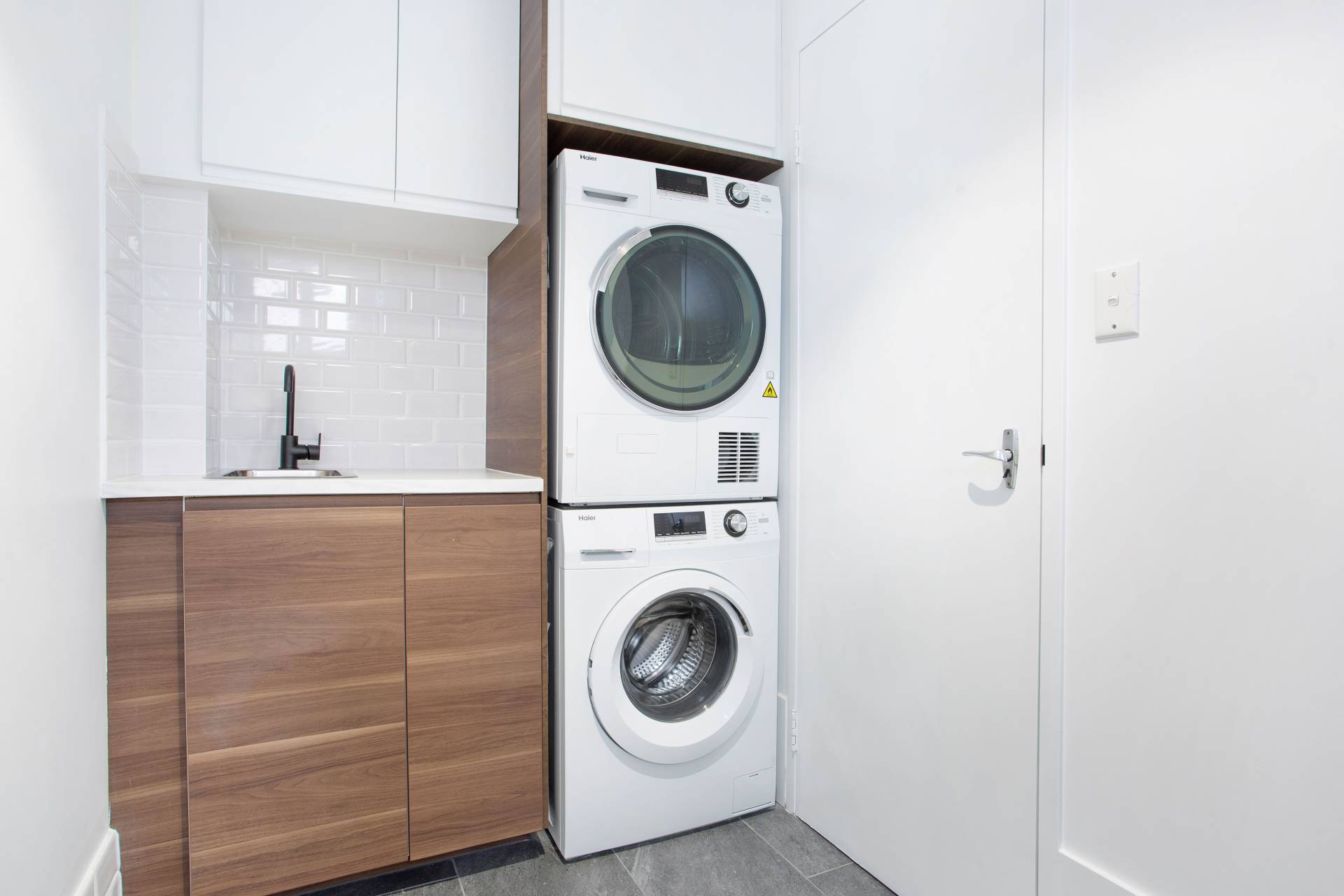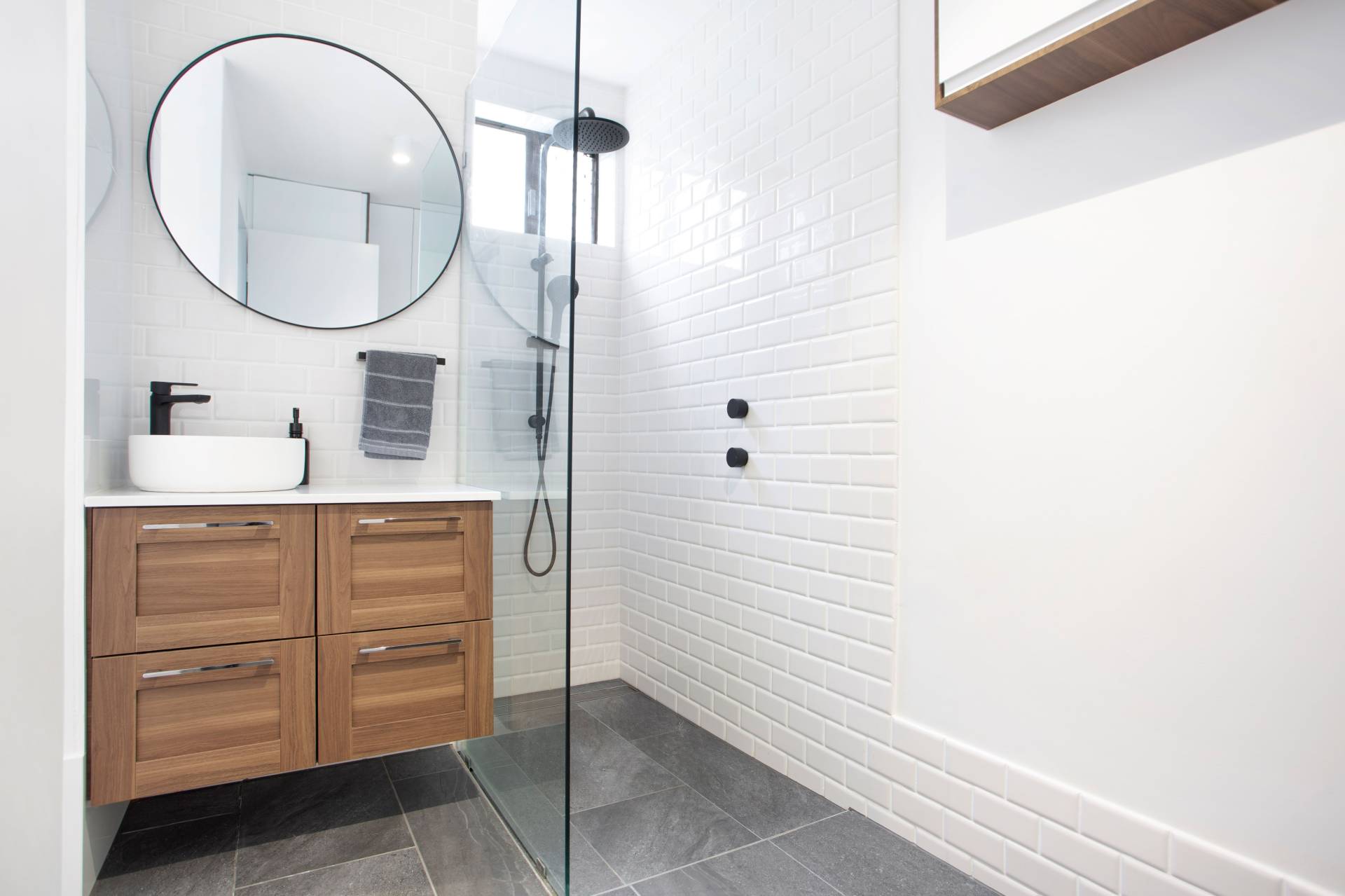 • Bathroom: Luxurious with a large shower head, detachable shower head, floating vanity, plenty of drawer space, and a large circular mirror.