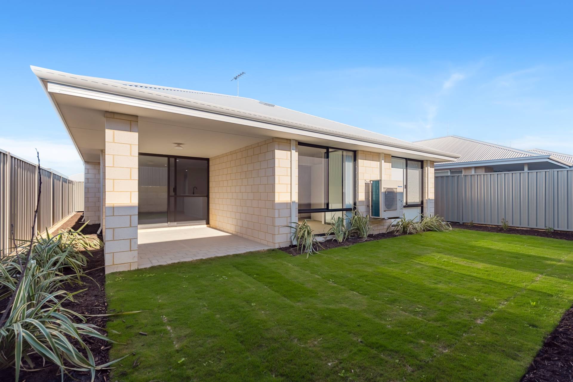 • Low maintenance backyard with easy-care garden beds and real turf