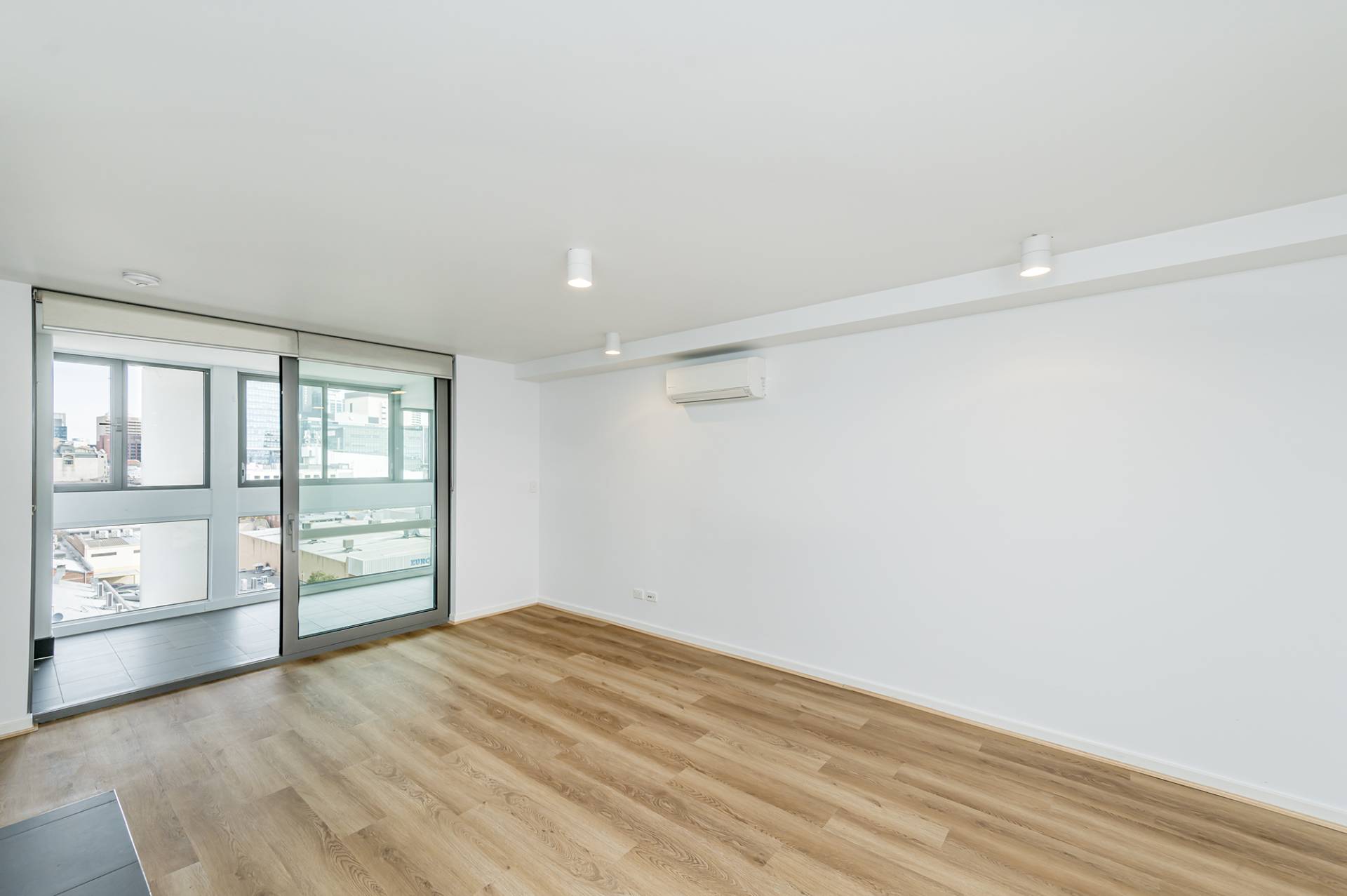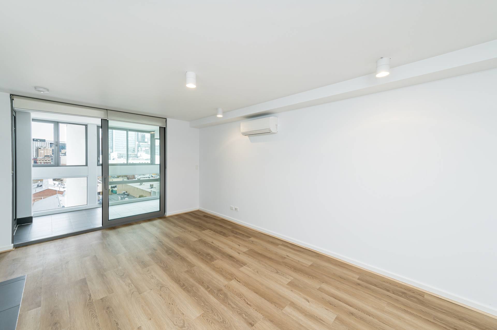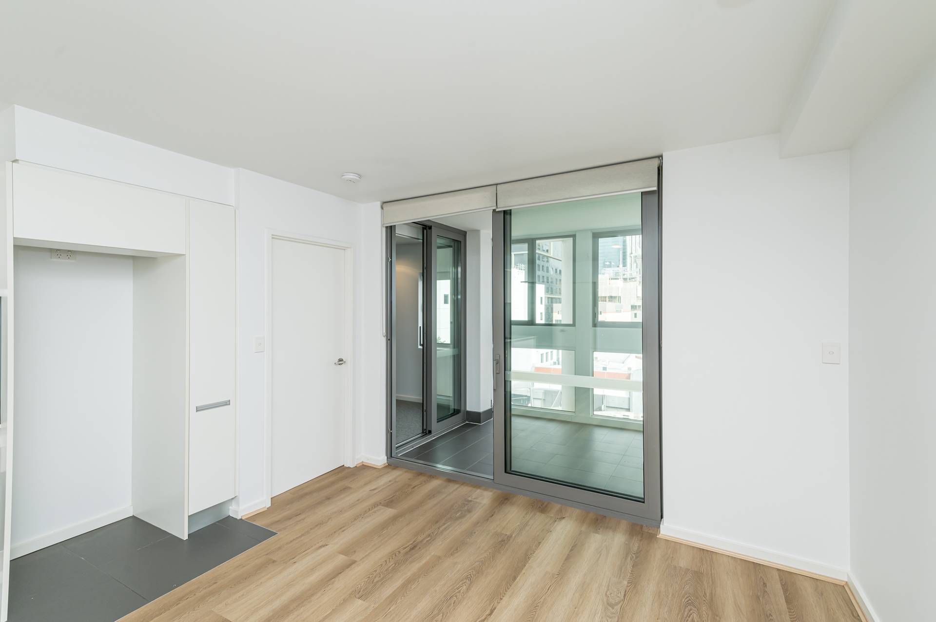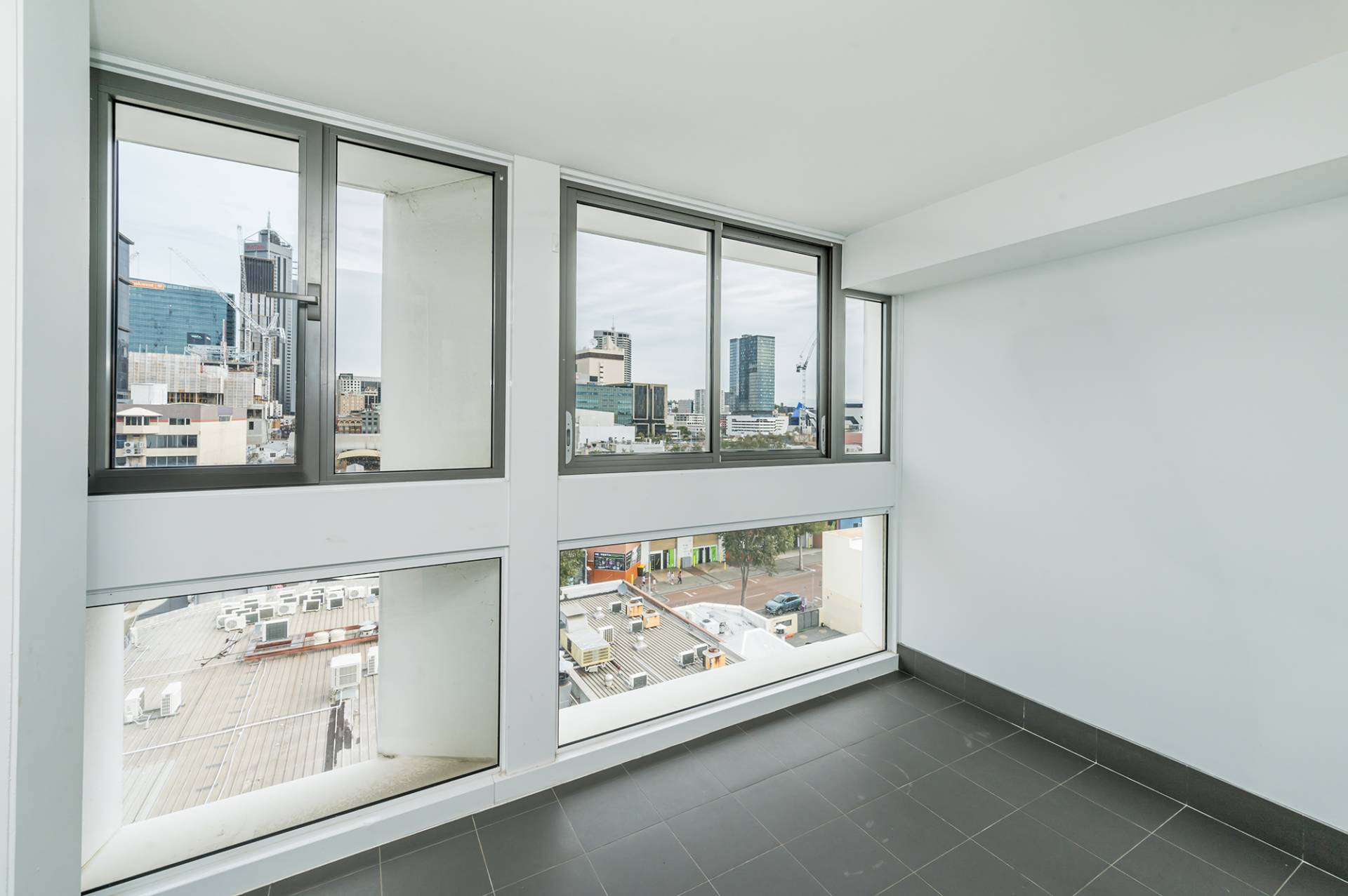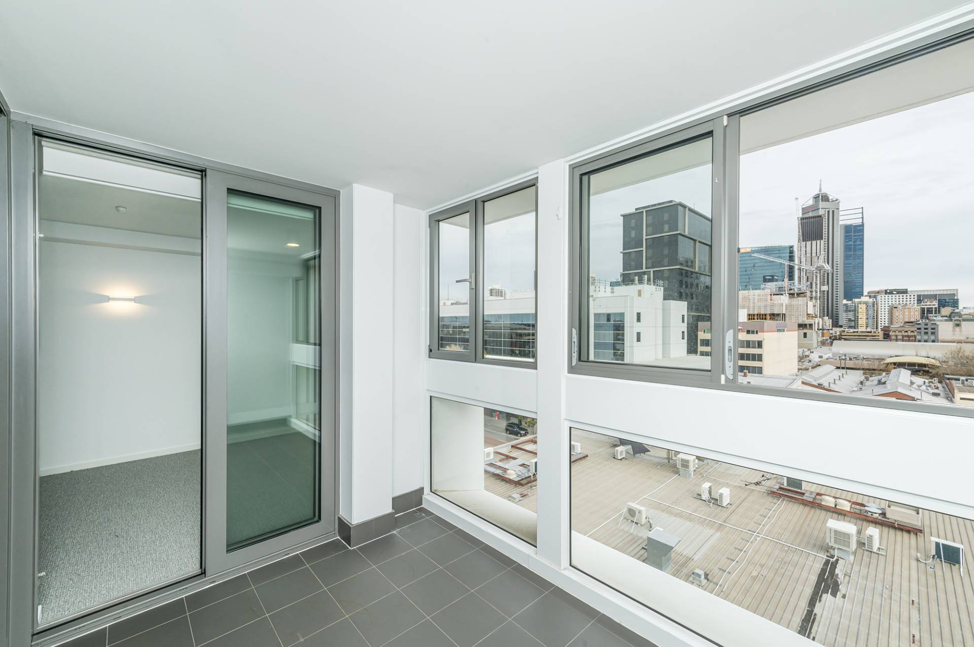 Sliding doors to enclosed tiled balcony overlooking the cityscape with windows