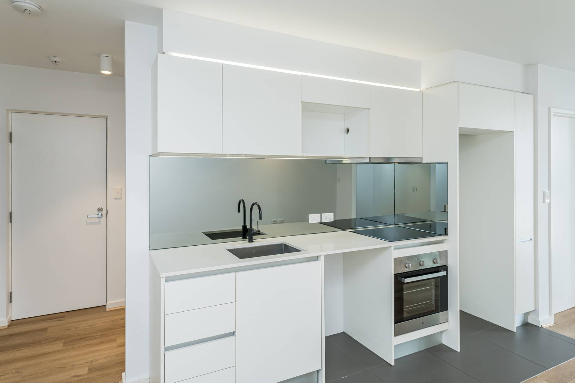 Modern kitchen with stone benchtops built in oven, overhead cupboards, induction stovetop