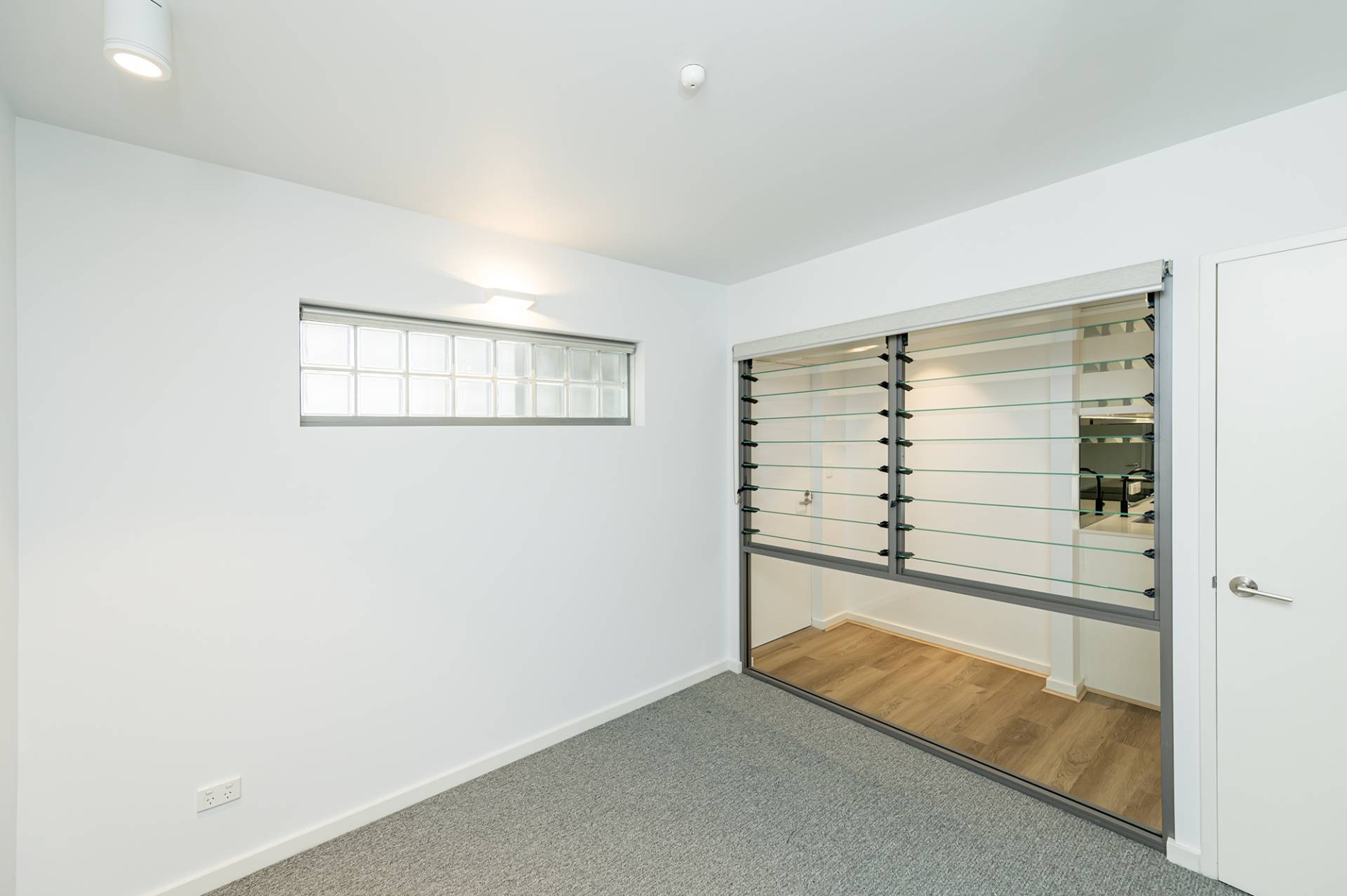 Timber-style flooring, indoor louvred windows, blinds