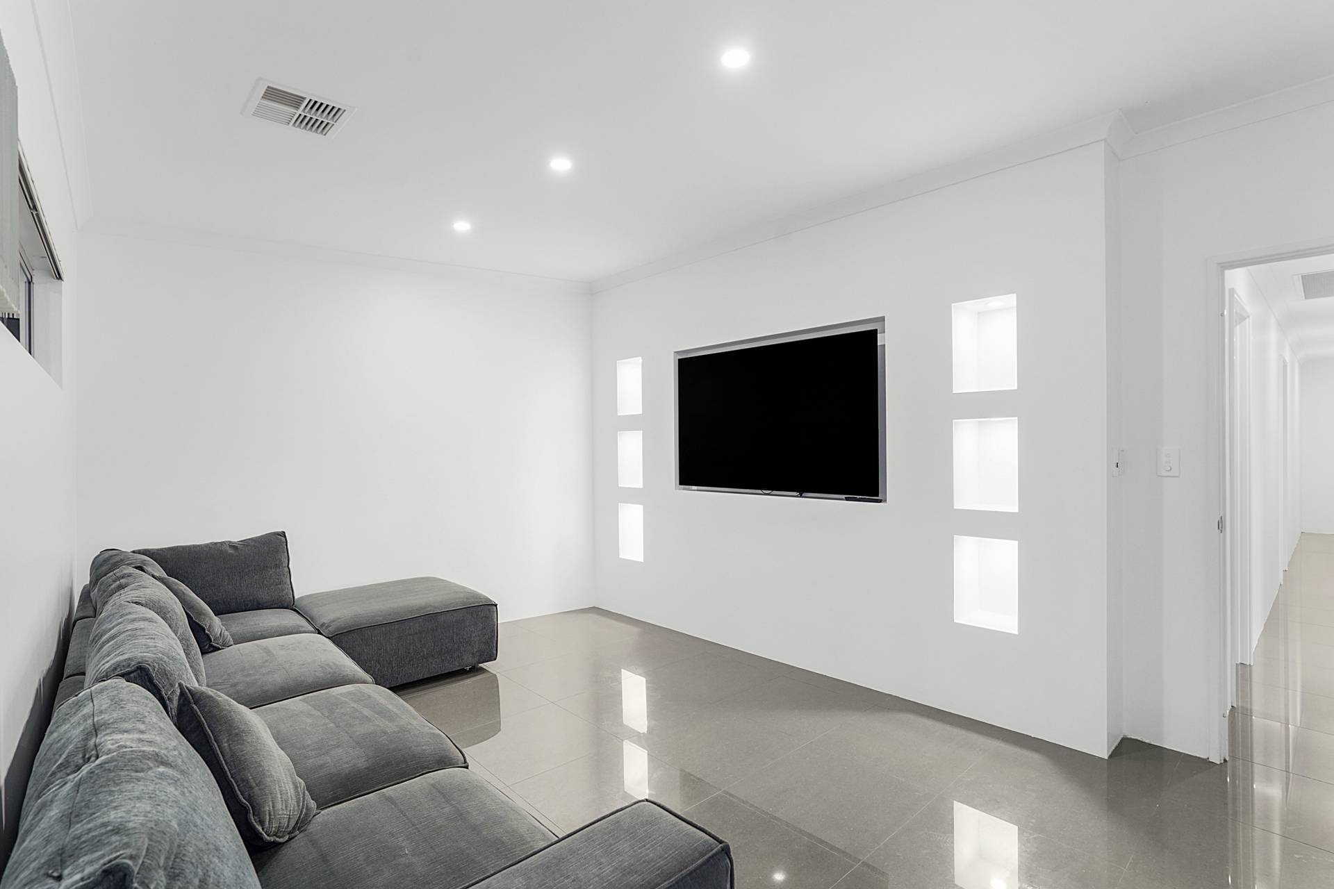 - Open plan casual living incorporates the family room and dining area and comes with a recessed TV unit, plus a 70” TV (Included) and 6 lighted shelves that can be dimmed