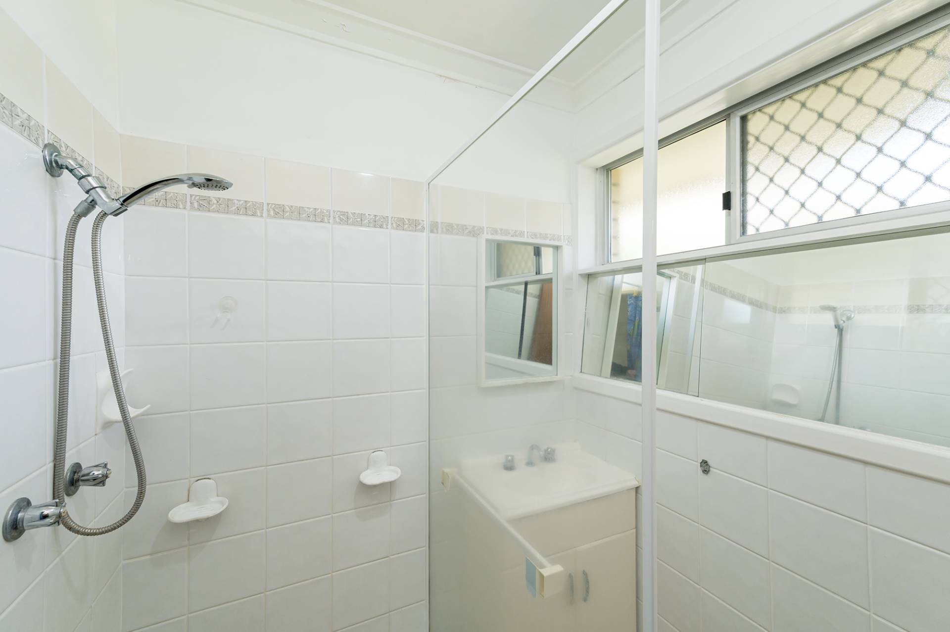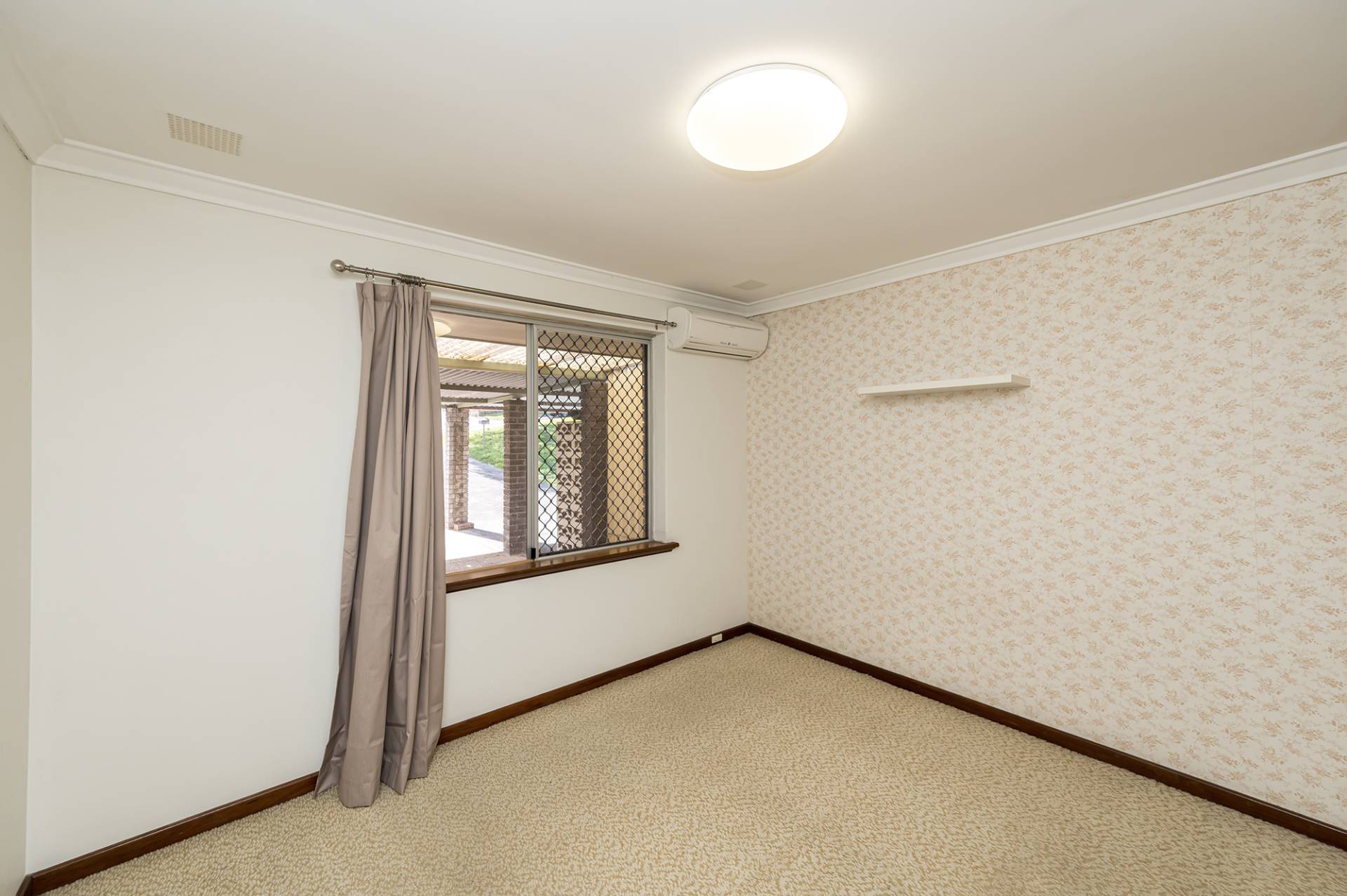 A good-sized main bedroom features the comfort of air conditioning, carpet and drapes with full floor-to-ceiling robes, while the second bedroom also includes timber robes, drapes, and ceiling fan.