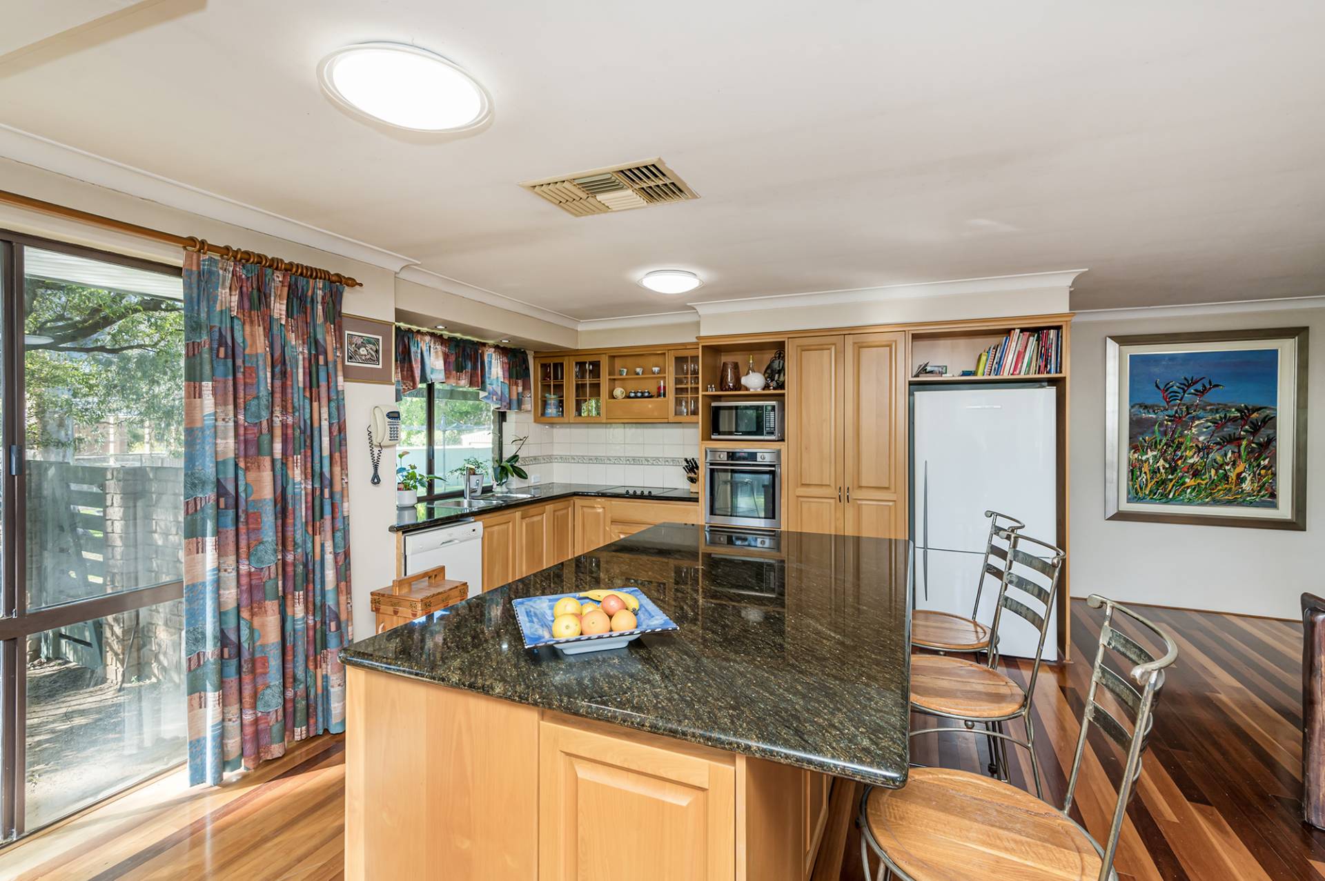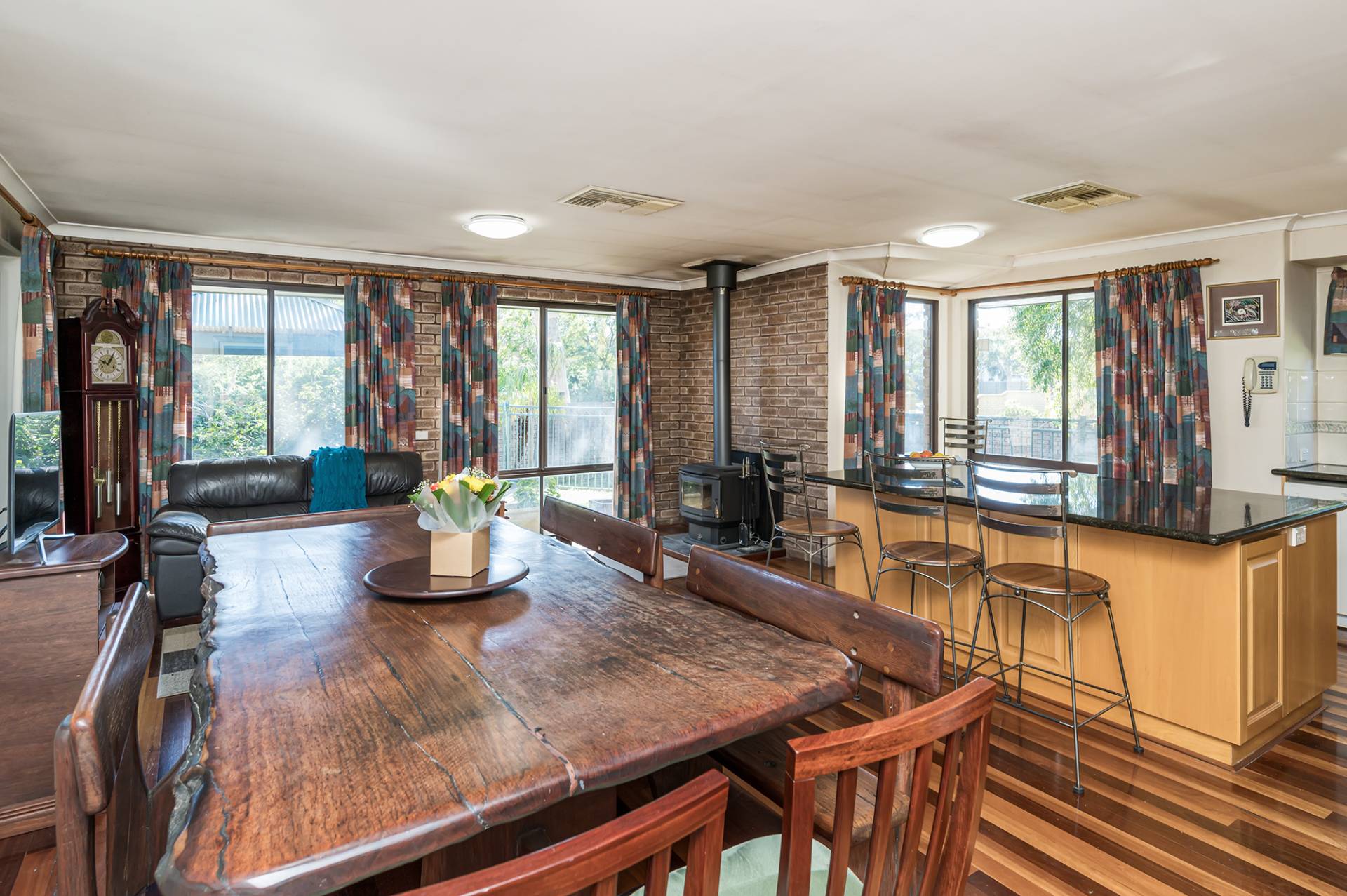 An open plan kitchen, living, and dining area is the central heart of the home, featuring the warmth of timber flooring and a cosy wood fireplace, while a separate lounge opens onto an inviting undercover alfresco, perfect for outdoor gatherings and entertaining. The well-laid-out kitchen provides space for two people to function simultaneously, and boasts granite benchtops, solid steamed beech cupboard doors and drawer fronts, ample storage, and modern appliances including a dishwasher, electric hotplates, and oven, all centered around a spacious island bench.