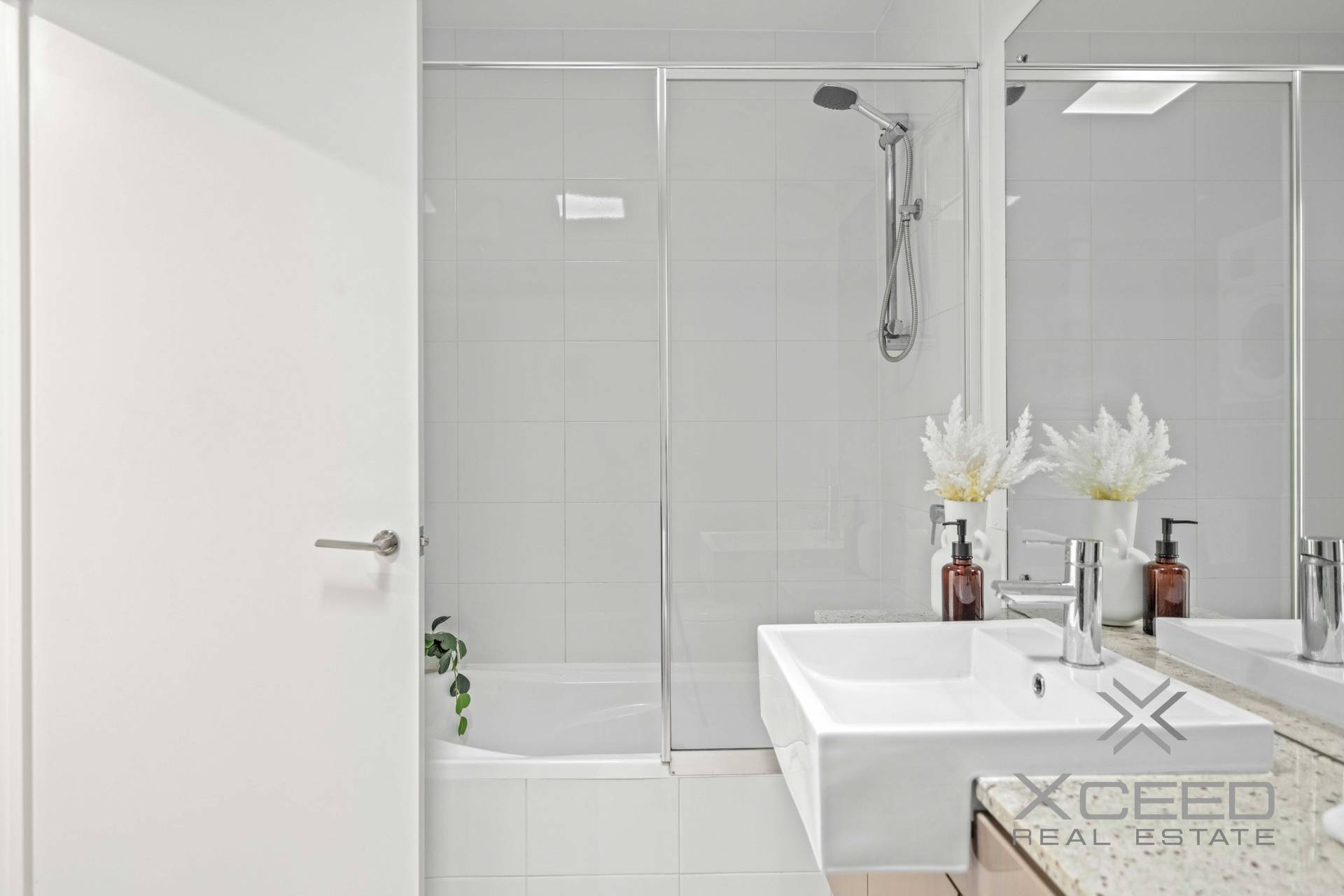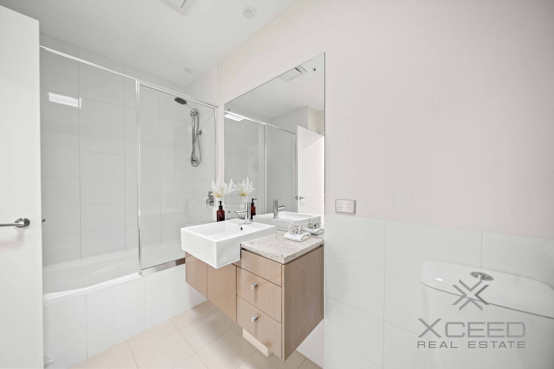 The master bedroom is a private retreat with an ensuite and mirrored built-in wardrobes, offering both style and functionality. The second bedroom is equally inviting, fully furnished with built-in wardrobes and easy access to the main bathroom, which features a bathtub and 1m high tiling for a touch of elegance.
