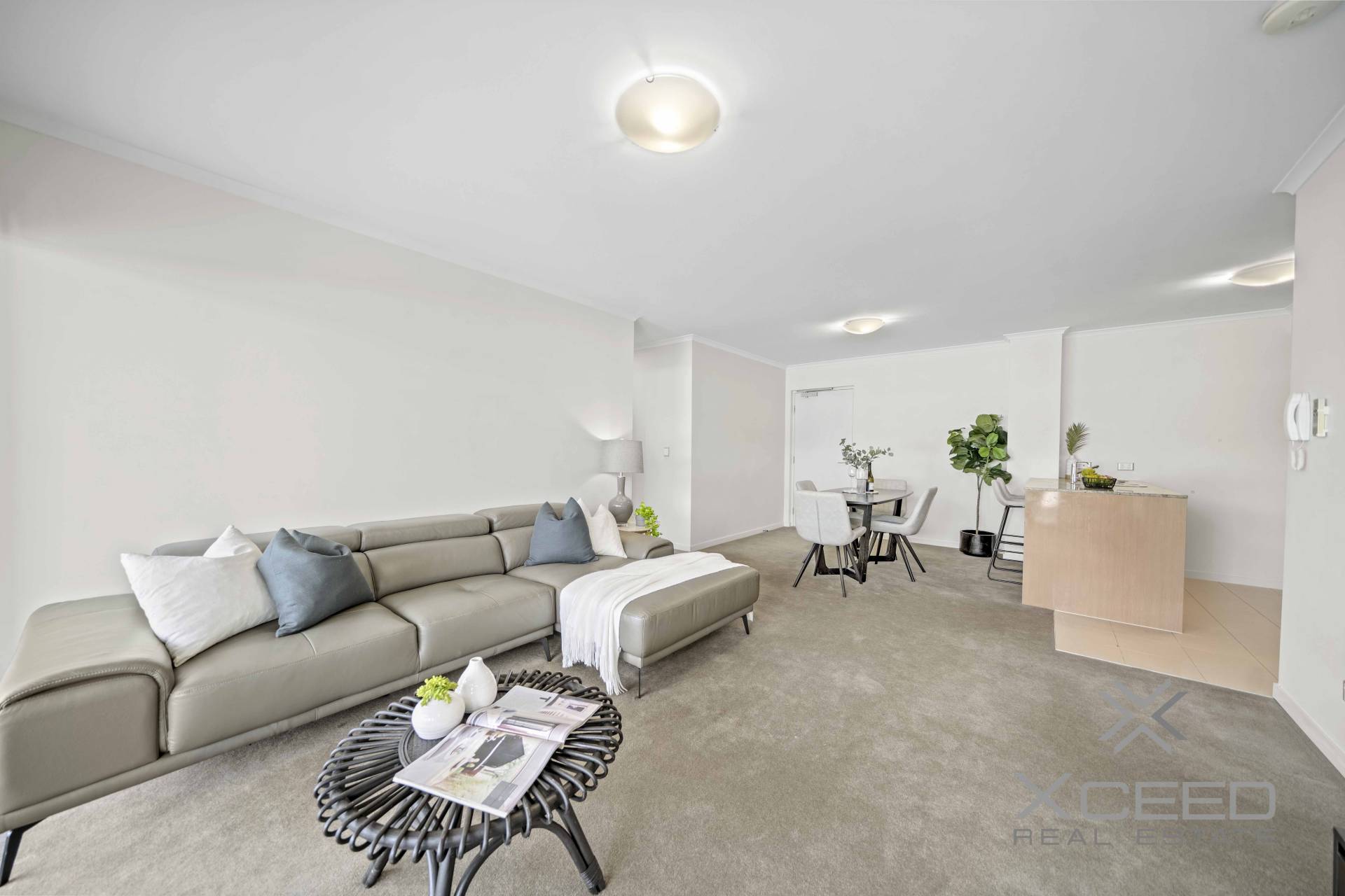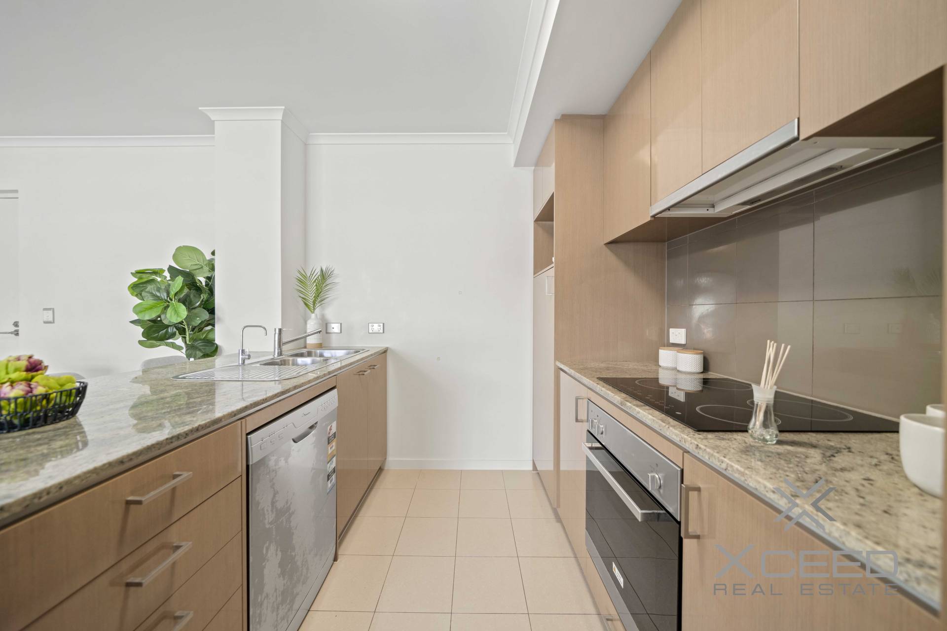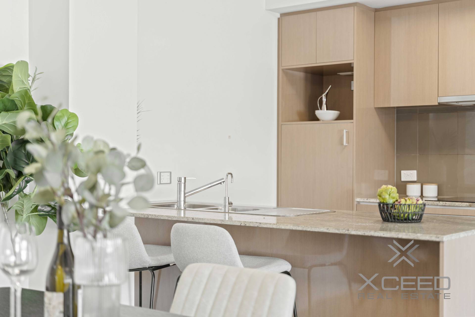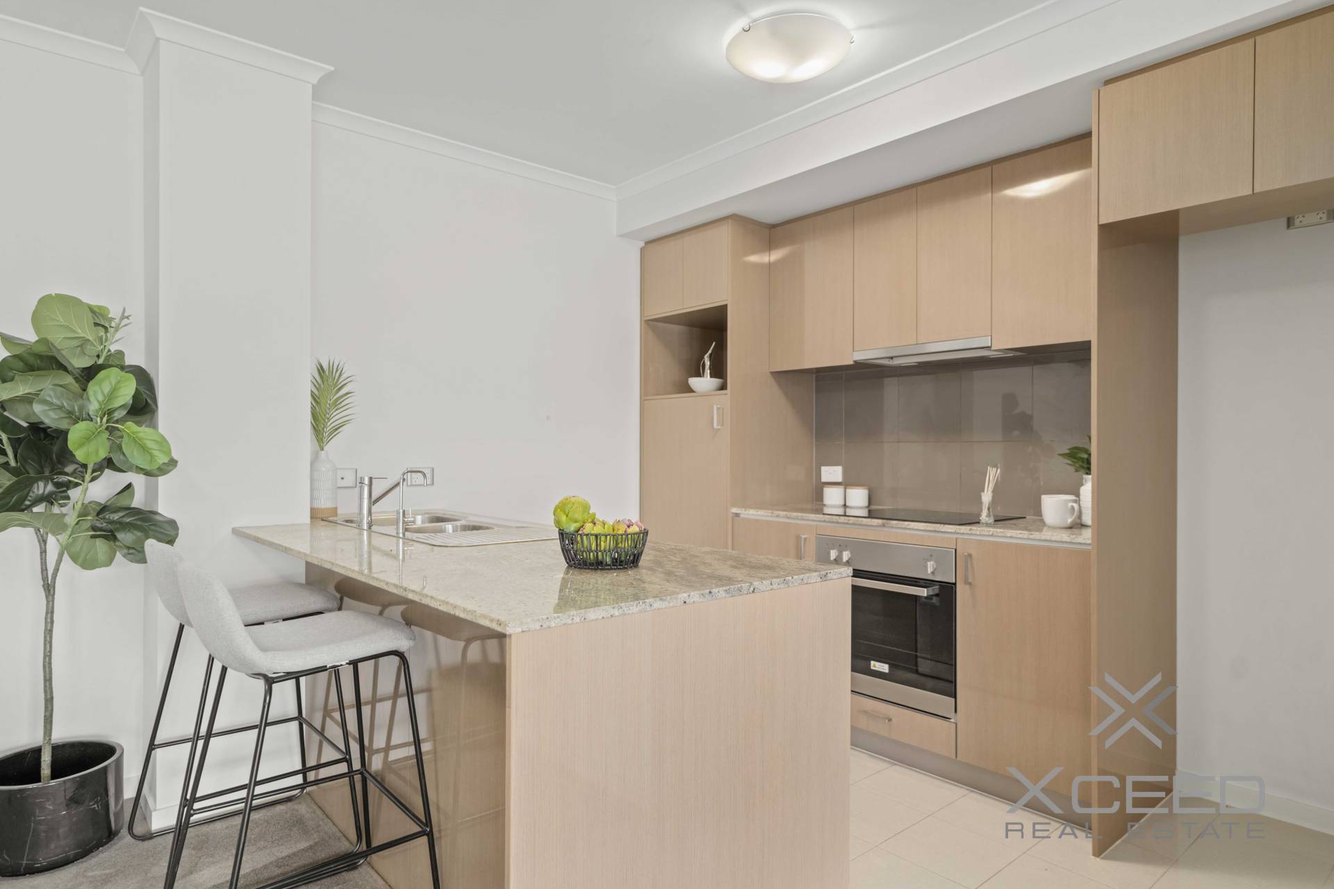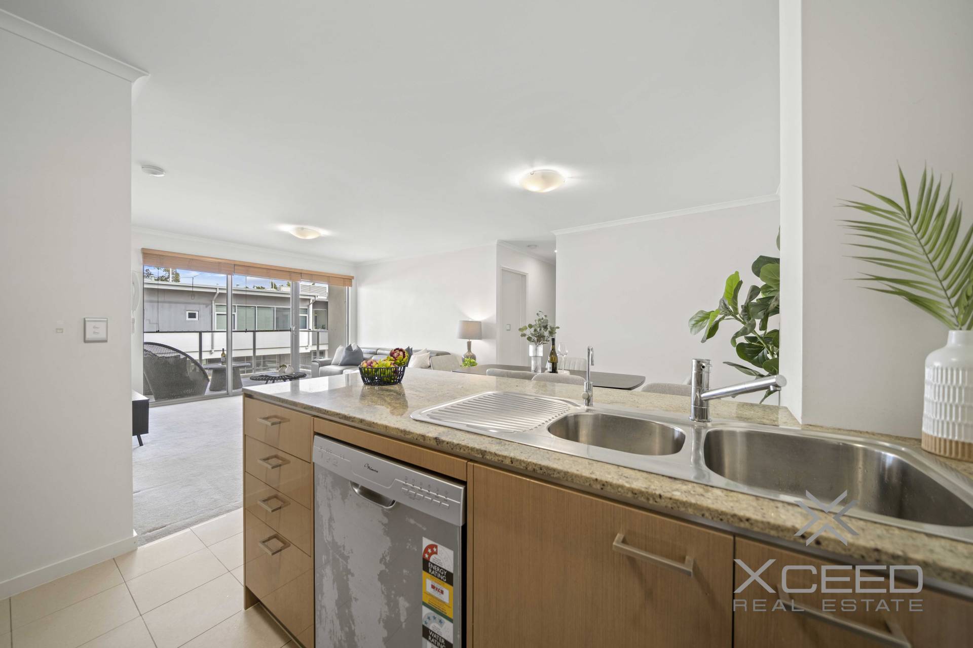 Step inside and be greeted by a beautifully designed open-plan living space, where high ceilings and quality window treatments create an atmosphere of luxury and comfort. The chef's kitchen, featuring stone benchtops and stainless steel appliances, is perfect for preparing gourmet meals while staying connected with family and friends. The living area flows effortlessly onto a large, tiled balcony, ideal for year-round entertainment and relaxation.