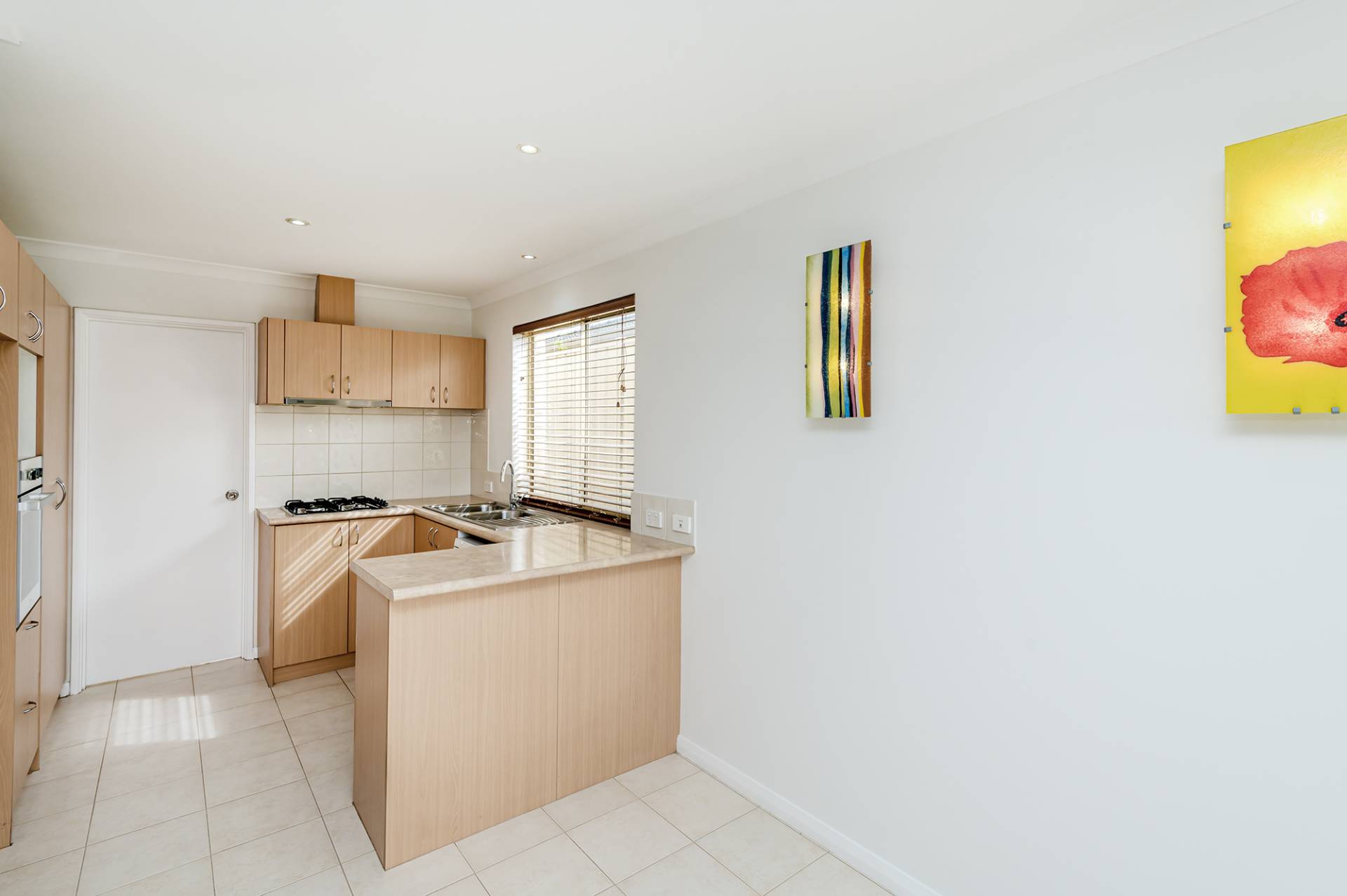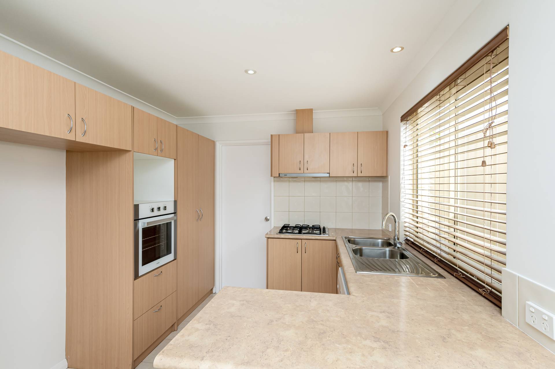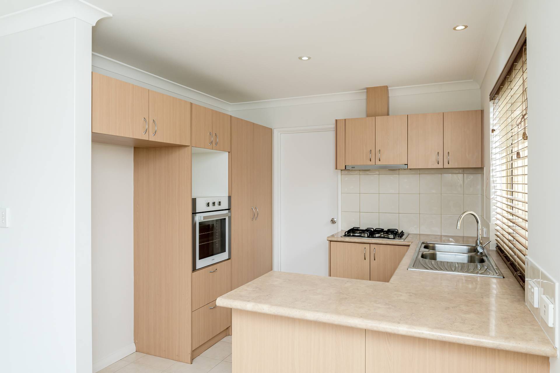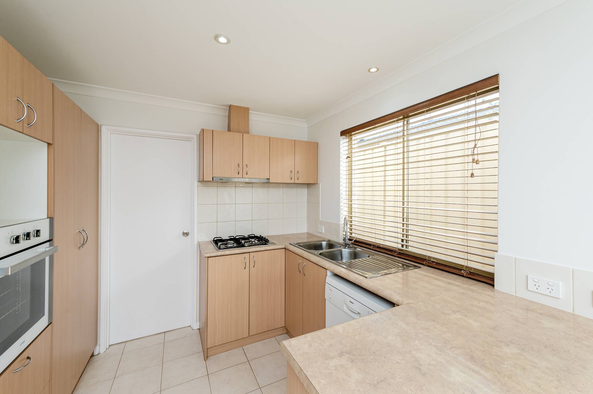 Compact and well-appointed kitchen with timber cabinetry, overhead cupboards, double sink, pantry, built-in oven, dishwasher