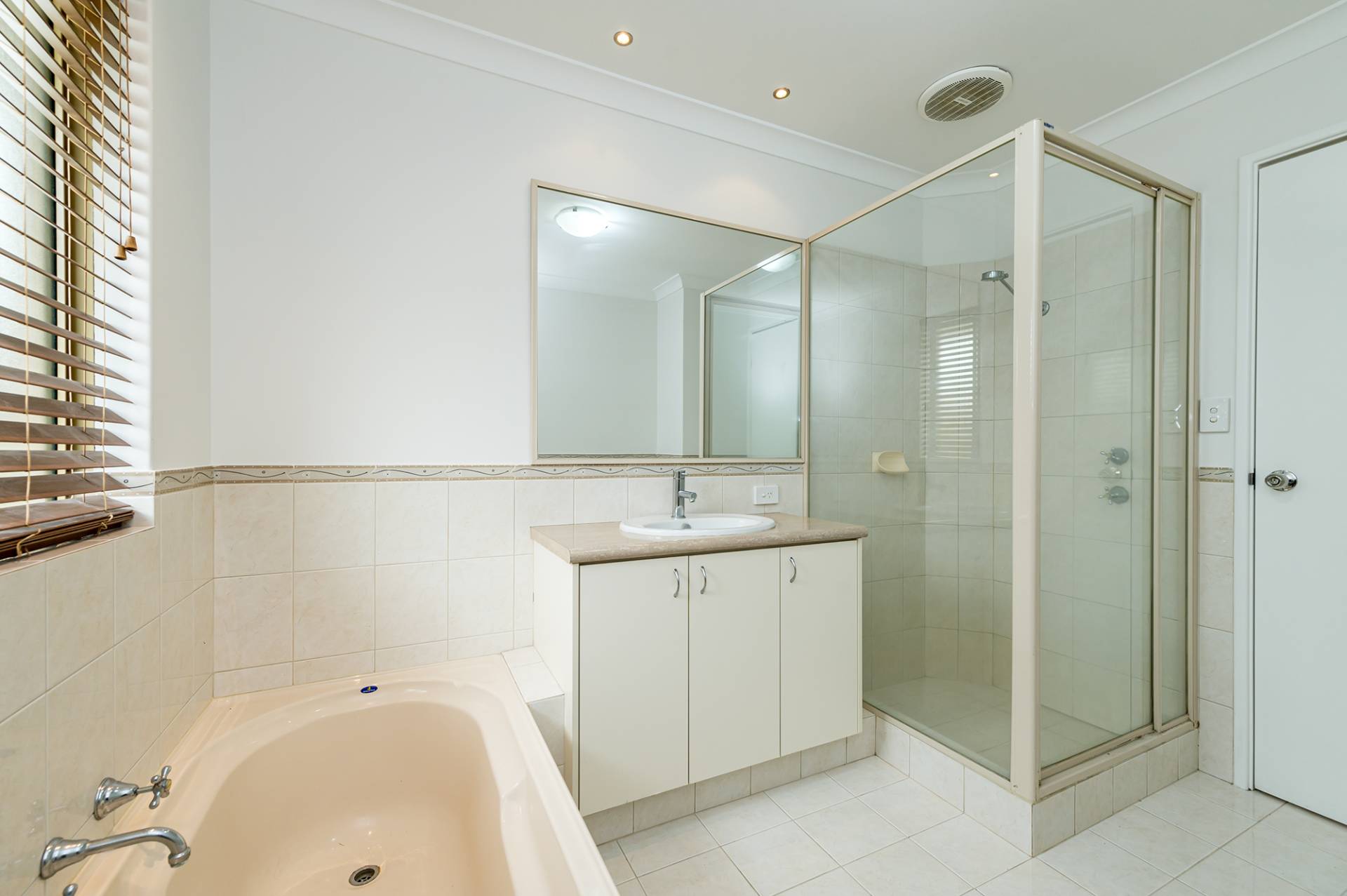 Bathroom features glass shower screen, a bath