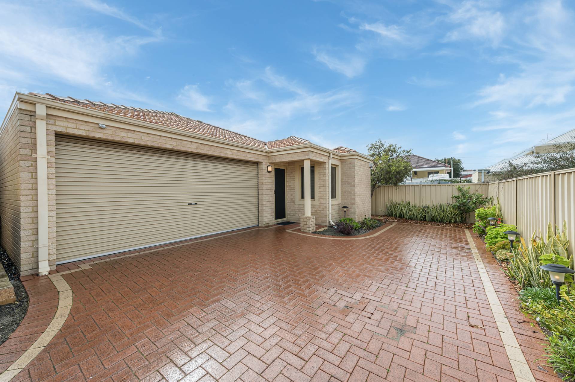 Paved alfresco area with high fence, established garden beds, outdoor lights, and pond