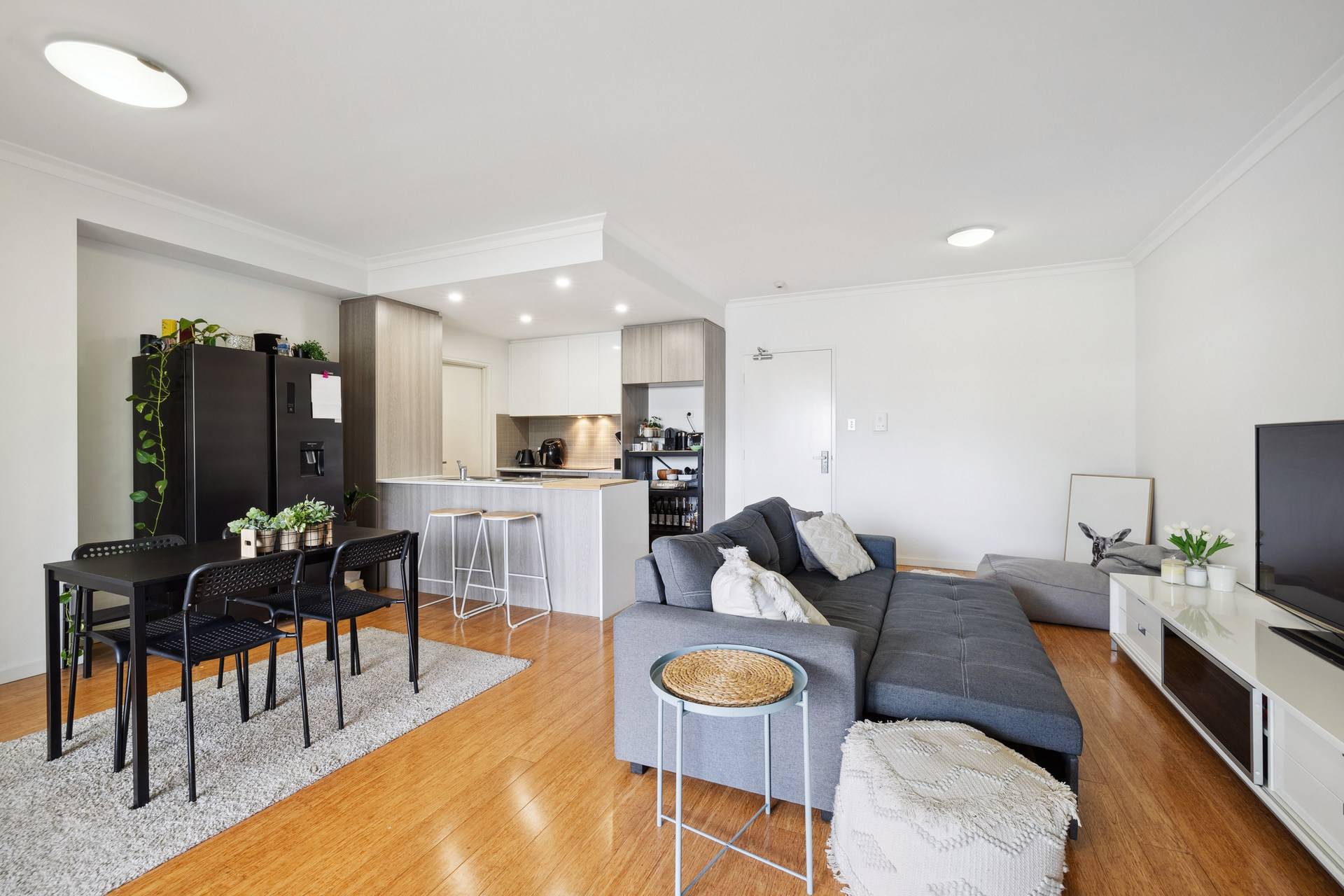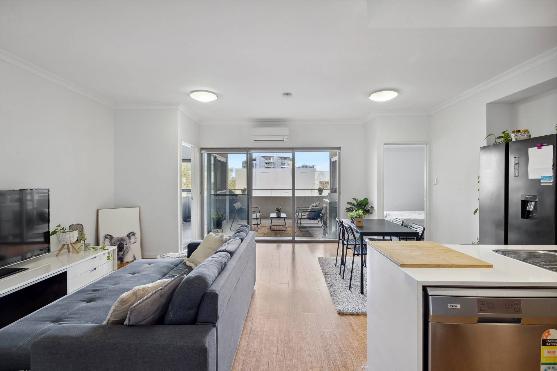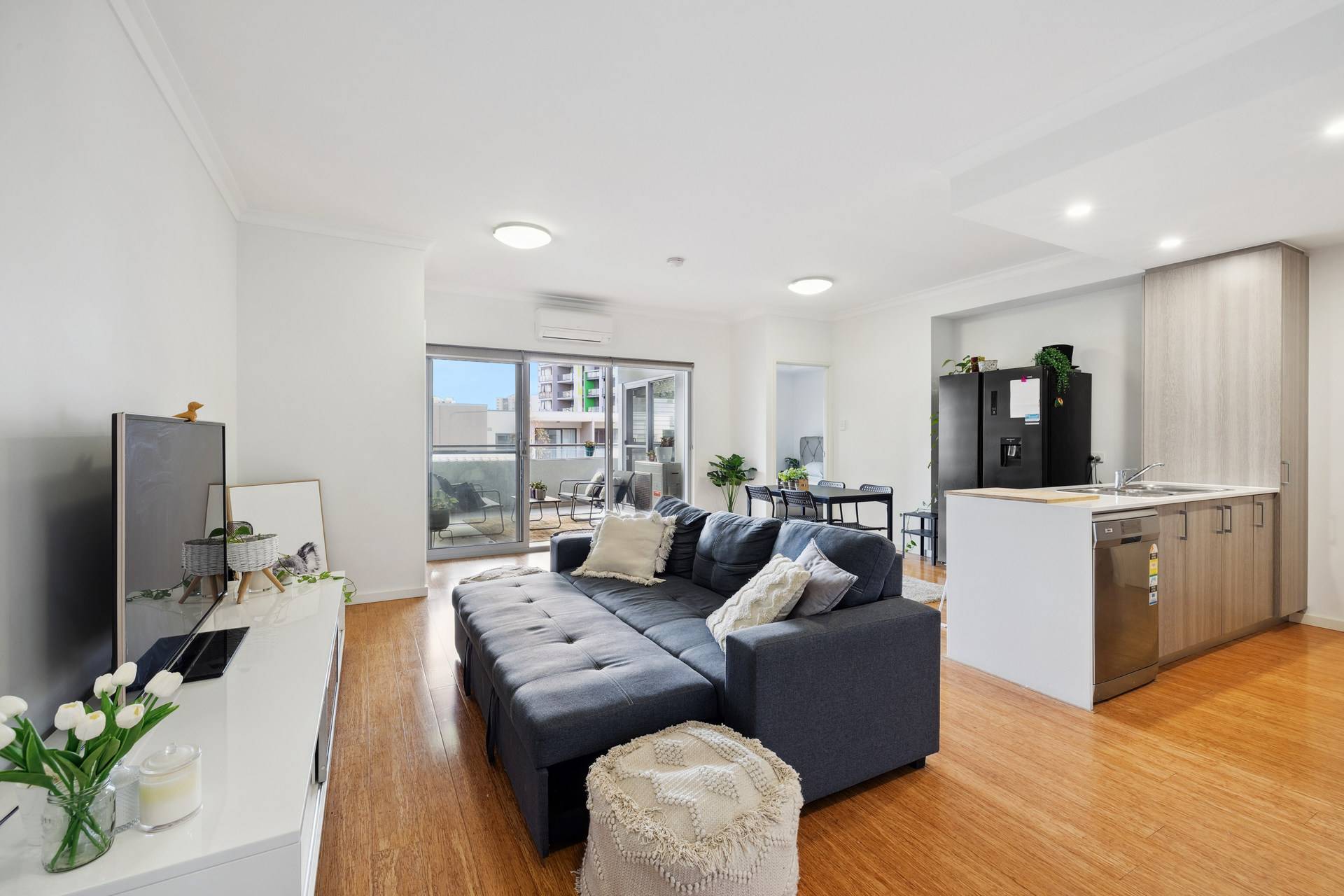 As you enter, you are greeted by a bright and airy space where natural sunlight floods through large windows, illuminating the open-plan living area. The modern kitchen, equipped with stone-top benches, a dishwasher, and sleek cabinetry, seamlessly flows into the generous living and dining space. Timber floorboards add a touch of elegance, while LED light fittings provide a warm ambiance throughout. Step out onto the spacious balcony, an ideal spot for your morning coffee or evening wind-down, where you can enjoy the fresh air and the vibrant atmosphere around you.