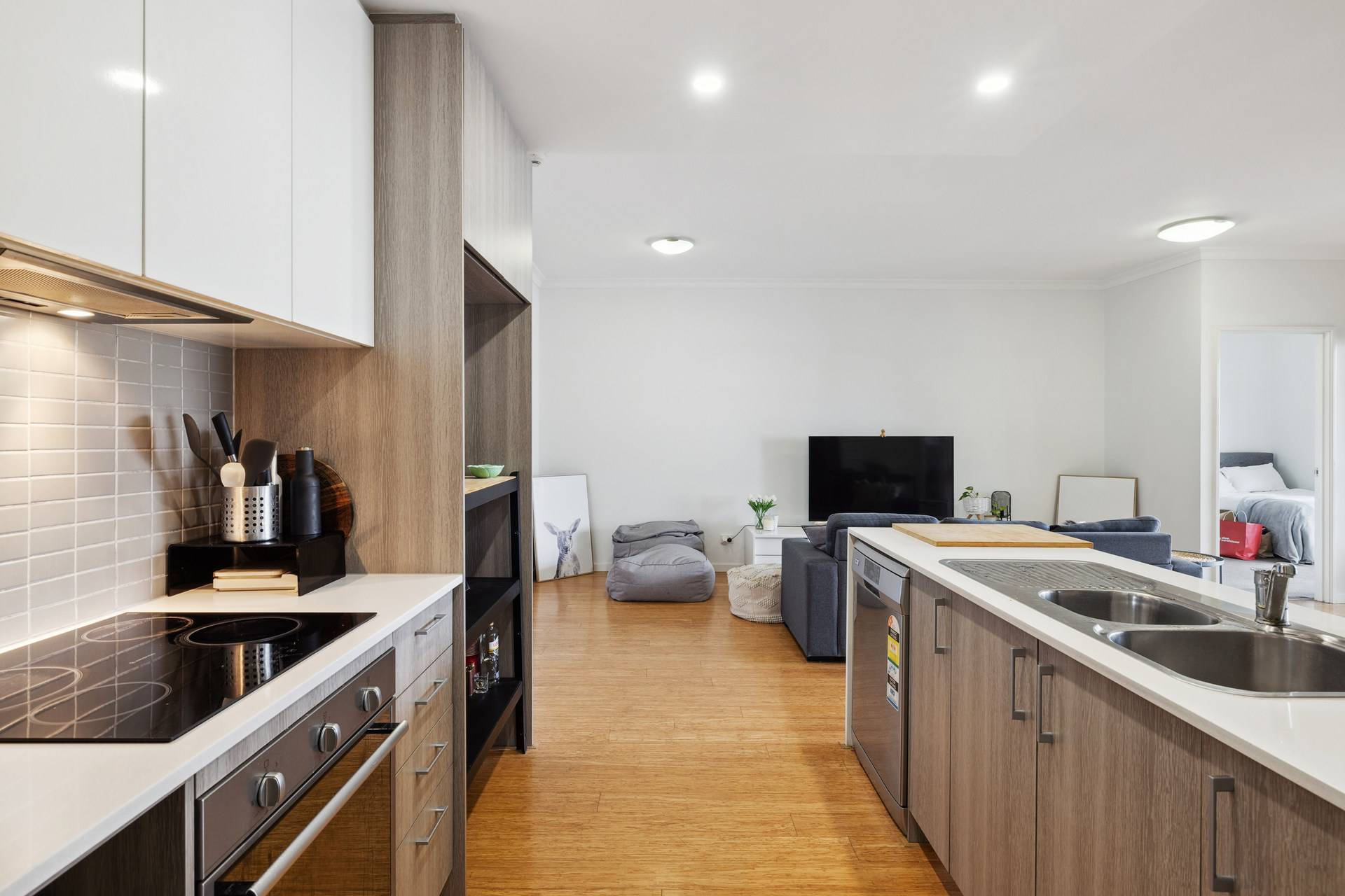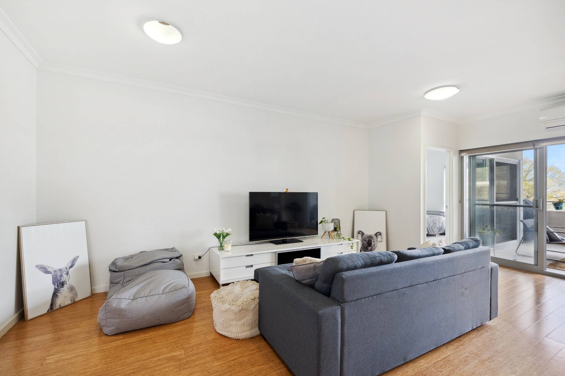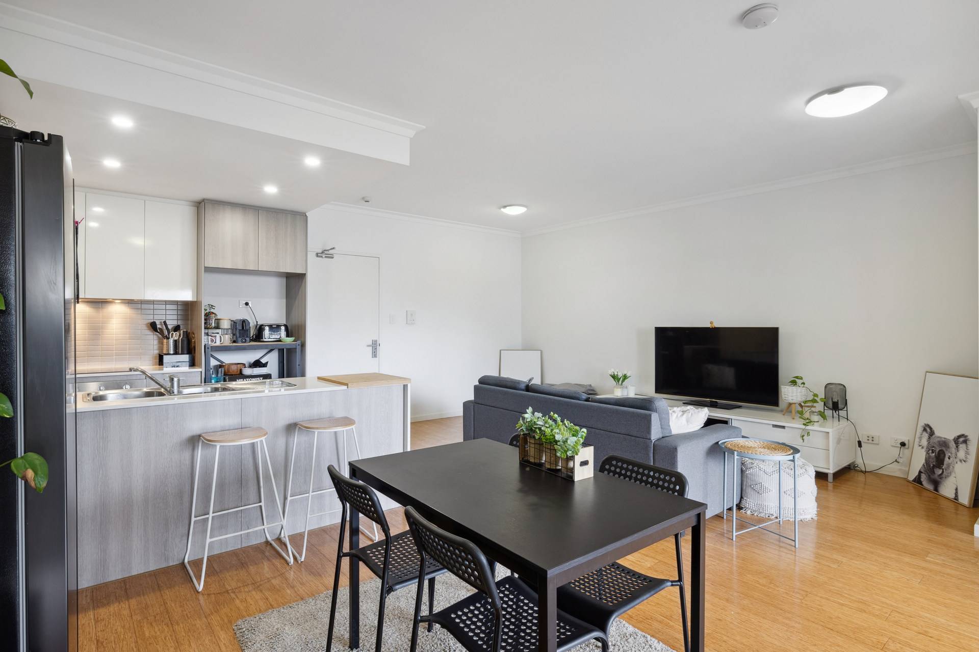As you enter, you are greeted by a bright and airy space where natural sunlight floods through large windows, illuminating the open-plan living area. The modern kitchen, equipped with stone-top benches, a dishwasher, and sleek cabinetry, seamlessly flows into the generous living and dining space. Timber floorboards add a touch of elegance, while LED light fittings provide a warm ambiance throughout. Step out onto the spacious balcony, an ideal spot for your morning coffee or evening wind-down, where you can enjoy the fresh air and the vibrant atmosphere around you.