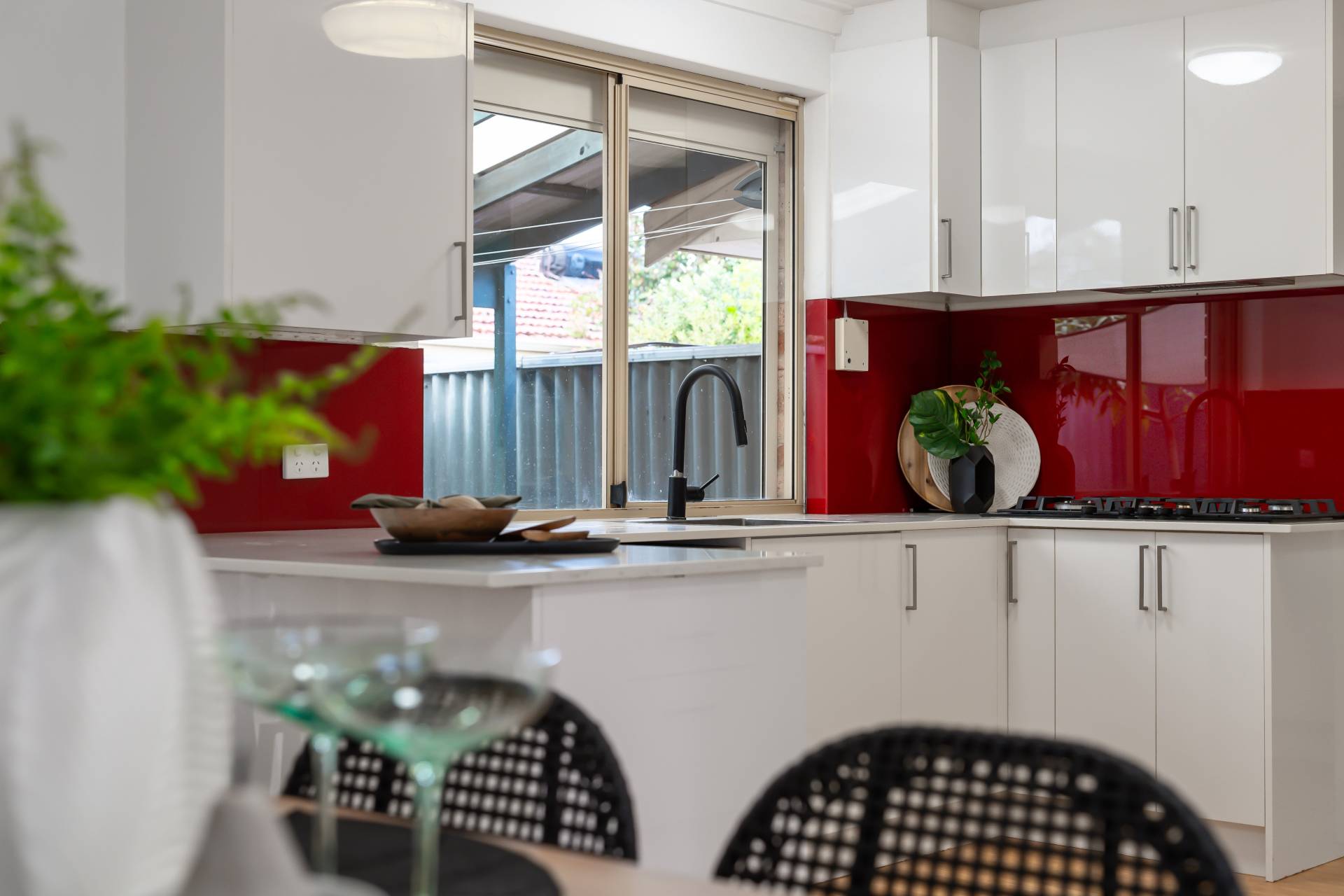 • Renovated kitchen with dishwasher, benchtops, roller shutter windows, glass splash backs, a good-sized sink, plenty of overhead cupboards, a stove, oven, and a spacious fridge recess