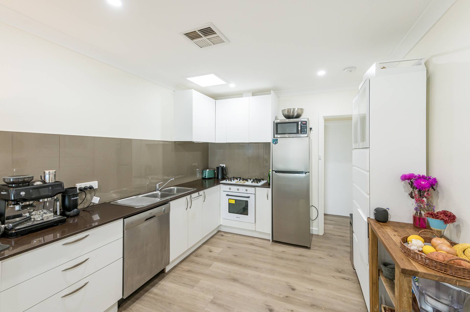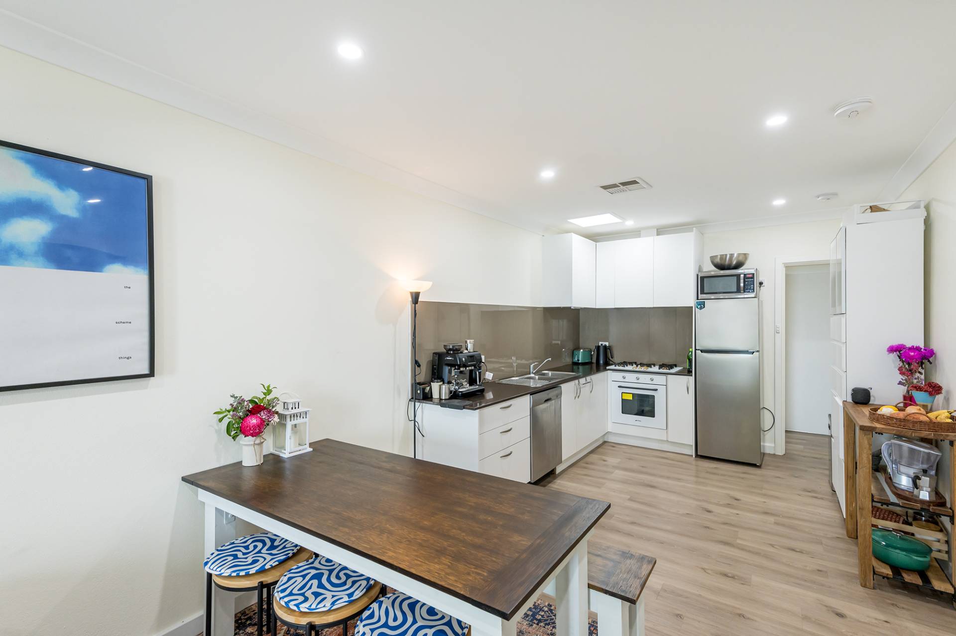 As you enter, you're greeted by the open plan layout, offering ample space for relaxation and entertaining. The modern kitchen is designed with functionality in mind, boasting plentiful counter space and storage options, ensuring every culinary tool and ingredient has its place. Whether you're a seasoned chef or just discovering your passion for cooking, this kitchen will inspire your inner gourmet.