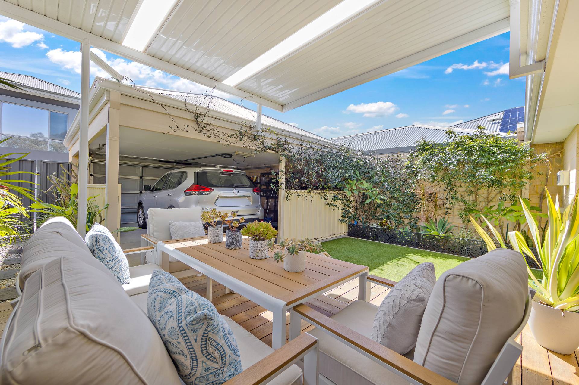 • Decked undercover patio, with garden beds and artificial lawn