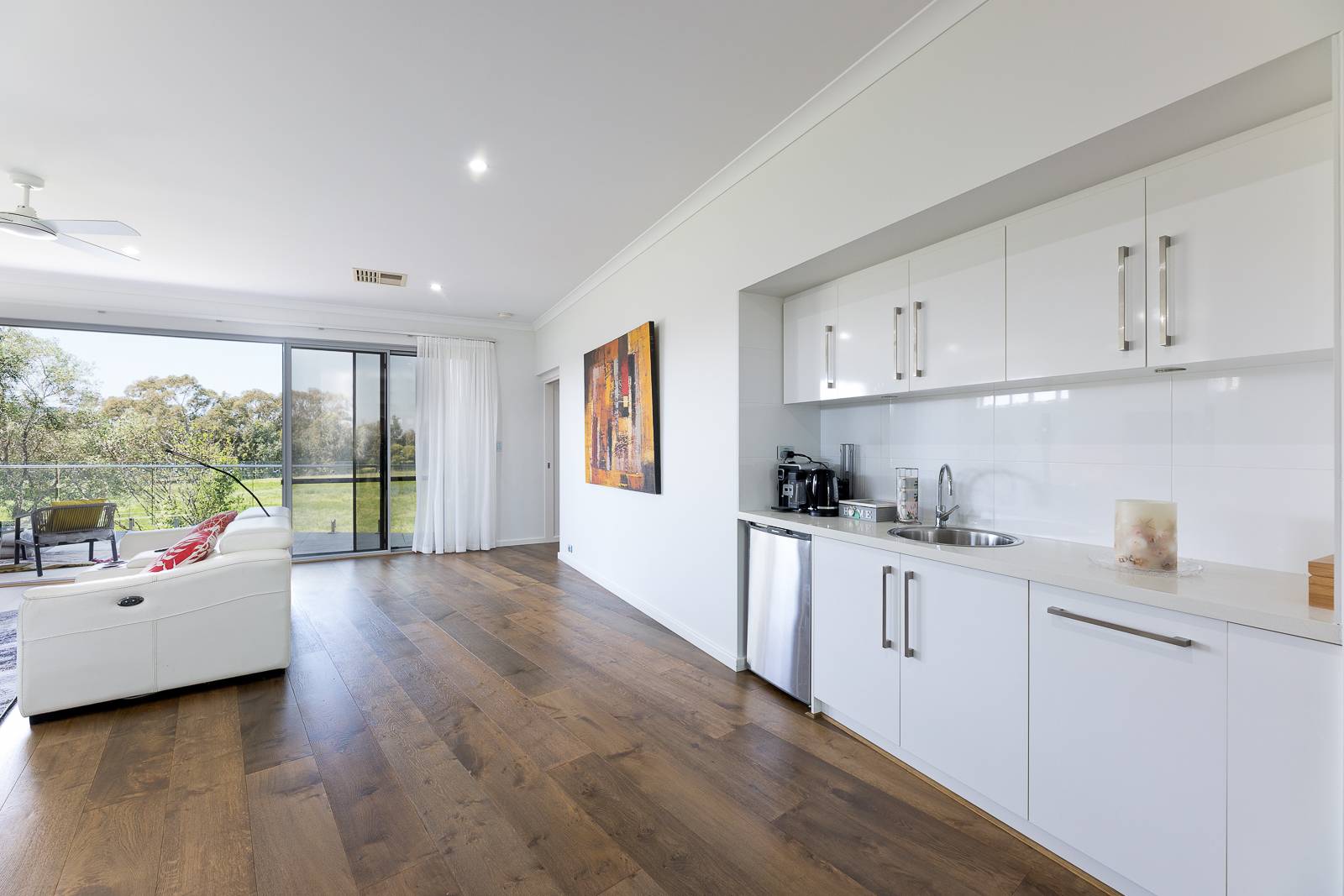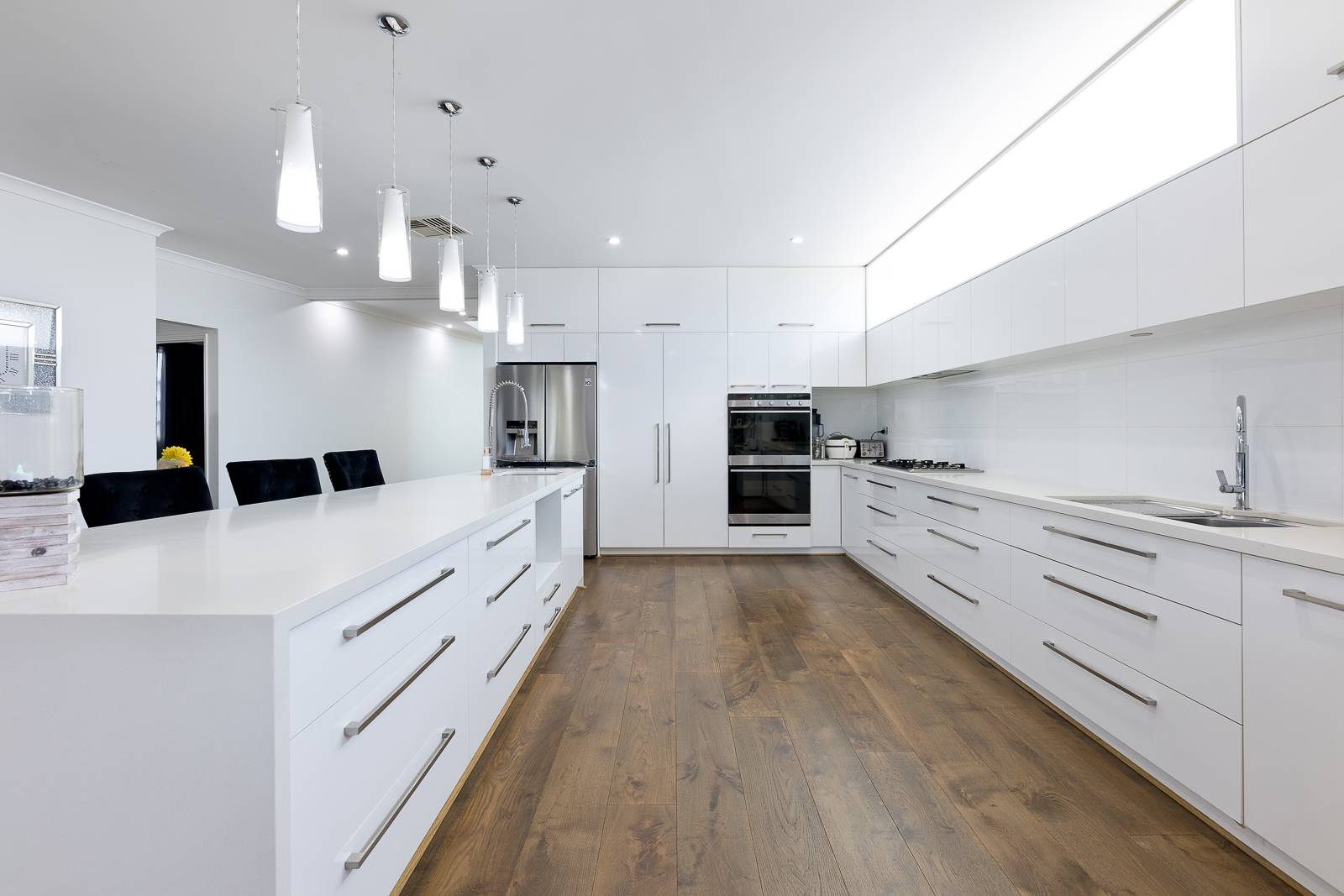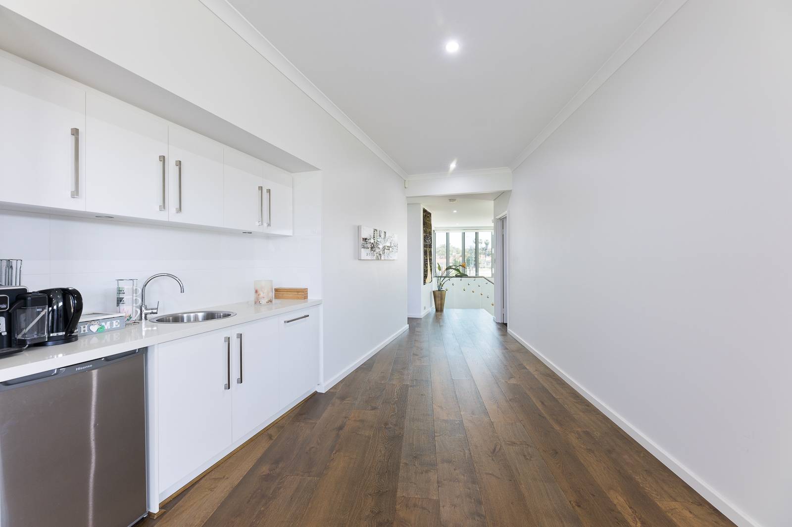 • Gourmet kitchen: Prepare culinary delights in a modern kitchen boasting sparkling 40mm-thick stone benchtops, high-end tap fittings, double sinks, sleek white cabinetry, tiled splashbacks, and a double storage pantry.