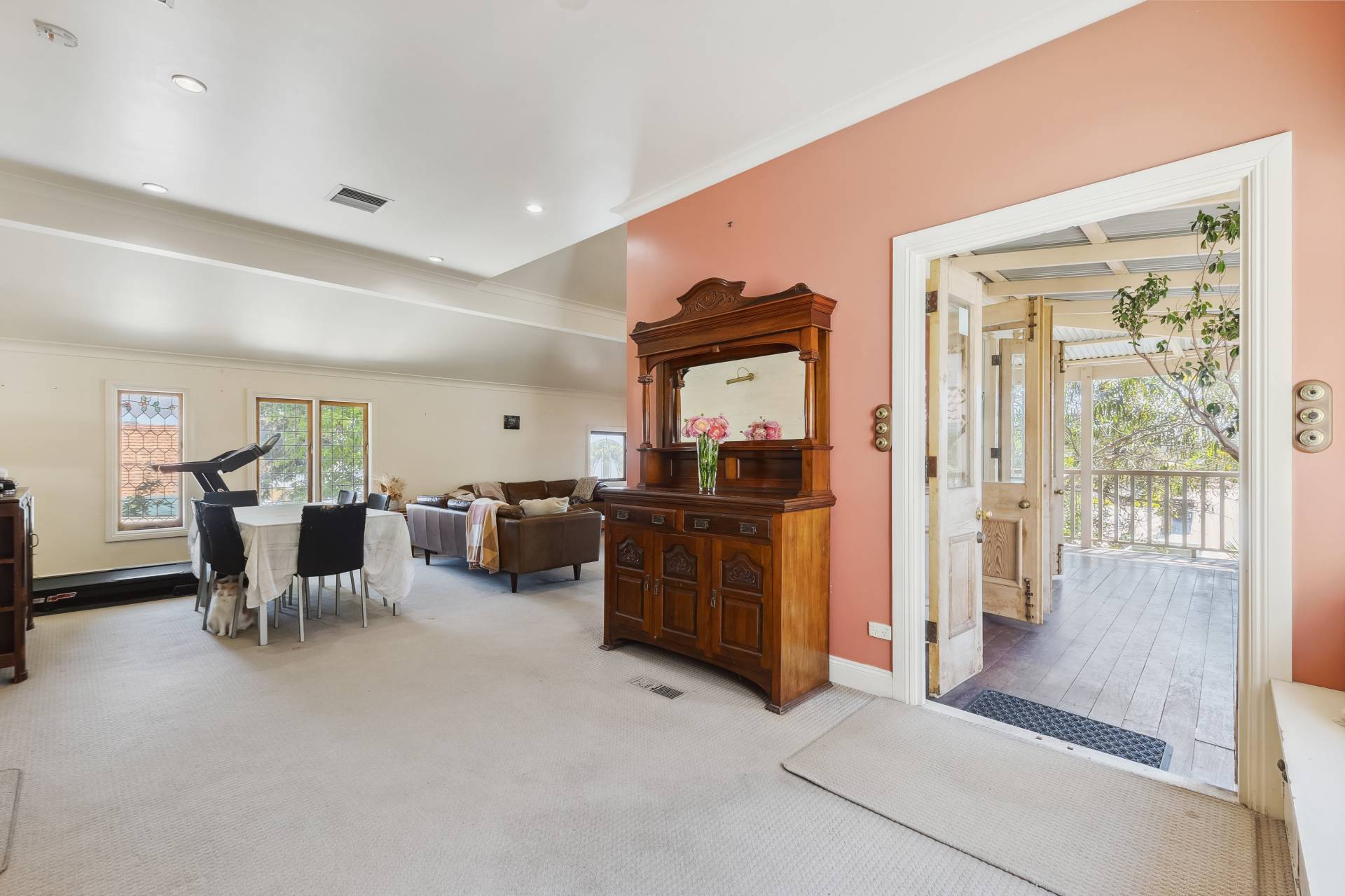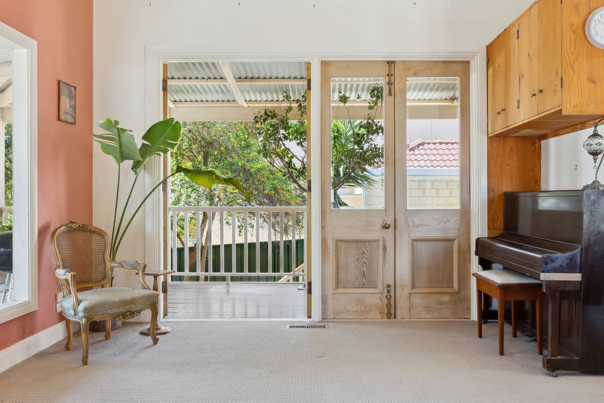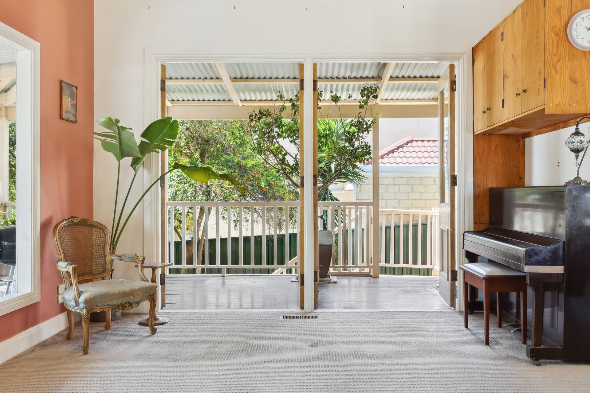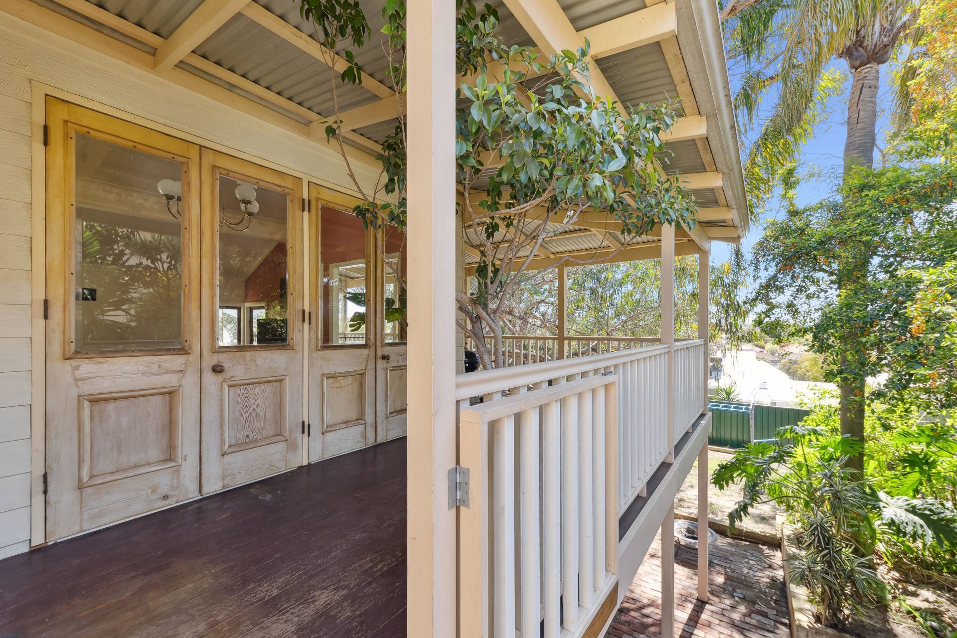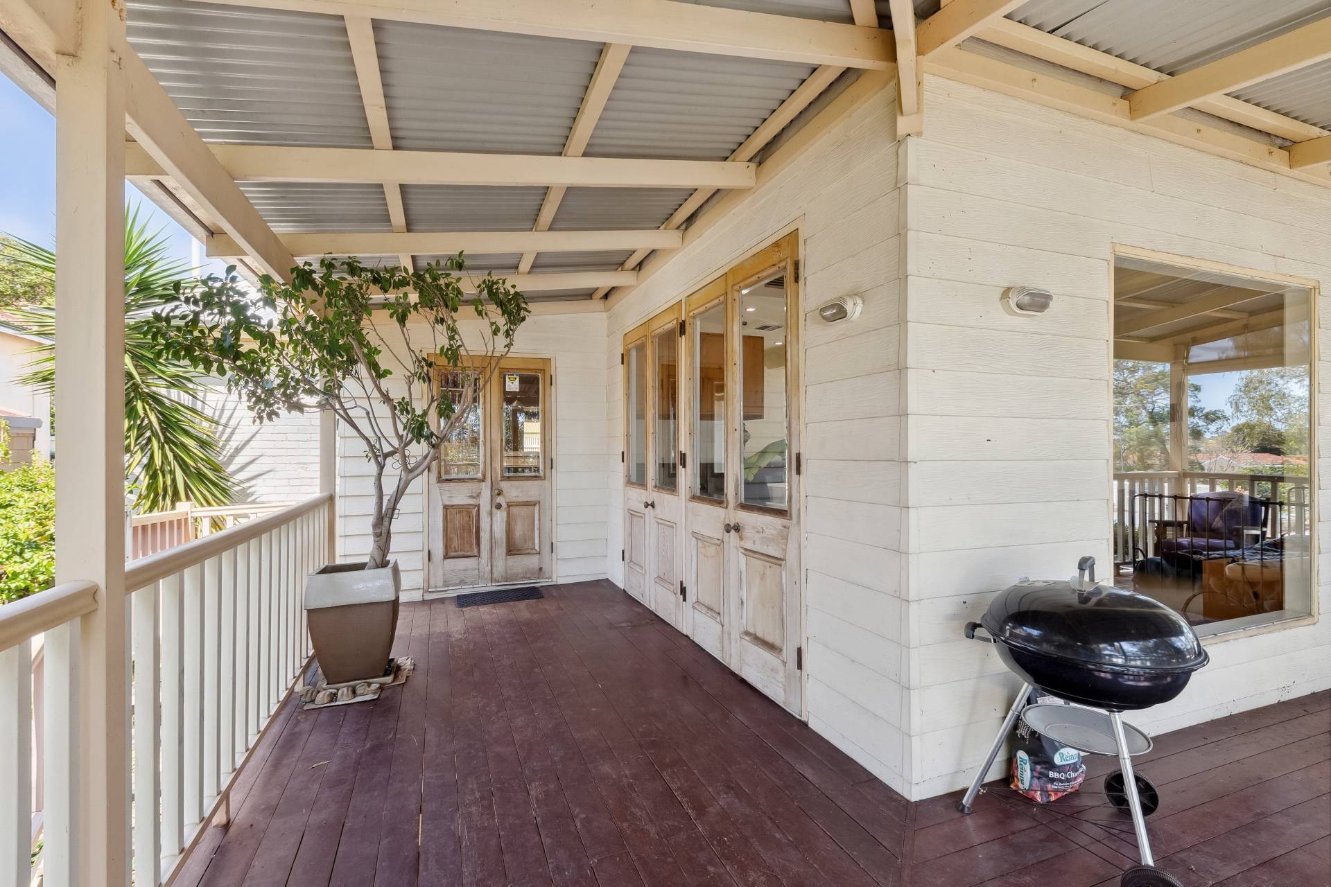 A standout feature of the home is the spacious open-plan family room extension, providing an expansive living area perfect for dining, entertaining, music, or simply relaxing. From here, a set of charming old Oregon French doors open onto the elevated rear covered balcony, which overlooks the shady backyard. The wooden-planked balcony, surrounded by trees, is an inviting space for outdoor dining or evening drinks with friends, offering a tranquil setting amidst nature.