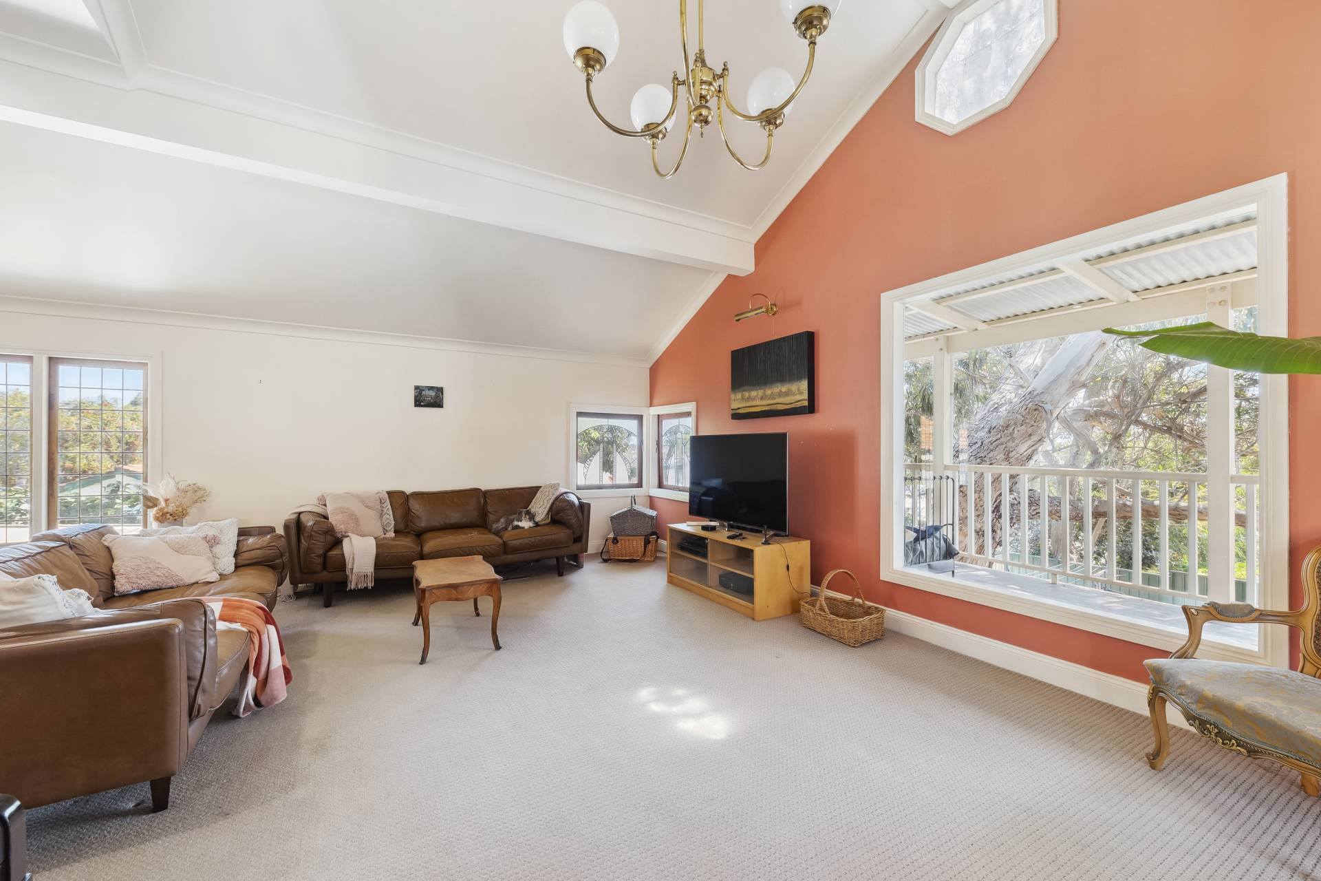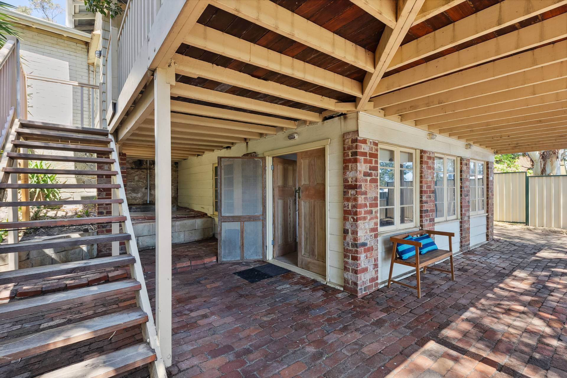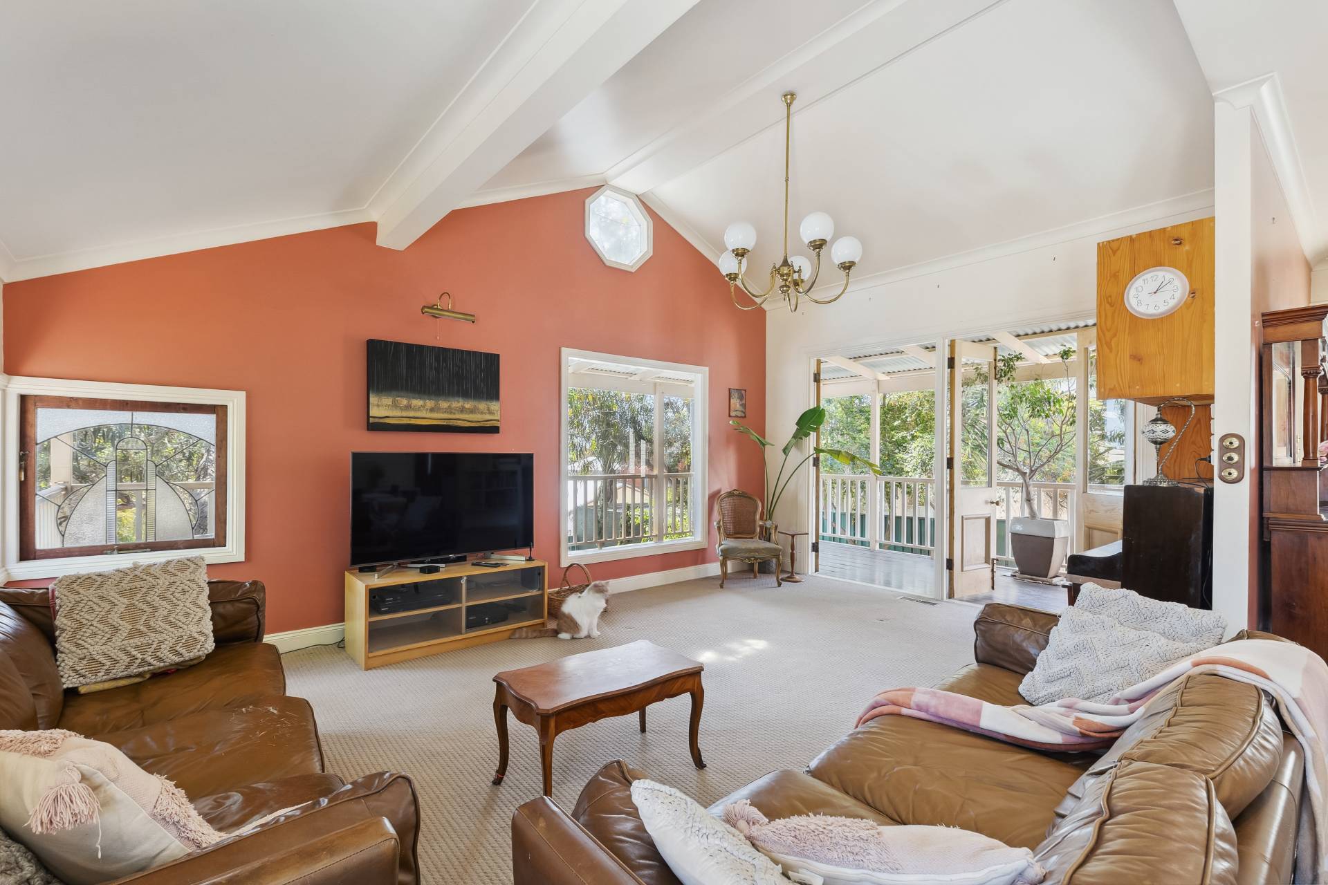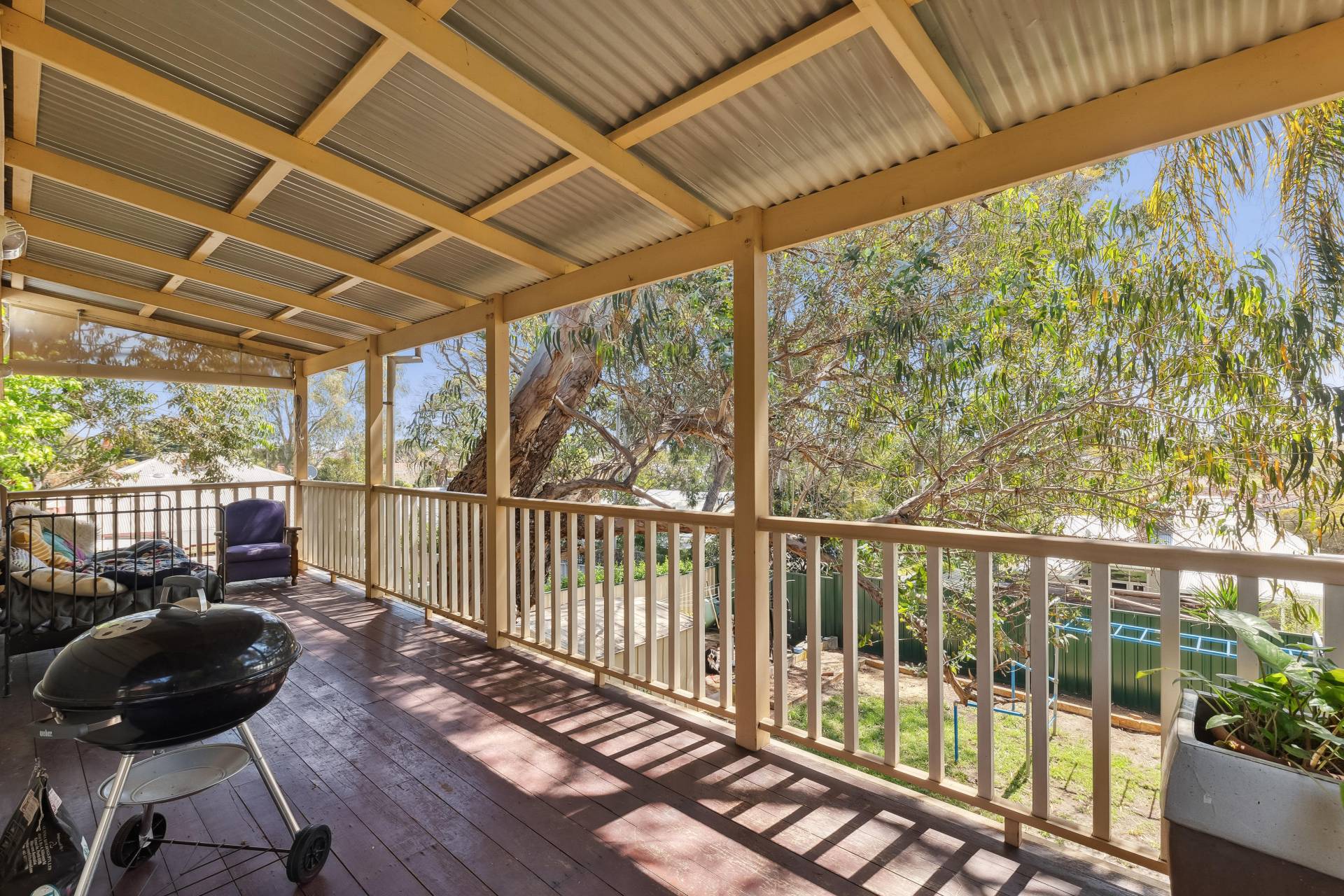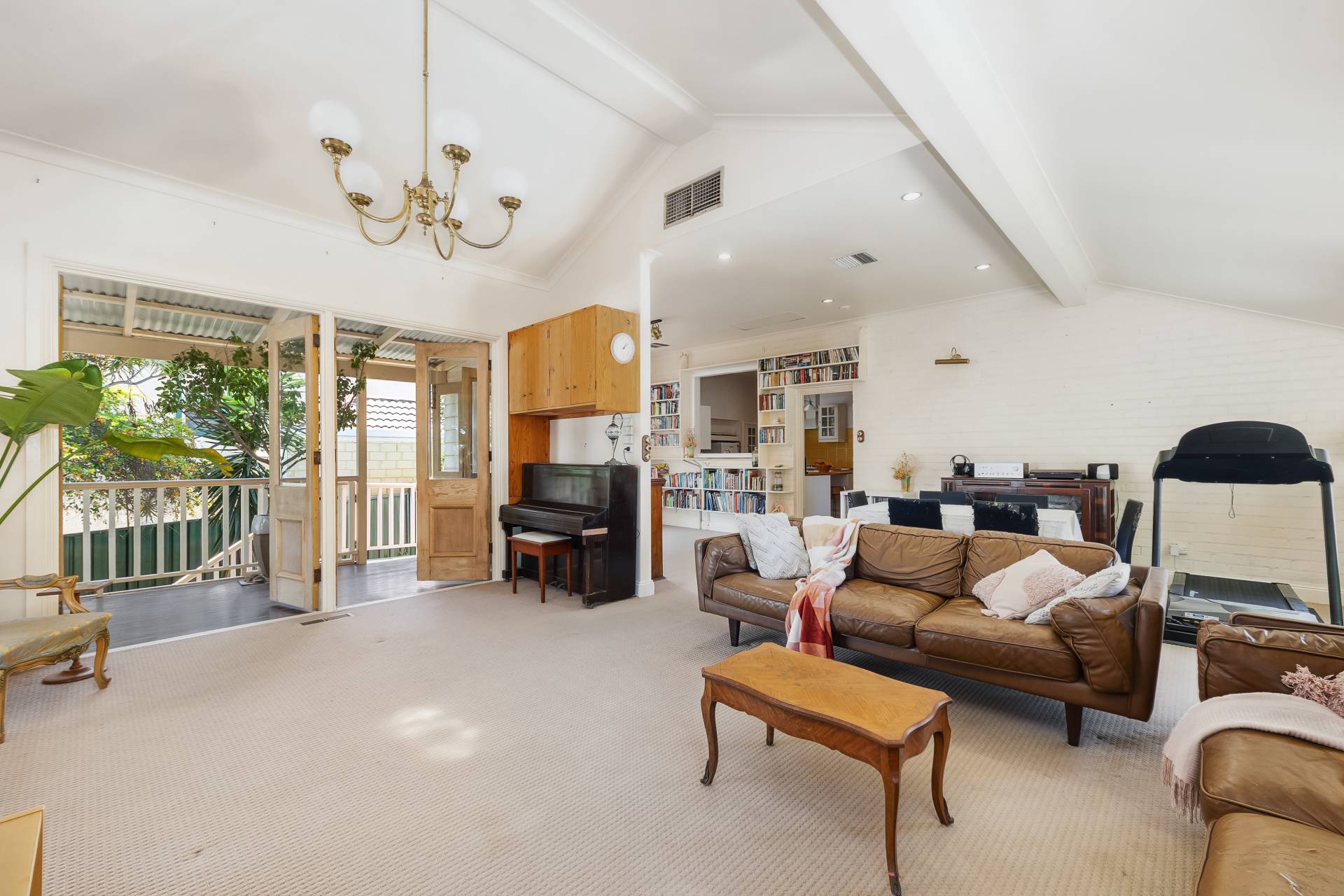 A standout feature of the home is the spacious open-plan family room extension, providing an expansive living area perfect for dining, entertaining, music, or simply relaxing. From here, a set of charming old Oregon French doors open onto the elevated rear covered balcony, which overlooks the shady backyard. The wooden-planked balcony, surrounded by trees, is an inviting space for outdoor dining or evening drinks with friends, offering a tranquil setting amidst nature.